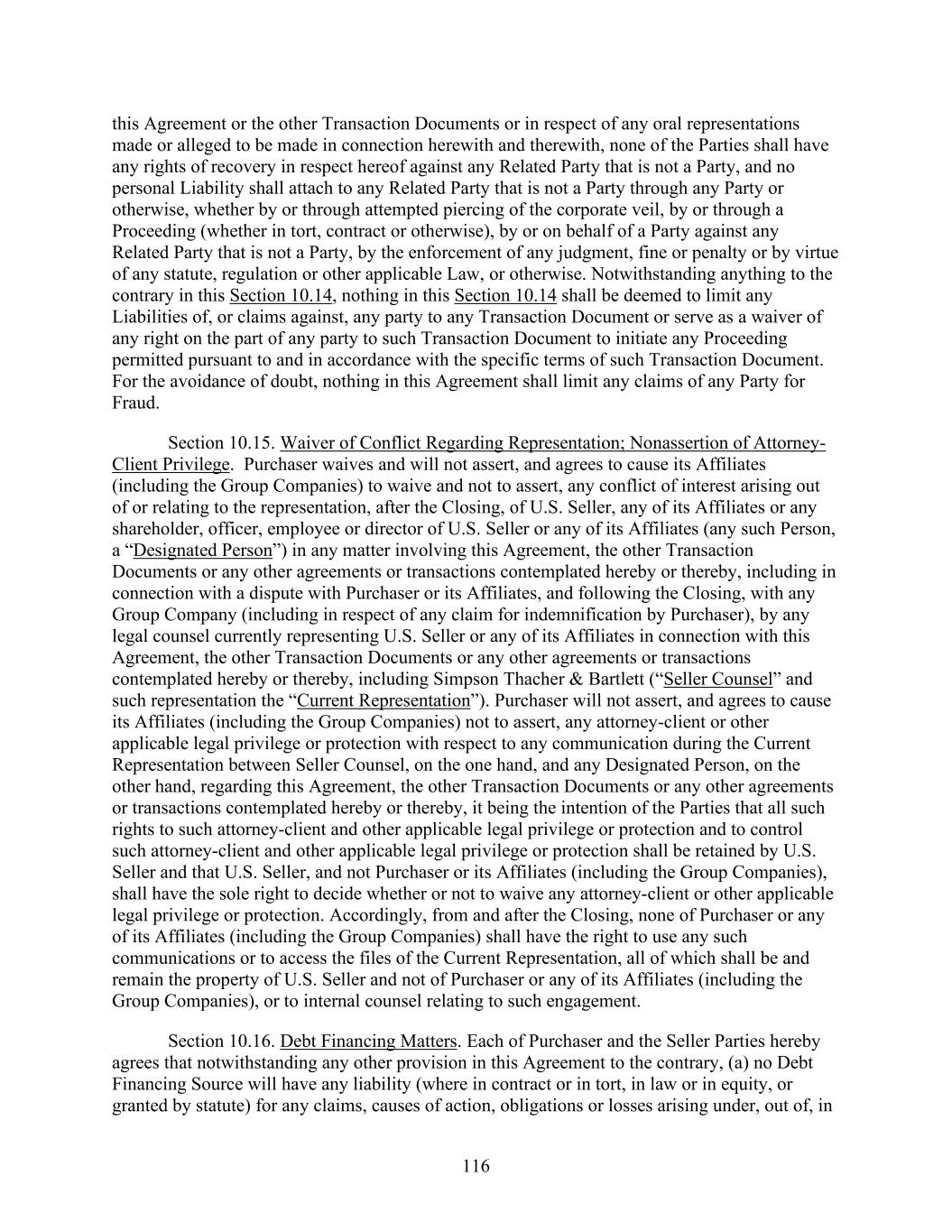 116 this Agreement or the other Transaction Documents or in respect of any oral representations made or alleged to be made in connection herewith and therewith, none of the Parties shall have any rights of recovery in respect hereof against any Related Party that is not a Party, and no personal Liability shall attach to any Related Party that is not a Party through any Party or otherwise, whether by or through attempted piercing of the corporate veil, by or through a Proceeding (whether in tort, contract or otherwise), by or on behalf of a Party against any Related Party that is not a Party, by the enforcement of any judgment, fine or penalty or by virtue of any statute, regulation or other applicable Law, or otherwise. Notwithstanding anything to the contrary in this Section 10.14, nothing in this Section 10.14 shall be deemed to limit any Liabilities of, or claims against, any party to any Transaction Document or serve as a waiver of any right on the part of any party to such Transaction Document to initiate any Proceeding permitted pursuant to and in accordance with the specific terms of such Transaction Document. For the avoidance of doubt, nothing in this Agreement shall limit any claims of any Party for Fraud. Section 10.15. Waiver of Conflict Regarding Representation; Nonassertion of Attorney- Client Privilege. Purchaser waives and will not assert, and agrees to cause its Affiliates (including the Group Companies) to waive and not to assert, any conflict of interest arising out of or relating to the representation, after the Closing, of U.S. Seller, any of its Affiliates or any shareholder, officer, employee or director of U.S. Seller or any of its Affiliates (any such Person, a “Designated Person”) in any matter involving this Agreement, the other Transaction Documents or any other agreements or transactions contemplated hereby or thereby, including in connection with a dispute with Purchaser or its Affiliates, and following the Closing, with any Group Company (including in respect of any claim for indemnification by Purchaser), by any legal counsel currently representing U.S. Seller or any of its Affiliates in connection with this Agreement, the other Transaction Documents or any other agreements or transactions contemplated hereby or thereby, including Simpson Thacher & Bartlett (“Seller Counsel” and such representation the “Current Representation”). Purchaser will not assert, and agrees to cause its Affiliates (including the Group Companies) not to assert, any attorney-client or other applicable legal privilege or protection with respect to any communication during the Current Representation between Seller Counsel, on the one hand, and any Designated Person, on the other hand, regarding this Agreement, the other Transaction Documents or any other agreements or transactions contemplated hereby or thereby, it being the intention of the Parties that all such rights to such attorney-client and other applicable legal privilege or protection and to control such attorney-client and other applicable legal privilege or protection shall be retained by U.S. Seller and that U.S. Seller, and not Purchaser or its Affiliates (including the Group Companies), shall have the sole right to decide whether or not to waive any attorney-client or other applicable legal privilege or protection. Accordingly, from and after the Closing, none of Purchaser or any of its Affiliates (including the Group Companies) shall have the right to use any such communications or to access the files of the Current Representation, all of which shall be and remain the property of U.S. Seller and not of Purchaser or any of its Affiliates (including the Group Companies), or to internal counsel relating to such engagement. Section 10.16. Debt Financing Matters. Each of Purchaser and the Seller Parties hereby agrees that notwithstanding any other provision in this Agreement to the contrary, (a) no Debt Financing Source will have any liability (where in contract or in tort, in law or in equity, or granted by statute) for any claims, causes of action, obligations or losses arising under, out of, in