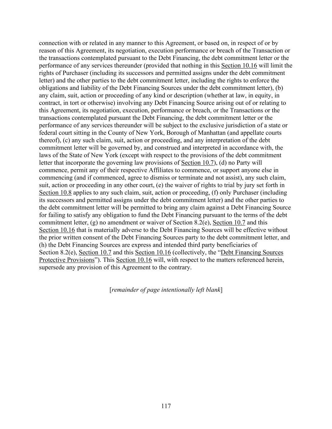 117 connection with or related in any manner to this Agreement, or based on, in respect of or by reason of this Agreement, its negotiation, execution performance or breach of the Transaction or the transactions contemplated pursuant to the Debt Financing, the debt commitment letter or the performance of any services thereunder (provided that nothing in this Section 10.16 will limit the rights of Purchaser (including its successors and permitted assigns under the debt commitment letter) and the other parties to the debt commitment letter, including the rights to enforce the obligations and liability of the Debt Financing Sources under the debt commitment letter), (b) any claim, suit, action or proceeding of any kind or description (whether at law, in equity, in contract, in tort or otherwise) involving any Debt Financing Source arising out of or relating to this Agreement, its negotiation, execution, performance or breach, or the Transactions or the transactions contemplated pursuant the Debt Financing, the debt commitment letter or the performance of any services thereunder will be subject to the exclusive jurisdiction of a state or federal court sitting in the County of New York, Borough of Manhattan (and appellate courts thereof), (c) any such claim, suit, action or proceeding, and any interpretation of the debt commitment letter will be governed by, and construed and interpreted in accordance with, the laws of the State of New York (except with respect to the provisions of the debt commitment letter that incorporate the governing law provisions of Section 10.7), (d) no Party will commence, permit any of their respective Affiliates to commence, or support anyone else in commencing (and if commenced, agree to dismiss or terminate and not assist), any such claim, suit, action or proceeding in any other court, (e) the waiver of rights to trial by jury set forth in Section 10.8 applies to any such claim, suit, action or proceeding, (f) only Purchaser (including its successors and permitted assigns under the debt commitment letter) and the other parties to the debt commitment letter will be permitted to bring any claim against a Debt Financing Source for failing to satisfy any obligation to fund the Debt Financing pursuant to the terms of the debt commitment letter, (g) no amendment or waiver of Section 8.2(e), Section 10.7 and this Section 10.16 that is materially adverse to the Debt Financing Sources will be effective without the prior written consent of the Debt Financing Sources party to the debt commitment letter, and (h) the Debt Financing Sources are express and intended third party beneficiaries of Section 8.2(e), Section 10.7 and this Section 10.16 (collectively, the “Debt Financing Sources Protective Provisions”). This Section 10.16 will, with respect to the matters referenced herein, supersede any provision of this Agreement to the contrary. [remainder of page intentionally left blank]