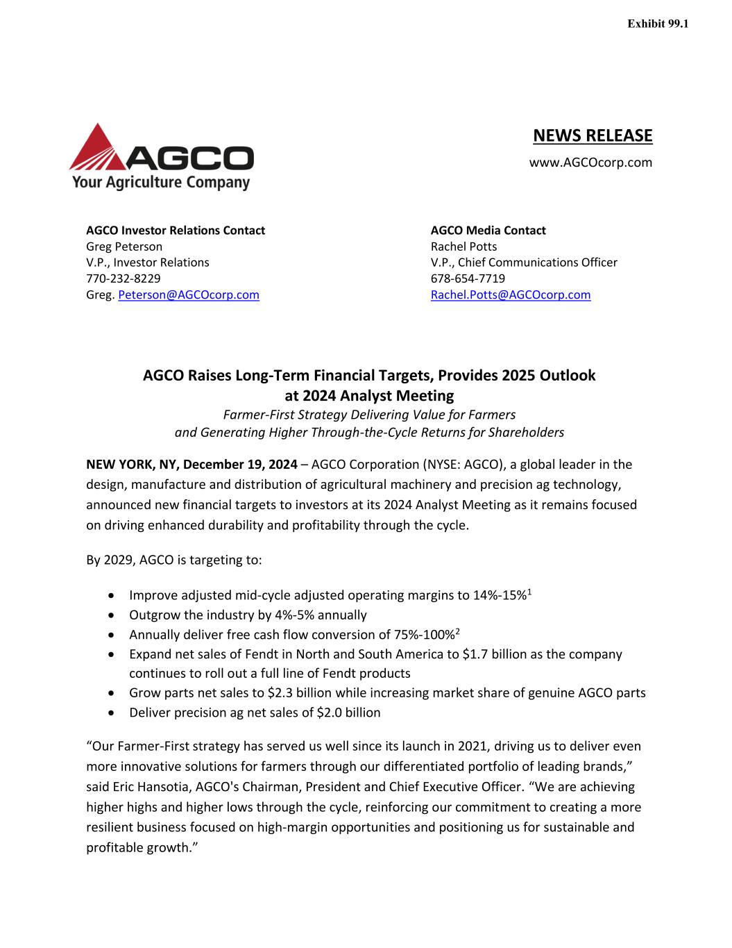 NEWS RELEASE www.AGCOcorp.com AGCO Investor Relations Contact AGCO Media Contact Greg Peterson Rachel Potts V.P., Investor Relations V.P., Chief Communications Officer 770-232-8229 678-654-7719 Greg. Peterson@AGCOcorp.com Rachel.Potts@AGCOcorp.com AGCO Raises Long-Term Financial Targets, Provides 2025 Outlook at 2024 Analyst Meeting Farmer-First Strategy Delivering Value for Farmers and Generating Higher Through-the-Cycle Returns for Shareholders NEW YORK, NY, December 19, 2024 – AGCO Corporation (NYSE: AGCO), a global leader in the design, manufacture and distribution of agricultural machinery and precision ag technology, announced new financial targets to investors at its 2024 Analyst Meeting as it remains focused on driving enhanced durability and profitability through the cycle. By 2029, AGCO is targeting to: • Improve adjusted mid-cycle adjusted operating margins to 14%-15%1 • Outgrow the industry by 4%-5% annually • Annually deliver free cash flow conversion of 75%-100%2 • Expand net sales of Fendt in North and South America to $1.7 billion as the company continues to roll out a full line of Fendt products • Grow parts net sales to $2.3 billion while increasing market share of genuine AGCO parts • Deliver precision ag net sales of $2.0 billion “Our Farmer-First strategy has served us well since its launch in 2021, driving us to deliver even more innovative solutions for farmers through our differentiated portfolio of leading brands,” said Eric Hansotia, AGCO's Chairman, President and Chief Executive Officer. “We are achieving higher highs and higher lows through the cycle, reinforcing our commitment to creating a more resilient business focused on high-margin opportunities and positioning us for sustainable and profitable growth.”