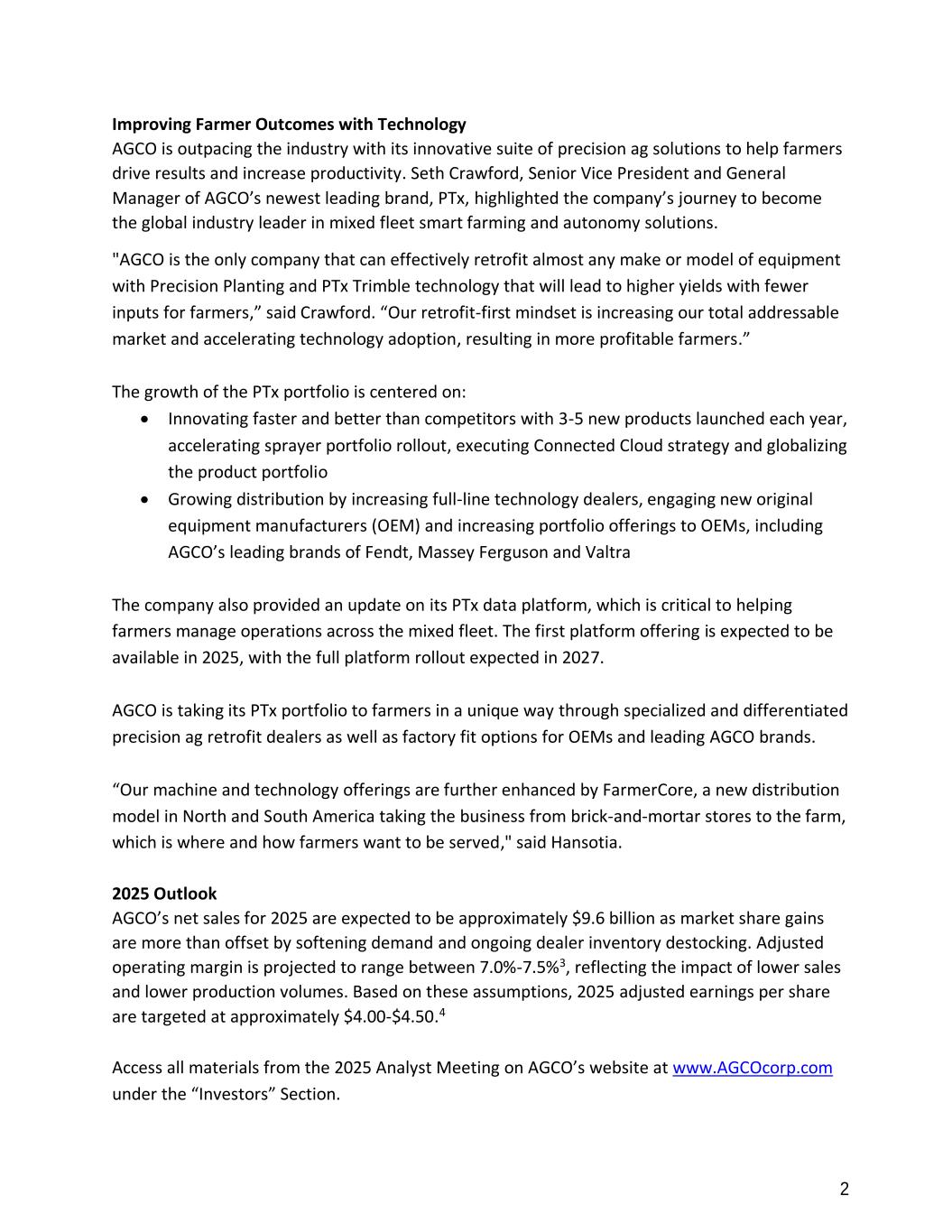2 Improving Farmer Outcomes with Technology AGCO is outpacing the industry with its innovative suite of precision ag solutions to help farmers drive results and increase productivity. Seth Crawford, Senior Vice President and General Manager of AGCO’s newest leading brand, PTx, highlighted the company’s journey to become the global industry leader in mixed fleet smart farming and autonomy solutions. "AGCO is the only company that can effectively retrofit almost any make or model of equipment with Precision Planting and PTx Trimble technology that will lead to higher yields with fewer inputs for farmers,” said Crawford. “Our retrofit-first mindset is increasing our total addressable market and accelerating technology adoption, resulting in more profitable farmers.” The growth of the PTx portfolio is centered on: • Innovating faster and better than competitors with 3-5 new products launched each year, accelerating sprayer portfolio rollout, executing Connected Cloud strategy and globalizing the product portfolio • Growing distribution by increasing full-line technology dealers, engaging new original equipment manufacturers (OEM) and increasing portfolio offerings to OEMs, including AGCO’s leading brands of Fendt, Massey Ferguson and Valtra The company also provided an update on its PTx data platform, which is critical to helping farmers manage operations across the mixed fleet. The first platform offering is expected to be available in 2025, with the full platform rollout expected in 2027. AGCO is taking its PTx portfolio to farmers in a unique way through specialized and differentiated precision ag retrofit dealers as well as factory fit options for OEMs and leading AGCO brands. “Our machine and technology offerings are further enhanced by FarmerCore, a new distribution model in North and South America taking the business from brick-and-mortar stores to the farm, which is where and how farmers want to be served," said Hansotia. 2025 Outlook AGCO’s net sales for 2025 are expected to be approximately $9.6 billion as market share gains are more than offset by softening demand and ongoing dealer inventory destocking. Adjusted operating margin is projected to range between 7.0%-7.5%3, reflecting the impact of lower sales and lower production volumes. Based on these assumptions, 2025 adjusted earnings per share are targeted at approximately $4.00-$4.50.4 Access all materials from the 2025 Analyst Meeting on AGCO’s website at www.AGCOcorp.com under the “Investors” Section.