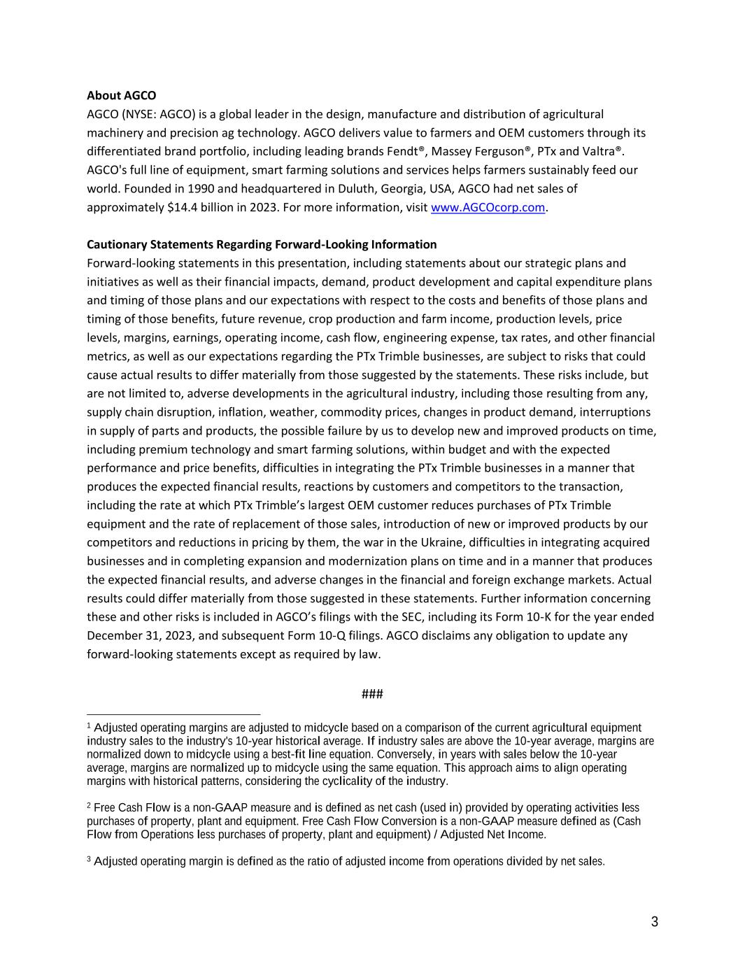 3 About AGCO AGCO (NYSE: AGCO) is a global leader in the design, manufacture and distribution of agricultural machinery and precision ag technology. AGCO delivers value to farmers and OEM customers through its differentiated brand portfolio, including leading brands Fendt®, Massey Ferguson®, PTx and Valtra®. AGCO's full line of equipment, smart farming solutions and services helps farmers sustainably feed our world. Founded in 1990 and headquartered in Duluth, Georgia, USA, AGCO had net sales of approximately $14.4 billion in 2023. For more information, visit www.AGCOcorp.com. Cautionary Statements Regarding Forward-Looking Information Forward-looking statements in this presentation, including statements about our strategic plans and initiatives as well as their financial impacts, demand, product development and capital expenditure plans and timing of those plans and our expectations with respect to the costs and benefits of those plans and timing of those benefits, future revenue, crop production and farm income, production levels, price levels, margins, earnings, operating income, cash flow, engineering expense, tax rates, and other financial metrics, as well as our expectations regarding the PTx Trimble businesses, are subject to risks that could cause actual results to differ materially from those suggested by the statements. These risks include, but are not limited to, adverse developments in the agricultural industry, including those resulting from any, supply chain disruption, inflation, weather, commodity prices, changes in product demand, interruptions in supply of parts and products, the possible failure by us to develop new and improved products on time, including premium technology and smart farming solutions, within budget and with the expected performance and price benefits, difficulties in integrating the PTx Trimble businesses in a manner that produces the expected financial results, reactions by customers and competitors to the transaction, including the rate at which PTx Trimble’s largest OEM customer reduces purchases of PTx Trimble equipment and the rate of replacement of those sales, introduction of new or improved products by our competitors and reductions in pricing by them, the war in the Ukraine, difficulties in integrating acquired businesses and in completing expansion and modernization plans on time and in a manner that produces the expected financial results, and adverse changes in the financial and foreign exchange markets. Actual results could differ materially from those suggested in these statements. Further information concerning these and other risks is included in AGCO’s filings with the SEC, including its Form 10-K for the year ended December 31, 2023, and subsequent Form 10-Q filings. AGCO disclaims any obligation to update any forward-looking statements except as required by law. ### 1 Adjusted operating margins are adjusted to midcycle based on a comparison of the current agricultural equipment industry sales to the industry's 10-year historical average. If industry sales are above the 10-year average, margins are normalized down to midcycle using a best-fit line equation. Conversely, in years with sales below the 10-year average, margins are normalized up to midcycle using the same equation. This approach aims to align operating margins with historical patterns, considering the cyclicality of the industry. 2 Free Cash Flow is a non-GAAP measure and is defined as net cash (used in) provided by operating activities less purchases of property, plant and equipment. Free Cash Flow Conversion is a non-GAAP measure defined as (Cash Flow from Operations less purchases of property, plant and equipment) / Adjusted Net Income. 3 Adjusted operating margin is defined as the ratio of adjusted income from operations divided by net sales.