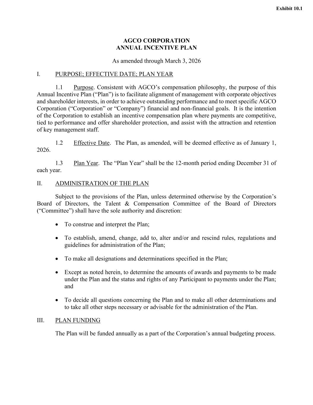 AGCO CORPORATION ANNUAL INCENTIVE PLAN As amended through March 3, 2026 I. PURPOSE; EFFECTIVE DATE; PLAN YEAR 1.1 Purpose. Consistent with AGCO’s compensation philosophy, the purpose of this Annual Incentive Plan (“Plan”) is to facilitate alignment of management with corporate objectives and shareholder interests, in order to achieve outstanding performance and to meet specific AGCO Corporation (“Corporation” or “Company”) financial and non-financial goals. It is the intention of the Corporation to establish an incentive compensation plan where payments are competitive, tied to performance and offer shareholder protection, and assist with the attraction and retention of key management staff. 1.2 Effective Date. The Plan, as amended, will be deemed effective as of January 1, 2026. 1.3 Plan Year. The “Plan Year” shall be the 12-month period ending December 31 of each year. II. ADMINISTRATION OF THE PLAN Subject to the provisions of the Plan, unless determined otherwise by the Corporation’s Board of Directors, the Talent & Compensation Committee of the Board of Directors (“Committee”) shall have the sole authority and discretion: • To construe and interpret the Plan; • To establish, amend, change, add to, alter and/or and rescind rules, regulations and guidelines for administration of the Plan; • To make all designations and determinations specified in the Plan; • Except as noted herein, to determine the amounts of awards and payments to be made under the Plan and the status and rights of any Participant to payments under the Plan; and • To decide all questions concerning the Plan and to make all other determinations and to take all other steps necessary or advisable for the administration of the Plan. III. PLAN FUNDING The Plan will be funded annually as a part of the Corporation’s annual budgeting process.