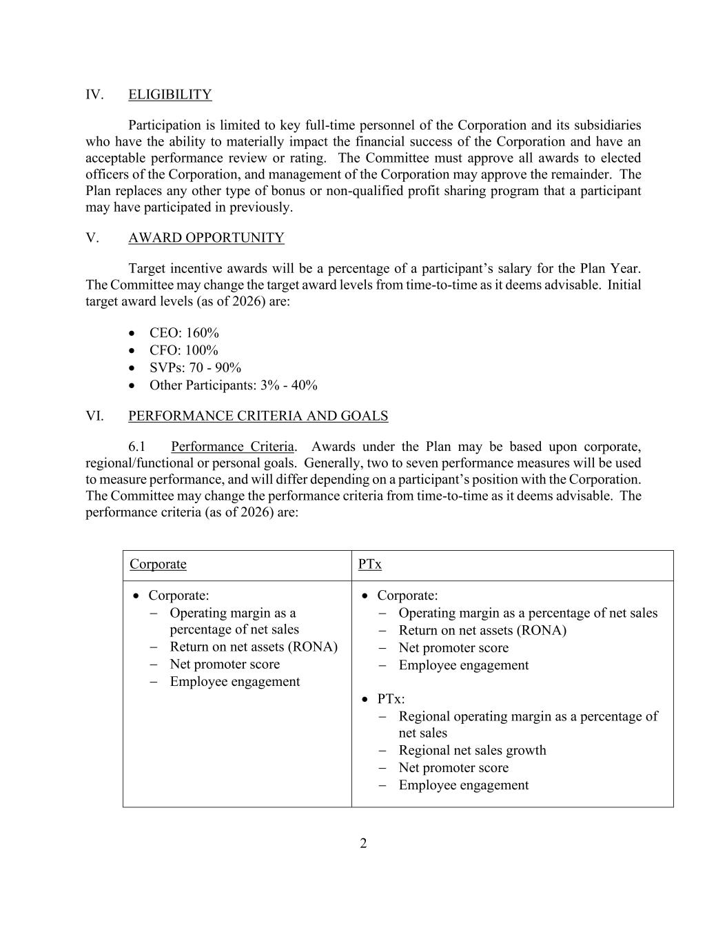 2 IV. ELIGIBILITY Participation is limited to key full-time personnel of the Corporation and its subsidiaries who have the ability to materially impact the financial success of the Corporation and have an acceptable performance review or rating. The Committee must approve all awards to elected officers of the Corporation, and management of the Corporation may approve the remainder. The Plan replaces any other type of bonus or non-qualified profit sharing program that a participant may have participated in previously. V. AWARD OPPORTUNITY Target incentive awards will be a percentage of a participant’s salary for the Plan Year. The Committee may change the target award levels from time-to-time as it deems advisable. Initial target award levels (as of 2026) are: • CEO: 160% • CFO: 100% • SVPs: 70 - 90% • Other Participants: 3% - 40% VI. PERFORMANCE CRITERIA AND GOALS 6.1 Performance Criteria. Awards under the Plan may be based upon corporate, regional/functional or personal goals. Generally, two to seven performance measures will be used to measure performance, and will differ depending on a participant’s position with the Corporation. The Committee may change the performance criteria from time-to-time as it deems advisable. The performance criteria (as of 2026) are: Corporate PTx • Corporate: − Operating margin as a percentage of net sales − Return on net assets (RONA) − Net promoter score − Employee engagement • Corporate: − Operating margin as a percentage of net sales − Return on net assets (RONA) − Net promoter score − Employee engagement • PTx: − Regional operating margin as a percentage of net sales − Regional net sales growth − Net promoter score − Employee engagement