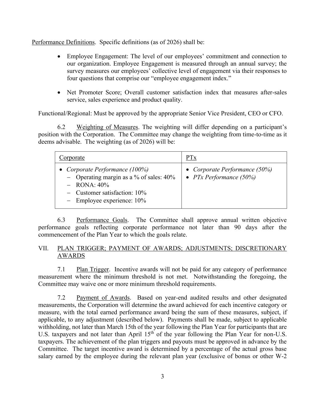 3 Performance Definitions. Specific definitions (as of 2026) shall be: • Employee Engagement: The level of our employees’ commitment and connection to our organization. Employee Engagement is measured through an annual survey; the survey measures our employees’ collective level of engagement via their responses to four questions that comprise our “employee engagement index.” • Net Promoter Score; Overall customer satisfaction index that measures after-sales service, sales experience and product quality. Functional/Regional: Must be approved by the appropriate Senior Vice President, CEO or CFO. 6.2 Weighting of Measures. The weighting will differ depending on a participant’s position with the Corporation. The Committee may change the weighting from time-to-time as it deems advisable. The weighting (as of 2026) will be: Corporate PTx • Corporate Performance (100%) − Operating margin as a % of sales: 40% − RONA: 40% − Customer satisfaction: 10% − Employee experience: 10% • Corporate Performance (50%) • PTx Performance (50%) 6.3 Performance Goals. The Committee shall approve annual written objective performance goals reflecting corporate performance not later than 90 days after the commencement of the Plan Year to which the goals relate. VII. PLAN TRIGGER; PAYMENT OF AWARDS; ADJUSTMENTS; DISCRETIONARY AWARDS 7.1 Plan Trigger. Incentive awards will not be paid for any category of performance measurement where the minimum threshold is not met. Notwithstanding the foregoing, the Committee may waive one or more minimum threshold requirements. 7.2 Payment of Awards. Based on year-end audited results and other designated measurements, the Corporation will determine the award achieved for each incentive category or measure, with the total earned performance award being the sum of these measures, subject, if applicable, to any adjustment (described below). Payments shall be made, subject to applicable withholding, not later than March 15th of the year following the Plan Year for participants that are U.S. taxpayers and not later than April 15th of the year following the Plan Year for non-U.S. taxpayers. The achievement of the plan triggers and payouts must be approved in advance by the Committee. The target incentive award is determined by a percentage of the actual gross base salary earned by the employee during the relevant plan year (exclusive of bonus or other W-2