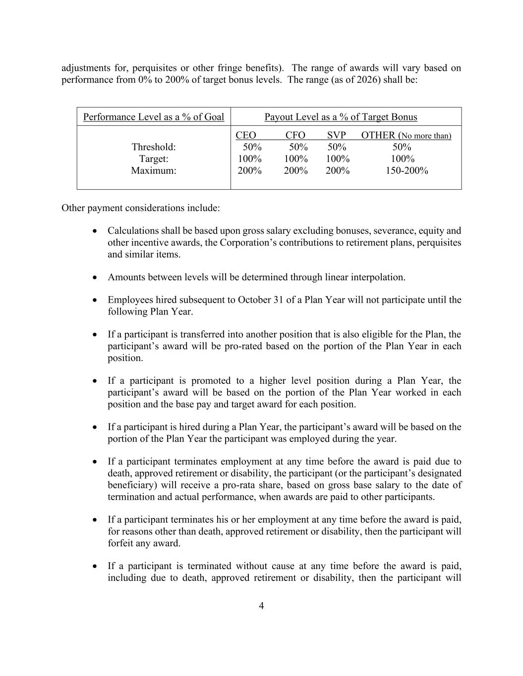 4 adjustments for, perquisites or other fringe benefits). The range of awards will vary based on performance from 0% to 200% of target bonus levels. The range (as of 2026) shall be: Performance Level as a % of Goal Payout Level as a % of Target Bonus Threshold: Target: Maximum: CEO CFO SVP OTHER (No more than) 50% 50% 50% 50% 100% 100% 100% 100% 200% 200% 200% 150-200% Other payment considerations include: • Calculations shall be based upon gross salary excluding bonuses, severance, equity and other incentive awards, the Corporation’s contributions to retirement plans, perquisites and similar items. • Amounts between levels will be determined through linear interpolation. • Employees hired subsequent to October 31 of a Plan Year will not participate until the following Plan Year. • If a participant is transferred into another position that is also eligible for the Plan, the participant’s award will be pro-rated based on the portion of the Plan Year in each position. • If a participant is promoted to a higher level position during a Plan Year, the participant’s award will be based on the portion of the Plan Year worked in each position and the base pay and target award for each position. • If a participant is hired during a Plan Year, the participant’s award will be based on the portion of the Plan Year the participant was employed during the year. • If a participant terminates employment at any time before the award is paid due to death, approved retirement or disability, the participant (or the participant’s designated beneficiary) will receive a pro-rata share, based on gross base salary to the date of termination and actual performance, when awards are paid to other participants. • If a participant terminates his or her employment at any time before the award is paid, for reasons other than death, approved retirement or disability, then the participant will forfeit any award. • If a participant is terminated without cause at any time before the award is paid, including due to death, approved retirement or disability, then the participant will