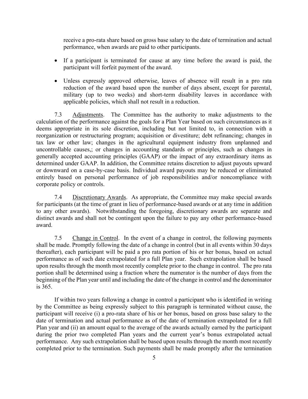 5 receive a pro-rata share based on gross base salary to the date of termination and actual performance, when awards are paid to other participants. • If a participant is terminated for cause at any time before the award is paid, the participant will forfeit payment of the award. • Unless expressly approved otherwise, leaves of absence will result in a pro rata reduction of the award based upon the number of days absent, except for parental, military (up to two weeks) and short-term disability leaves in accordance with applicable policies, which shall not result in a reduction. 7.3 Adjustments. The Committee has the authority to make adjustments to the calculation of the performance against the goals for a Plan Year based on such circumstances as it deems appropriate in its sole discretion, including but not limited to, in connection with a reorganization or restructuring program; acquisition or divestiture; debt refinancing; changes in tax law or other law; changes in the agricultural equipment industry from unplanned and uncontrollable causes,; or changes in accounting standards or principles, such as changes in generally accepted accounting principles (GAAP) or the impact of any extraordinary items as determined under GAAP. In addition, the Committee retains discretion to adjust payouts upward or downward on a case-by-case basis. Individual award payouts may be reduced or eliminated entirely based on personal performance of job responsibilities and/or noncompliance with corporate policy or controls. 7.4 Discretionary Awards. As appropriate, the Committee may make special awards for participants (at the time of grant in lieu of performance-based awards or at any time in addition to any other awards). Notwithstanding the foregoing, discretionary awards are separate and distinct awards and shall not be contingent upon the failure to pay any other performance-based award. 7.5 Change in Control. In the event of a change in control, the following payments shall be made. Promptly following the date of a change in control (but in all events within 30 days thereafter), each participant will be paid a pro rata portion of his or her bonus, based on actual performance as of such date extrapolated for a full Plan year. Such extrapolation shall be based upon results through the month most recently complete prior to the change in control. The pro rata portion shall be determined using a fraction where the numerator is the number of days from the beginning of the Plan year until and including the date of the change in control and the denominator is 365. If within two years following a change in control a participant who is identified in writing by the Committee as being expressly subject to this paragraph is terminated without cause, the participant will receive (i) a pro-rata share of his or her bonus, based on gross base salary to the date of termination and actual performance as of the date of termination extrapolated for a full Plan year and (ii) an amount equal to the average of the awards actually earned by the participant during the prior two completed Plan years and the current year’s bonus extrapolated actual performance. Any such extrapolation shall be based upon results through the month most recently completed prior to the termination. Such payments shall be made promptly after the termination
