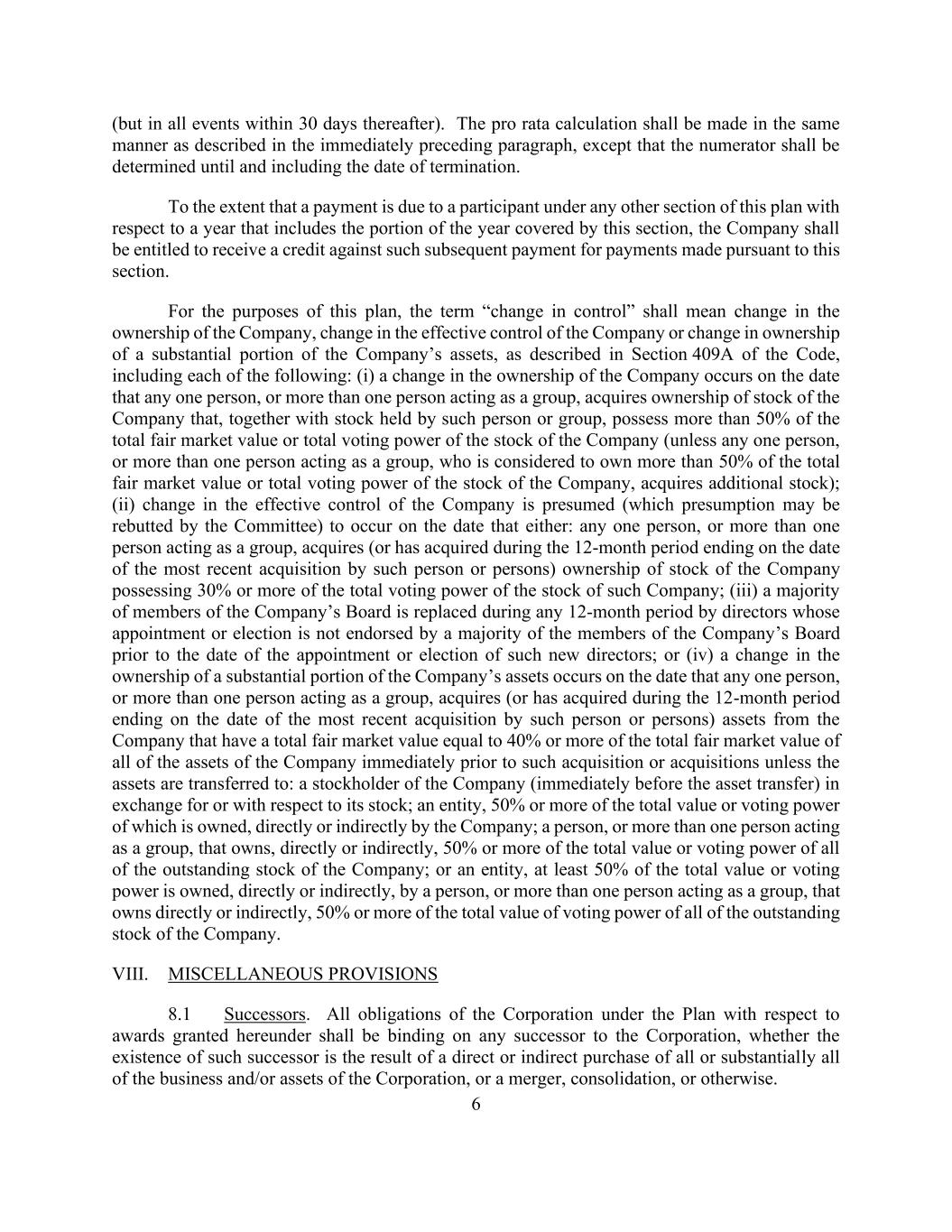 6 (but in all events within 30 days thereafter). The pro rata calculation shall be made in the same manner as described in the immediately preceding paragraph, except that the numerator shall be determined until and including the date of termination. To the extent that a payment is due to a participant under any other section of this plan with respect to a year that includes the portion of the year covered by this section, the Company shall be entitled to receive a credit against such subsequent payment for payments made pursuant to this section. For the purposes of this plan, the term “change in control” shall mean change in the ownership of the Company, change in the effective control of the Company or change in ownership of a substantial portion of the Company’s assets, as described in Section 409A of the Code, including each of the following: (i) a change in the ownership of the Company occurs on the date that any one person, or more than one person acting as a group, acquires ownership of stock of the Company that, together with stock held by such person or group, possess more than 50% of the total fair market value or total voting power of the stock of the Company (unless any one person, or more than one person acting as a group, who is considered to own more than 50% of the total fair market value or total voting power of the stock of the Company, acquires additional stock); (ii) change in the effective control of the Company is presumed (which presumption may be rebutted by the Committee) to occur on the date that either: any one person, or more than one person acting as a group, acquires (or has acquired during the 12-month period ending on the date of the most recent acquisition by such person or persons) ownership of stock of the Company possessing 30% or more of the total voting power of the stock of such Company; (iii) a majority of members of the Company’s Board is replaced during any 12-month period by directors whose appointment or election is not endorsed by a majority of the members of the Company’s Board prior to the date of the appointment or election of such new directors; or (iv) a change in the ownership of a substantial portion of the Company’s assets occurs on the date that any one person, or more than one person acting as a group, acquires (or has acquired during the 12-month period ending on the date of the most recent acquisition by such person or persons) assets from the Company that have a total fair market value equal to 40% or more of the total fair market value of all of the assets of the Company immediately prior to such acquisition or acquisitions unless the assets are transferred to: a stockholder of the Company (immediately before the asset transfer) in exchange for or with respect to its stock; an entity, 50% or more of the total value or voting power of which is owned, directly or indirectly by the Company; a person, or more than one person acting as a group, that owns, directly or indirectly, 50% or more of the total value or voting power of all of the outstanding stock of the Company; or an entity, at least 50% of the total value or voting power is owned, directly or indirectly, by a person, or more than one person acting as a group, that owns directly or indirectly, 50% or more of the total value of voting power of all of the outstanding stock of the Company. VIII. MISCELLANEOUS PROVISIONS 8.1 Successors. All obligations of the Corporation under the Plan with respect to awards granted hereunder shall be binding on any successor to the Corporation, whether the existence of such successor is the result of a direct or indirect purchase of all or substantially all of the business and/or assets of the Corporation, or a merger, consolidation, or otherwise.