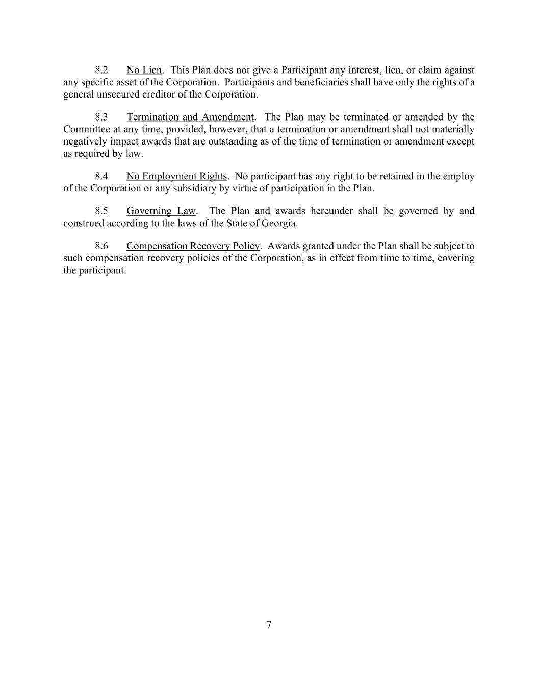 7 8.2 No Lien. This Plan does not give a Participant any interest, lien, or claim against any specific asset of the Corporation. Participants and beneficiaries shall have only the rights of a general unsecured creditor of the Corporation. 8.3 Termination and Amendment. The Plan may be terminated or amended by the Committee at any time, provided, however, that a termination or amendment shall not materially negatively impact awards that are outstanding as of the time of termination or amendment except as required by law. 8.4 No Employment Rights. No participant has any right to be retained in the employ of the Corporation or any subsidiary by virtue of participation in the Plan. 8.5 Governing Law. The Plan and awards hereunder shall be governed by and construed according to the laws of the State of Georgia. 8.6 Compensation Recovery Policy. Awards granted under the Plan shall be subject to such compensation recovery policies of the Corporation, as in effect from time to time, covering the participant.