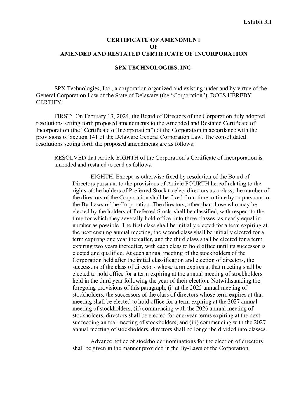 Exhibit 3.1 CERTIFICATE OF AMENDMENT OF AMENDED AND RESTATED CERTIFICATE OF INCORPORATION SPX TECHNOLOGIES, INC. SPX Technologies, Inc., a corporation organized and existing under and by virtue of the General Corporation Law of the State of Delaware (the “Corporation”), DOES HEREBY CERTIFY: FIRST: On February 13, 2024, the Board of Directors of the Corporation duly adopted resolutions setting forth proposed amendments to the Amended and Restated Certificate of Incorporation (the “Certificate of Incorporation”) of the Corporation in accordance with the provisions of Section 141 of the Delaware General Corporation Law. The consolidated resolutions setting forth the proposed amendments are as follows: RESOLVED that Article EIGHTH of the Corporation’s Certificate of Incorporation is amended and restated to read as follows: EIGHTH. Except as otherwise fixed by resolution of the Board of Directors pursuant to the provisions of Article FOURTH hereof relating to the rights of the holders of Preferred Stock to elect directors as a class, the number of the directors of the Corporation shall be fixed from time to time by or pursuant to the By-Laws of the Corporation. The directors, other than those who may be elected by the holders of Preferred Stock, shall be classified, with respect to the time for which they severally hold office, into three classes, as nearly equal in number as possible. The first class shall be initially elected for a term expiring at the next ensuing annual meeting, the second class shall be initially elected for a term expiring one year thereafter, and the third class shall be elected for a term expiring two years thereafter, with each class to hold office until its successor is elected and qualified. At each annual meeting of the stockholders of the Corporation held after the initial classification and election of directors, the successors of the class of directors whose term expires at that meeting shall be elected to hold office for a term expiring at the annual meeting of stockholders held in the third year following the year of their election. Notwithstanding the foregoing provisions of this paragraph, (i) at the 2025 annual meeting of stockholders, the successors of the class of directors whose term expires at that meeting shall be elected to hold office for a term expiring at the 2027 annual meeting of stockholders, (ii) commencing with the 2026 annual meeting of stockholders, directors shall be elected for one-year terms expiring at the next succeeding annual meeting of stockholders, and (iii) commencing with the 2027 annual meeting of stockholders, directors shall no longer be divided into classes. Advance notice of stockholder nominations for the election of directors shall be given in the manner provided in the By-Laws of the Corporation.