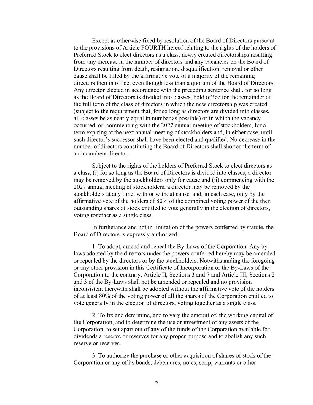 2 Except as otherwise fixed by resolution of the Board of Directors pursuant to the provisions of Article FOURTH hereof relating to the rights of the holders of Preferred Stock to elect directors as a class, newly created directorships resulting from any increase in the number of directors and any vacancies on the Board of Directors resulting from death, resignation, disqualification, removal or other cause shall be filled by the affirmative vote of a majority of the remaining directors then in office, even though less than a quorum of the Board of Directors. Any director elected in accordance with the preceding sentence shall, for so long as the Board of Directors is divided into classes, hold office for the remainder of the full term of the class of directors in which the new directorship was created (subject to the requirement that, for so long as directors are divided into classes, all classes be as nearly equal in number as possible) or in which the vacancy occurred, or, commencing with the 2027 annual meeting of stockholders, for a term expiring at the next annual meeting of stockholders and, in either case, until such director’s successor shall have been elected and qualified. No decrease in the number of directors constituting the Board of Directors shall shorten the term of an incumbent director. Subject to the rights of the holders of Preferred Stock to elect directors as a class, (i) for so long as the Board of Directors is divided into classes, a director may be removed by the stockholders only for cause and (ii) commencing with the 2027 annual meeting of stockholders, a director may be removed by the stockholders at any time, with or without cause, and, in each case, only by the affirmative vote of the holders of 80% of the combined voting power of the then outstanding shares of stock entitled to vote generally in the election of directors, voting together as a single class. In furtherance and not in limitation of the powers conferred by statute, the Board of Directors is expressly authorized: 1. To adopt, amend and repeal the By-Laws of the Corporation. Any by- laws adopted by the directors under the powers conferred hereby may be amended or repealed by the directors or by the stockholders. Notwithstanding the foregoing or any other provision in this Certificate of Incorporation or the By-Laws of the Corporation to the contrary, Article II, Sections 3 and 7 and Article III, Sections 2 and 3 of the By-Laws shall not be amended or repealed and no provision inconsistent therewith shall be adopted without the affirmative vote of the holders of at least 80% of the voting power of all the shares of the Corporation entitled to vote generally in the election of directors, voting together as a single class. 2. To fix and determine, and to vary the amount of, the working capital of the Corporation, and to determine the use or investment of any assets of the Corporation, to set apart out of any of the funds of the Corporation available for dividends a reserve or reserves for any proper purpose and to abolish any such reserve or reserves. 3. To authorize the purchase or other acquisition of shares of stock of the Corporation or any of its bonds, debentures, notes, scrip, warrants or other