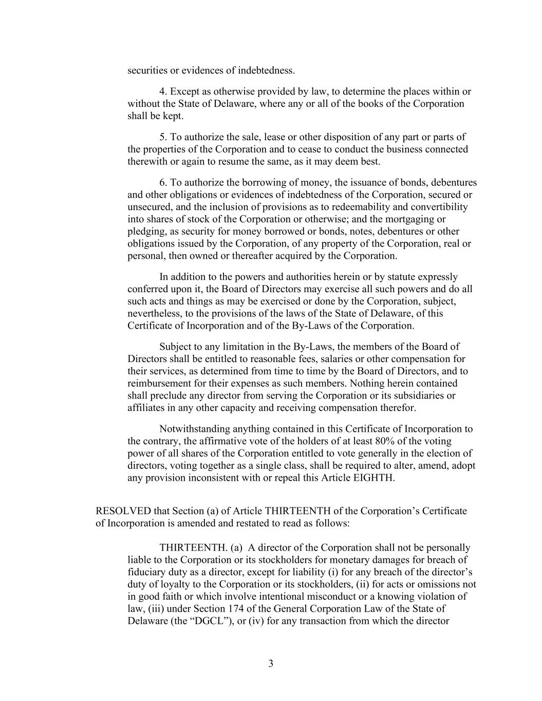 3 securities or evidences of indebtedness. 4. Except as otherwise provided by law, to determine the places within or without the State of Delaware, where any or all of the books of the Corporation shall be kept. 5. To authorize the sale, lease or other disposition of any part or parts of the properties of the Corporation and to cease to conduct the business connected therewith or again to resume the same, as it may deem best. 6. To authorize the borrowing of money, the issuance of bonds, debentures and other obligations or evidences of indebtedness of the Corporation, secured or unsecured, and the inclusion of provisions as to redeemability and convertibility into shares of stock of the Corporation or otherwise; and the mortgaging or pledging, as security for money borrowed or bonds, notes, debentures or other obligations issued by the Corporation, of any property of the Corporation, real or personal, then owned or thereafter acquired by the Corporation. In addition to the powers and authorities herein or by statute expressly conferred upon it, the Board of Directors may exercise all such powers and do all such acts and things as may be exercised or done by the Corporation, subject, nevertheless, to the provisions of the laws of the State of Delaware, of this Certificate of Incorporation and of the By-Laws of the Corporation. Subject to any limitation in the By-Laws, the members of the Board of Directors shall be entitled to reasonable fees, salaries or other compensation for their services, as determined from time to time by the Board of Directors, and to reimbursement for their expenses as such members. Nothing herein contained shall preclude any director from serving the Corporation or its subsidiaries or affiliates in any other capacity and receiving compensation therefor. Notwithstanding anything contained in this Certificate of Incorporation to the contrary, the affirmative vote of the holders of at least 80% of the voting power of all shares of the Corporation entitled to vote generally in the election of directors, voting together as a single class, shall be required to alter, amend, adopt any provision inconsistent with or repeal this Article EIGHTH. RESOLVED that Section (a) of Article THIRTEENTH of the Corporation’s Certificate of Incorporation is amended and restated to read as follows: THIRTEENTH. (a) A director of the Corporation shall not be personally liable to the Corporation or its stockholders for monetary damages for breach of fiduciary duty as a director, except for liability (i) for any breach of the director’s duty of loyalty to the Corporation or its stockholders, (ii) for acts or omissions not in good faith or which involve intentional misconduct or a knowing violation of law, (iii) under Section 174 of the General Corporation Law of the State of Delaware (the “DGCL”), or (iv) for any transaction from which the director