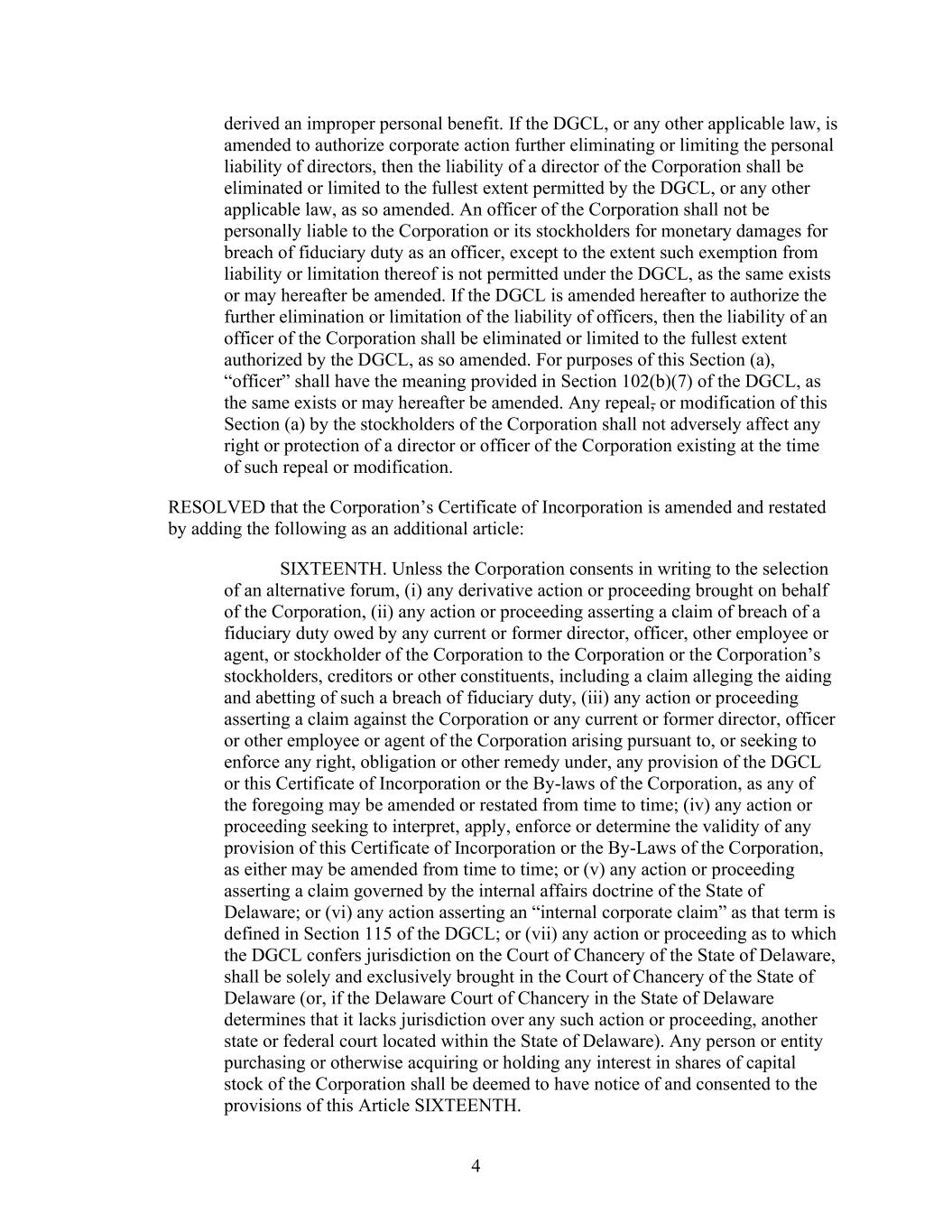 4 derived an improper personal benefit. If the DGCL, or any other applicable law, is amended to authorize corporate action further eliminating or limiting the personal liability of directors, then the liability of a director of the Corporation shall be eliminated or limited to the fullest extent permitted by the DGCL, or any other applicable law, as so amended. An officer of the Corporation shall not be personally liable to the Corporation or its stockholders for monetary damages for breach of fiduciary duty as an officer, except to the extent such exemption from liability or limitation thereof is not permitted under the DGCL, as the same exists or may hereafter be amended. If the DGCL is amended hereafter to authorize the further elimination or limitation of the liability of officers, then the liability of an officer of the Corporation shall be eliminated or limited to the fullest extent authorized by the DGCL, as so amended. For purposes of this Section (a), “officer” shall have the meaning provided in Section 102(b)(7) of the DGCL, as the same exists or may hereafter be amended. Any repeal, or modification of this Section (a) by the stockholders of the Corporation shall not adversely affect any right or protection of a director or officer of the Corporation existing at the time of such repeal or modification. RESOLVED that the Corporation’s Certificate of Incorporation is amended and restated by adding the following as an additional article: SIXTEENTH. Unless the Corporation consents in writing to the selection of an alternative forum, (i) any derivative action or proceeding brought on behalf of the Corporation, (ii) any action or proceeding asserting a claim of breach of a fiduciary duty owed by any current or former director, officer, other employee or agent, or stockholder of the Corporation to the Corporation or the Corporation’s stockholders, creditors or other constituents, including a claim alleging the aiding and abetting of such a breach of fiduciary duty, (iii) any action or proceeding asserting a claim against the Corporation or any current or former director, officer or other employee or agent of the Corporation arising pursuant to, or seeking to enforce any right, obligation or other remedy under, any provision of the DGCL or this Certificate of Incorporation or the By-laws of the Corporation, as any of the foregoing may be amended or restated from time to time; (iv) any action or proceeding seeking to interpret, apply, enforce or determine the validity of any provision of this Certificate of Incorporation or the By-Laws of the Corporation, as either may be amended from time to time; or (v) any action or proceeding asserting a claim governed by the internal affairs doctrine of the State of Delaware; or (vi) any action asserting an “internal corporate claim” as that term is defined in Section 115 of the DGCL; or (vii) any action or proceeding as to which the DGCL confers jurisdiction on the Court of Chancery of the State of Delaware, shall be solely and exclusively brought in the Court of Chancery of the State of Delaware (or, if the Delaware Court of Chancery in the State of Delaware determines that it lacks jurisdiction over any such action or proceeding, another state or federal court located within the State of Delaware). Any person or entity purchasing or otherwise acquiring or holding any interest in shares of capital stock of the Corporation shall be deemed to have notice of and consented to the provisions of this Article SIXTEENTH.