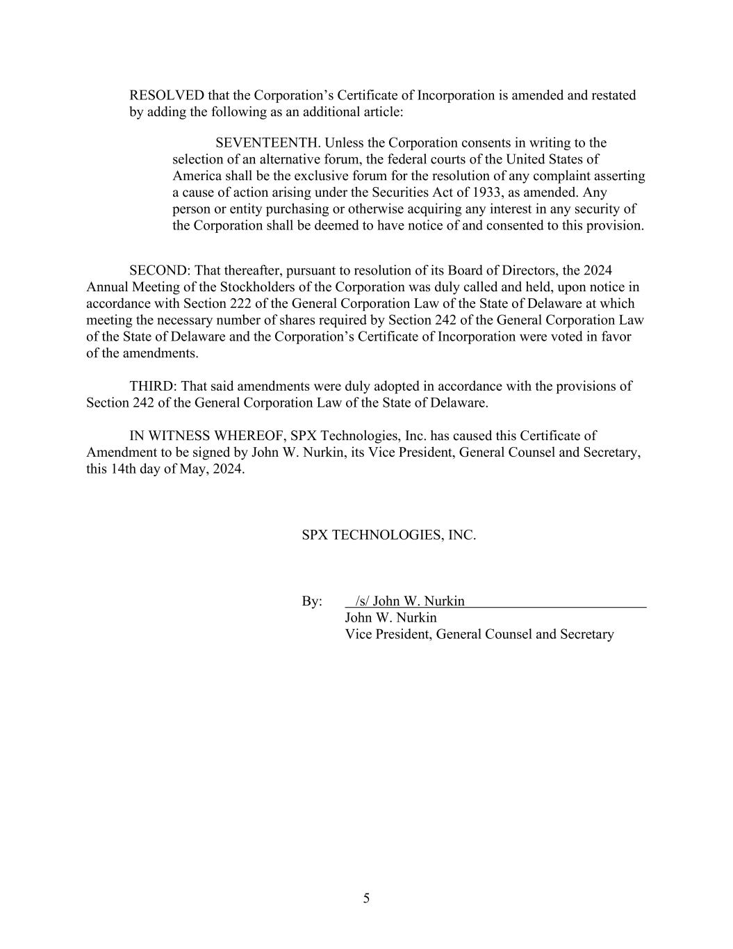 5 RESOLVED that the Corporation’s Certificate of Incorporation is amended and restated by adding the following as an additional article: SEVENTEENTH. Unless the Corporation consents in writing to the selection of an alternative forum, the federal courts of the United States of America shall be the exclusive forum for the resolution of any complaint asserting a cause of action arising under the Securities Act of 1933, as amended. Any person or entity purchasing or otherwise acquiring any interest in any security of the Corporation shall be deemed to have notice of and consented to this provision. SECOND: That thereafter, pursuant to resolution of its Board of Directors, the 2024 Annual Meeting of the Stockholders of the Corporation was duly called and held, upon notice in accordance with Section 222 of the General Corporation Law of the State of Delaware at which meeting the necessary number of shares required by Section 242 of the General Corporation Law of the State of Delaware and the Corporation’s Certificate of Incorporation were voted in favor of the amendments. THIRD: That said amendments were duly adopted in accordance with the provisions of Section 242 of the General Corporation Law of the State of Delaware. IN WITNESS WHEREOF, SPX Technologies, Inc. has caused this Certificate of Amendment to be signed by John W. Nurkin, its Vice President, General Counsel and Secretary, this 14th day of May, 2024. SPX TECHNOLOGIES, INC. By: /s/ John W. Nurkin John W. Nurkin Vice President, General Counsel and Secretary