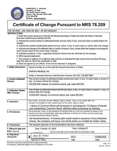 INSTRUCTIONS: 1. Enter the current name as on file with the Nevada Secretary of State and enter the Entity or Nevada Business Identif ication Number (NVID). 2. Indicate the current number of authorized shares and par value, if any, and each class or series before the change. 3. Indicate the number of authorized shares and par value, if any of each class or series af ter the change. 4. Indicate the change of the affected class or series of issued, if any, shares after the change in exchange for each issued share of the same class or series. 5. Indicate provisions, if any, regarding f ractional shares that are af f ected by the change. 6. NRS required statement. 7. This section is optional. If an effective date and time is indicated the date must not be more than 90 days af ter the date on which the certif icate is f iled. 8. Must be signed by an Officer. Form will be returned if unsigned. Name of entity as on f ile with the Nevada Secretary of State: Aethlon Medical, Inc. 1. Entity Information: D): C3159 - 1991 Entity or Nevada Business Identif ication Number (NVI The current number of authorized shares and the par value, if any, of each class or series, if any, of shares bef ore the change: 60,000,000 shares of common stock, par value $0.001. 2. Current Authorized Shares: The number of authorized shares and the par value, if any, of each class or series, if any, of shares af ter the change: 6,000,000 shares of common stock, par value $0.001. 3. Authorized Shares After Change: The number of shares of each affected class or series, if any, to be issued after the change in exchange for each issued share of the same class or series: 1 share of Common Stock will be issued in exchange for 10 shares of issued and outstanding Common Stock, effective after processing by Nasdaq. 4. Issuance: The provisions, if any, for the issuance of fractional shar es, or for the p ayment of money or the issuance of scrip to stockholders otherwise entitled to a fr action of a share and the percentage of outstanding shares affected thereby : No fractional shares. If reverse split would result in issuance of any fractional shares, the company will issue one whole share on a holder - by - holder basis. 5. Provisions: The required approval of the stockholders has been obtained. 6. Provisions: Date: October 16, 2025 Time: 10:00am ET (must not be later than 90 days after the certificate is filed) 7. Effective date and time: (Optional) X CEO 10/08/2025 Signature of Officer Title Date 8. Signature: (Required) FRANCISCO V. AGUILAR Secretary of State 401 North Carson Street Carson City, Nevada 89701 - 4201 (775) 684 - 5708 Website: www.nvsos.gov TYPE OR PRINT - USE DARK INK ONLY - DO NOT HIGHLIGHT Certificate of Change Pursuant to NRS 78.209 This form must be accompanied by appropriate fees. If necessary, additional pag es may be attached to this form. Page 1 of 1 Revised: 8/1/2023