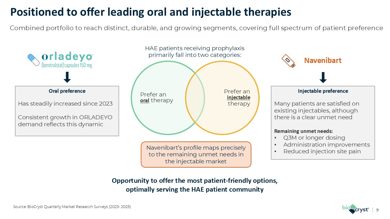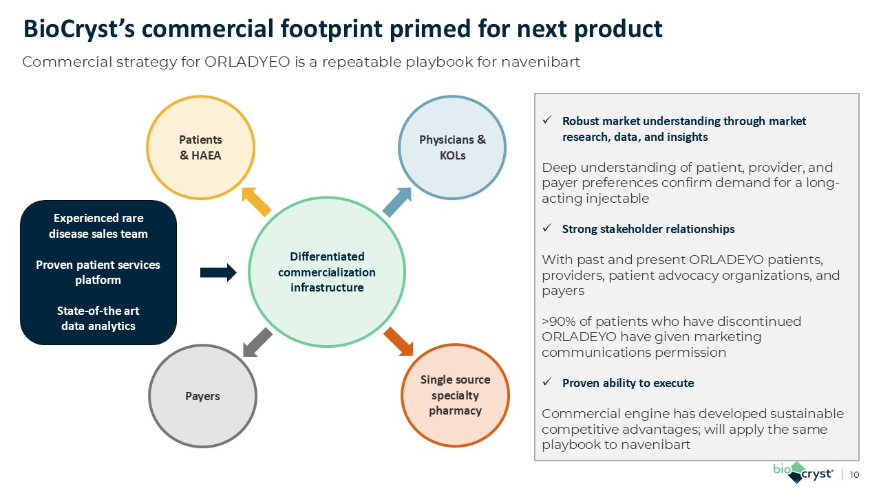 Positioned to offer leading oral and injectable therapies  9  Navenibart  Prefer an oral therapy  Prefer an injectable therapy  HAE patients receiving prophylaxis   primarily fall into two categories:  Oral preference  Has steadily increased since 2023  Consistent growth in ORLADEYO demand reflects this dynamic  Injectable preference  Many patients are satisfied on existing injectables, although there is a clear unmet need  Remaining unmet needs:  Q3M or longer dosing  Administration improvements  Reduced injection site pain  Source: BioCryst Quarterly Market Research Surveys (2023- 2025)  Combined portfolio to reach distinct, durable, and growing segments, covering full spectrum of patient preference  Navenibart’s profile maps precisely to the remaining unmet needs in the injectable market  Opportunity to offer the most patient-friendly options,   optimally serving the HAE patient community