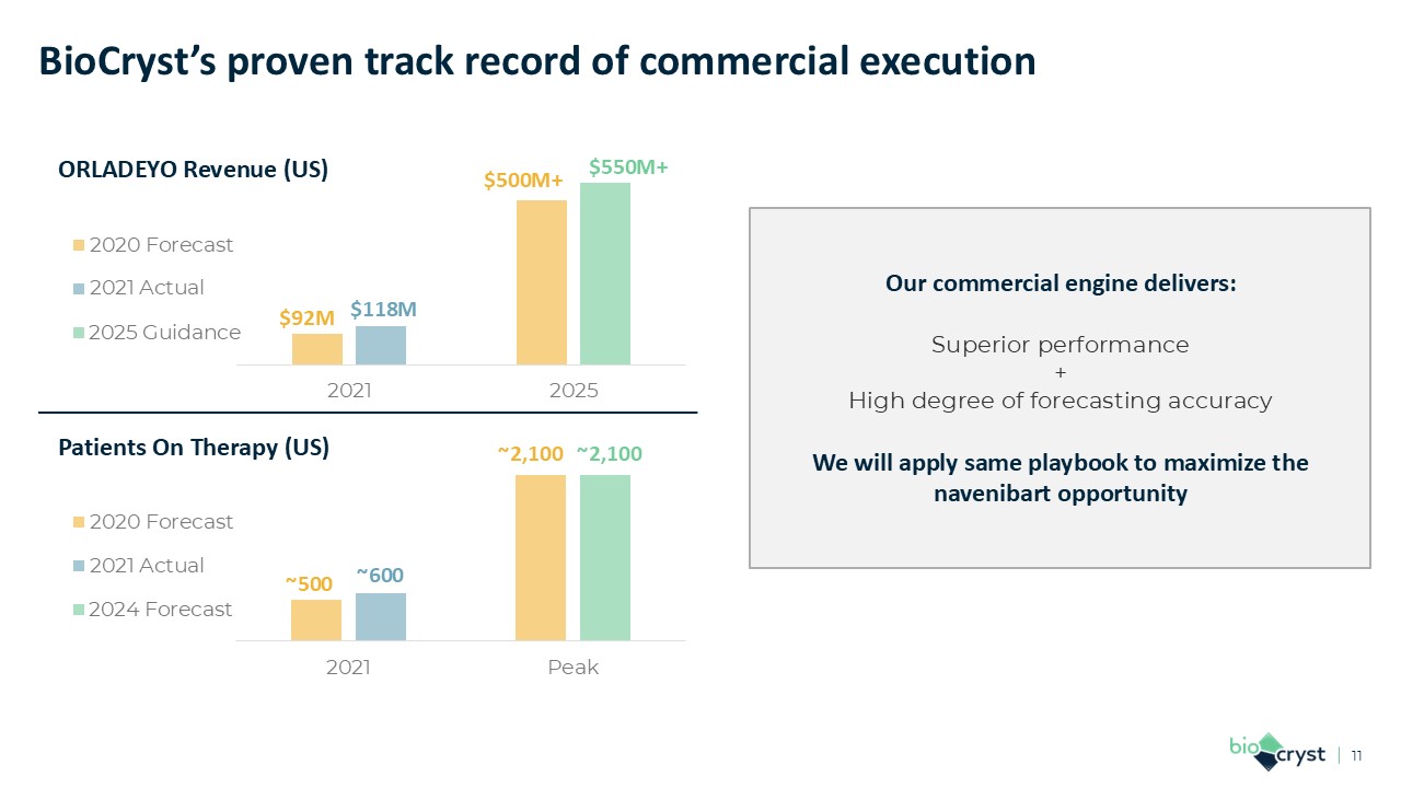 BioCryst’s commercial footprint primed for next product  10  Commercial strategy for ORLADYEO is a repeatable playbook for navenibart  Patients   & HAEA  Physicians & KOLs  Single source  specialty pharmacy  Payers  Robust market understanding through market research, data, and insights   Deep understanding of patient, provider, and payer preferences confirm demand for a long-acting injectable  Strong stakeholder relationships  With past and present ORLADEYO patients, providers, patient advocacy organizations, and payers  >90% of patients who have discontinued ORLADEYO have given marketing communications permission  Proven ability to execute  Commercial engine has developed sustainable competitive advantages; will apply the same playbook to navenibart  Experienced rare disease sales team  Proven patient services platform  State-of-the art   data analytics  Differentiated commercialization infrastructure