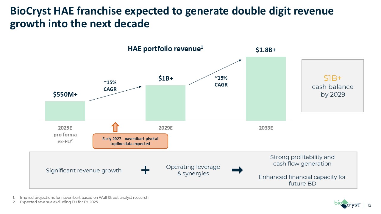 BioCryst HAE franchise expected to generate double digit revenue growth into the next decade  12  $550M+  $1B+  $1.8B+  ~15%   CAGR  ~15%   CAGR  $1B+   cash balance   by 2029  Implied projections for navenibart based on Wall Street analyst research  Expected revenue excluding EU for FY 2025  Significant revenue growth   Operating leverage   & synergies   Strong profitability and   cash flow generation  Enhanced financial capacity for future BD  Early 2027 - navenibart pivotal topline data expected  HAE portfolio revenue1