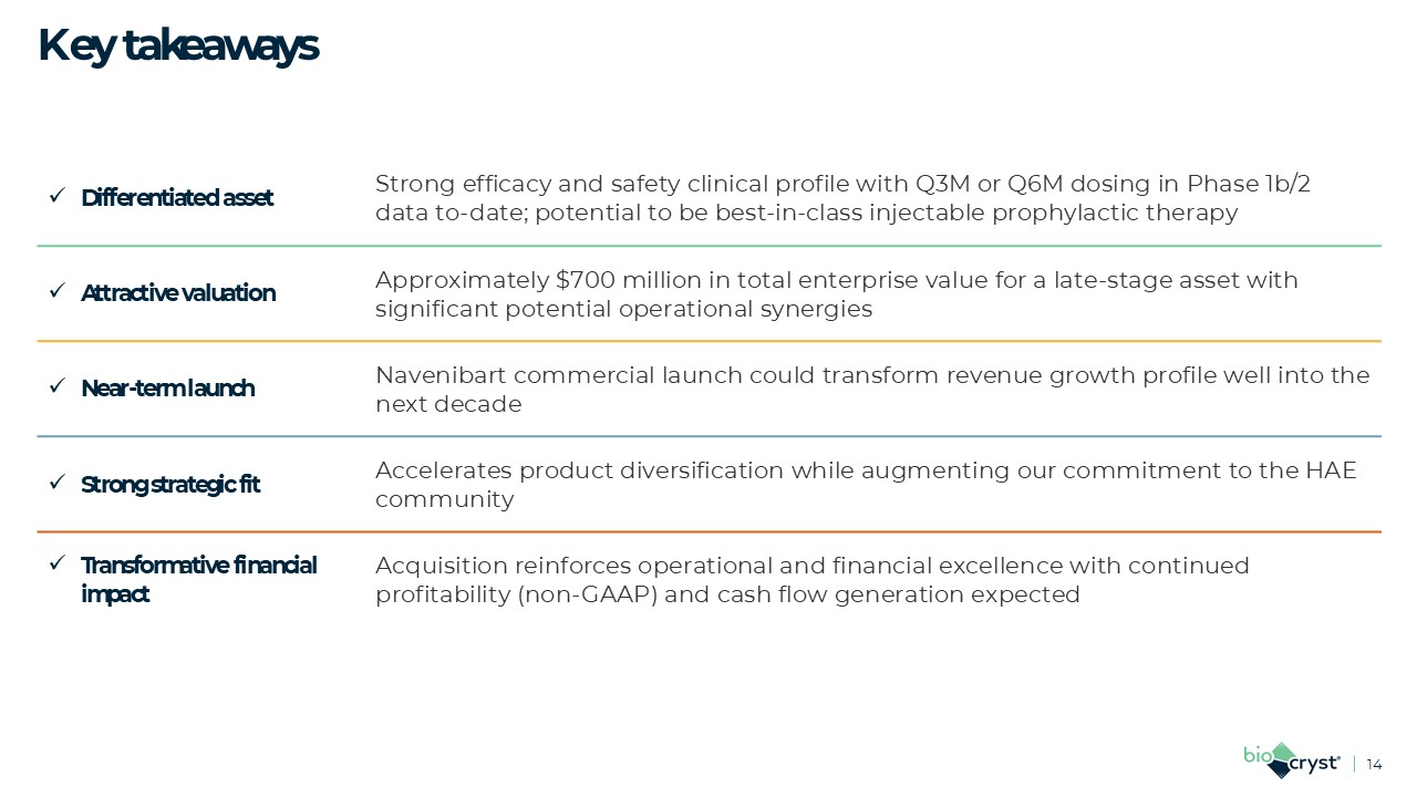 Significant opportunity for value creation   13  Financial overview of the acquisition of Astria  Implied value of $13 per share in cash and stock with total enterprise value of approximately $700 million  Astria stockholders expected to own 15% of proforma equity based on basic shares outstanding  Plan to seek strategic alternatives for STAR-0310 pipeline program  Terms  Transforms BioCryst’s revenue profile through the next decade  BioCryst expects to remain profitable (non-GAAP) and cash flow positive   Transaction expected to be significantly accretive to operating profit (non-GAAP) in first full year of launch  Financial Impact  Highly flexible and attractive cost of capital financing facility to fund a portion of the cash purchase price  Retains capacity for additional business development   Blackstone Strategic Financing  Transaction expected to close 1Q 2026