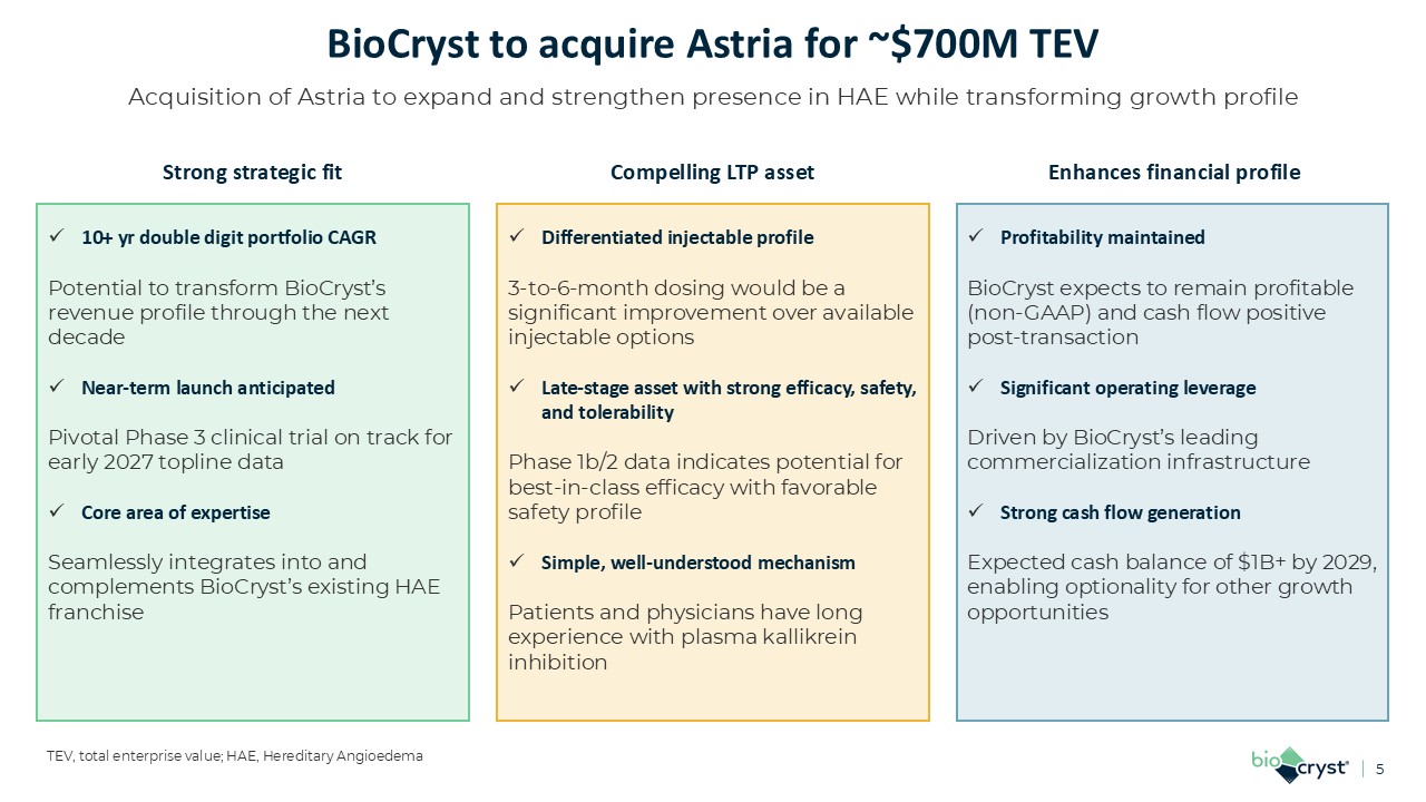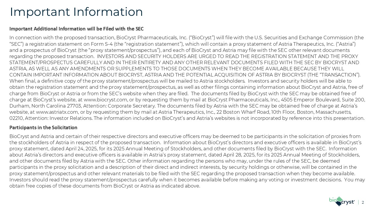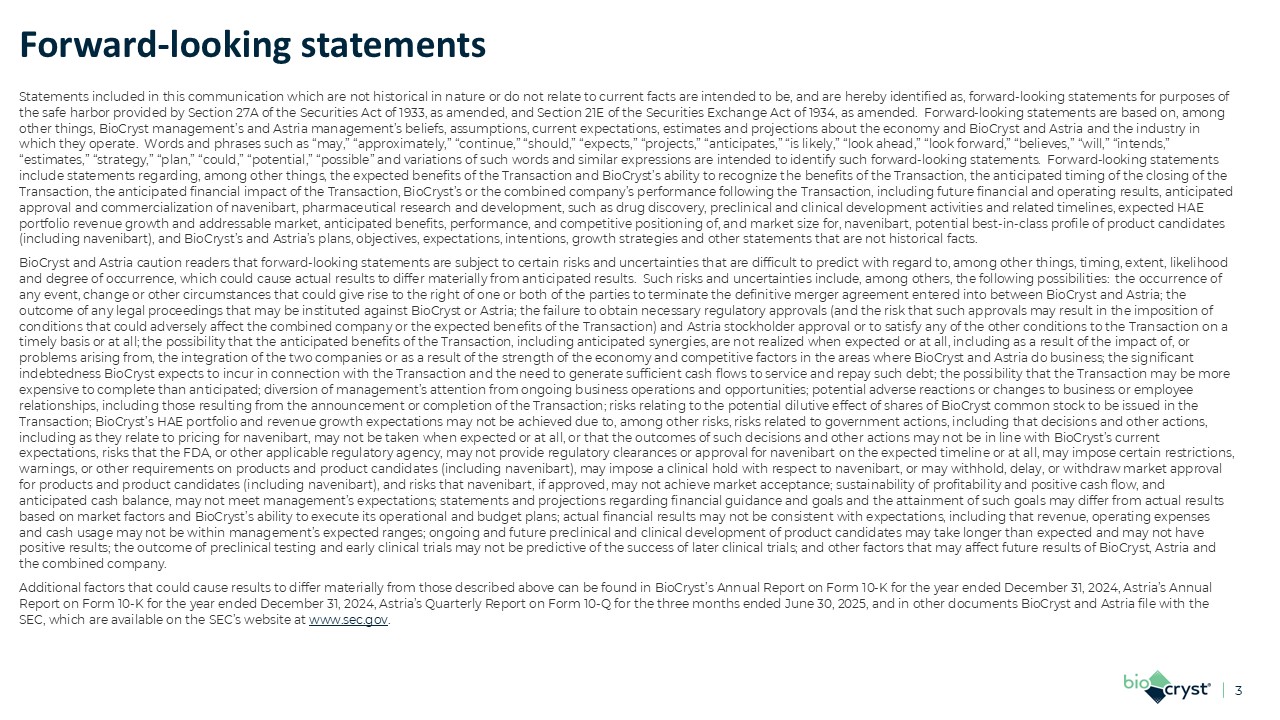 2  Important Additional Information will be Filed with the SEC   In connection with the proposed transaction, BioCryst Pharmaceuticals, Inc. (“BioCryst”) will file with the U.S. Securities and Exchange Commission (the “SEC”) a registration statement on Form S-4 (the “registration statement”), which will contain a proxy statement of Astria Therapeutics, Inc. (“Astria”) and a prospectus of BioCryst (the “proxy statement/prospectus”), and each of BioCryst and Astria may file with the SEC other relevant documents regarding the proposed transaction. INVESTORS AND SECURITY HOLDERS ARE URGED TO READ THE REGISTRATION STATEMENT AND THE PROXY STATEMENT/PROSPECTUS CAREFULLY AND IN THEIR ENTIRETY AND ANY OTHER RELEVANT DOCUMENTS FILED WITH THE SEC BY BIOCRYST AND ASTRIA, AS WELL AS ANY AMENDMENTS OR SUPPLEMENTS TO THOSE DOCUMENTS WHEN THEY BECOME AVAILABLE BECAUSE THEY WILL CONTAIN IMPORTANT INFORMATION ABOUT BIOCRYST, ASTRIA AND THE POTENTIAL ACQUISITION OF ASTRIA BY BIOCRYST (THE “TRANSACTION”). When final, a definitive copy of the proxy statement/prospectus will be mailed to Astria stockholders. Investors and security holders will be able to obtain the registration statement and the proxy statement/prospectus, as well as other filings containing information about BioCryst and Astria, free of charge from BioCryst or Astria or from the SEC’s website when they are filed. The documents filed by BioCryst with the SEC may be obtained free of charge at BioCryst’s website, at www.biocryst.com, or by requesting them by mail at BioCryst Pharmaceuticals, Inc., 4505 Emperor Boulevard, Suite 200, Durham, North Carolina 27703, Attention: Corporate Secretary. The documents filed by Astria with the SEC may be obtained free of charge at Astria’s website, at www.astriatx.com, or by requesting them by mail at Astria Therapeutics, Inc., 22 Boston Wharf Road, 10th Floor, Boston, Massachusetts, 02210, Attention: Investor Relations. The information included on BioCryst’s and Astria’s websites is not incorporated by reference into this presentation.  Participants in the Solicitation   BioCryst and Astria and certain of their respective directors and executive officers may be deemed to be participants in the solicitation of proxies from the stockholders of Astria in respect of the proposed transaction. Information about BioCryst’s directors and executive officers is available in BioCryst’s proxy statement, dated April 24, 2025, for its 2025 Annual Meeting of Stockholders, and other documents filed by BioCryst with the SEC. Information about Astria’s directors and executive officers is available in Astria’s proxy statement, dated April 28, 2025, for its 2025 Annual Meeting of Stockholders, and other documents filed by Astria with the SEC. Other information regarding the persons who may, under the rules of the SEC, be deemed participants in the proxy solicitation and a description of their direct and indirect interests, by security holdings or otherwise, will be contained in the proxy statement/prospectus and other relevant materials to be filed with the SEC regarding the proposed transaction when they become available. Investors should read the proxy statement/prospectus carefully when it becomes available before making any voting or investment decisions. You may obtain free copies of these documents from BioCryst or Astria as indicated above.  Important Information