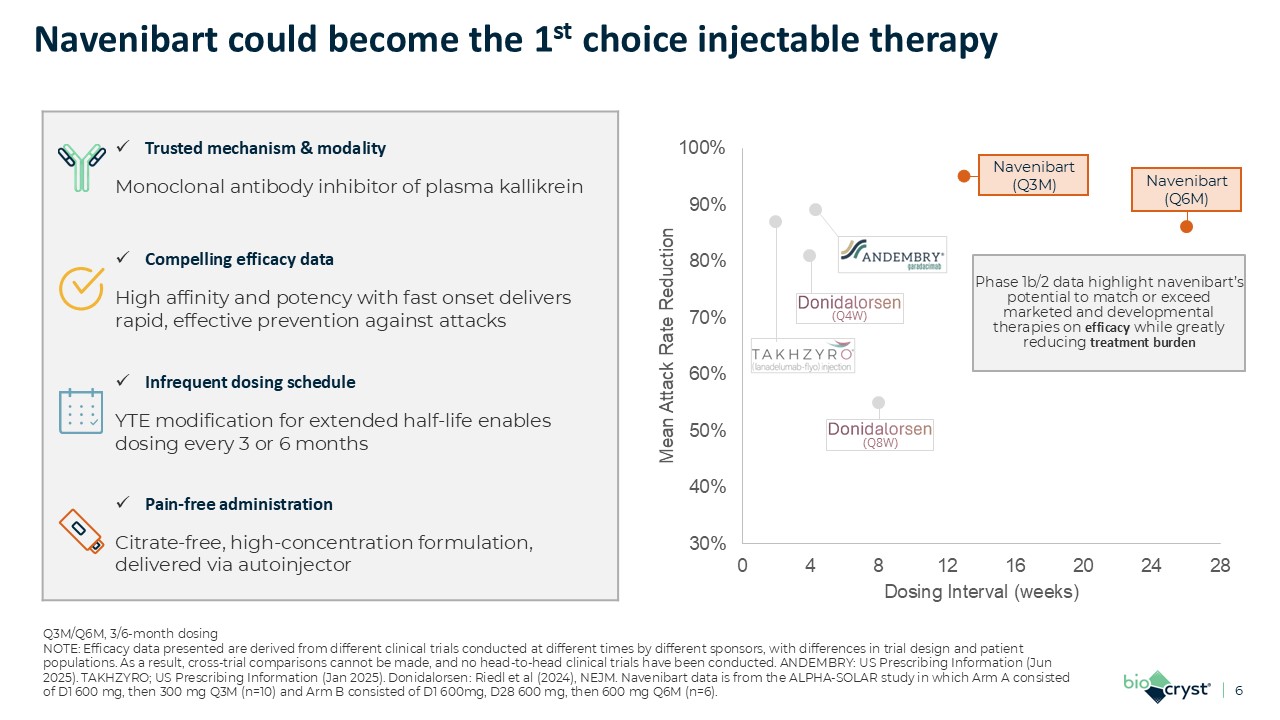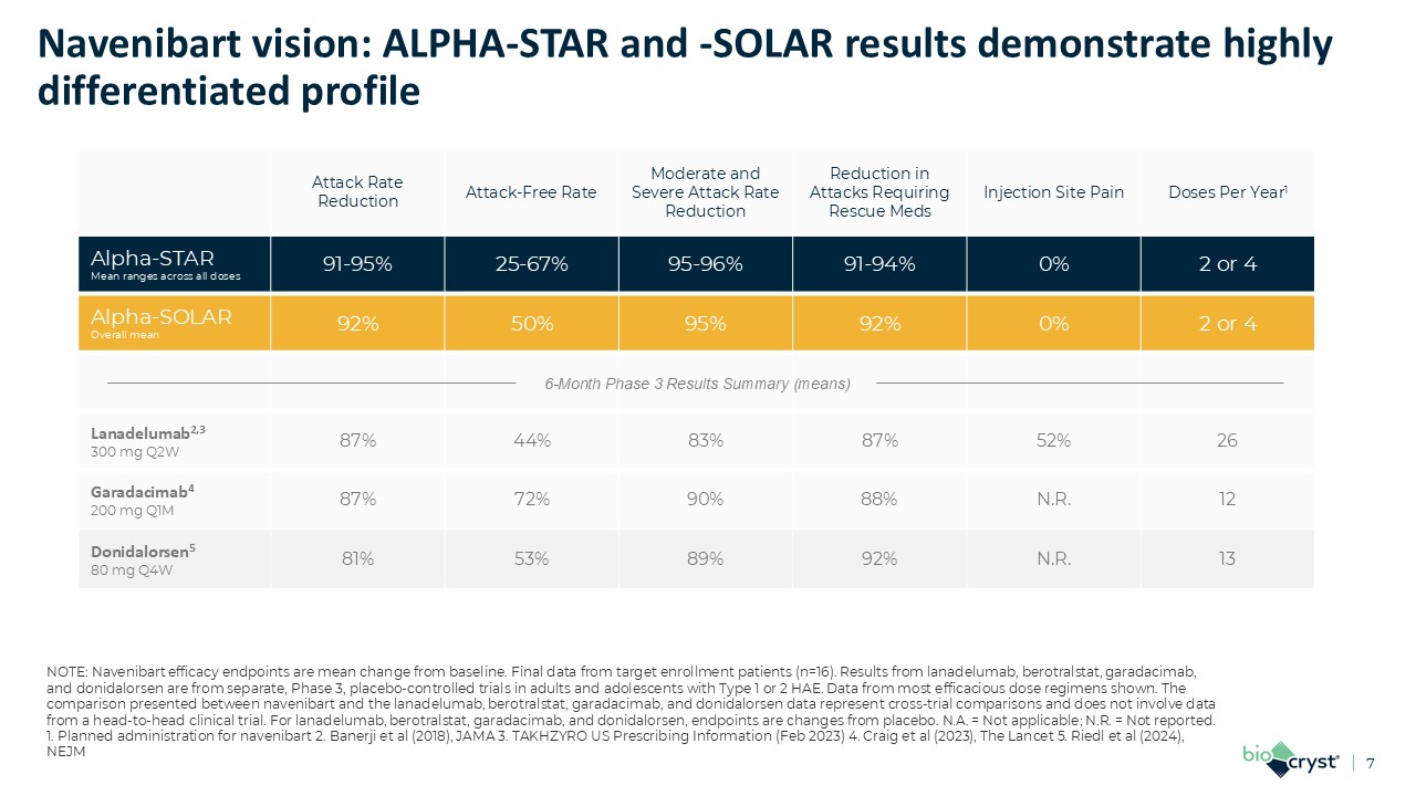 Navenibart could become the 1st choice injectable therapy  6  (Q8W)  (Q4W)  Trusted mechanism & modality  Monoclonal antibody inhibitor of plasma kallikrein  Compelling efficacy data  High affinity and potency with fast onset delivers rapid, effective prevention against attacks  Infrequent dosing schedule  YTE modification for extended half-life enables dosing every 3 or 6 months  Pain-free administration  Citrate-free, high-concentration formulation, delivered via autoinjector  Phase 1b/2 data highlight navenibart’s potential to match or exceed marketed and developmental therapies on efficacy while greatly reducing treatment burden  Q3M/Q6M, 3/6-month dosing  NOTE: Efficacy data presented are derived from different clinical trials conducted at different times by different sponsors, with differences in trial design and patient populations. As a result, cross-trial comparisons cannot be made, and no head-to-head clinical trials have been conducted. ANDEMBRY: US Prescribing Information (Jun 2025). TAKHZYRO; US Prescribing Information (Jan 2025). Donidalorsen: Riedl et al (2024), NEJM. Navenibart data is from the ALPHA-SOLAR study in which Arm A consisted of D1 600 mg, then 300 mg Q3M (n=10) and Arm B consisted of D1 600mg, D28 600 mg, then 600 mg Q6M (n=6).  Navenibart  (Q3M)  Navenibart  (Q6M)