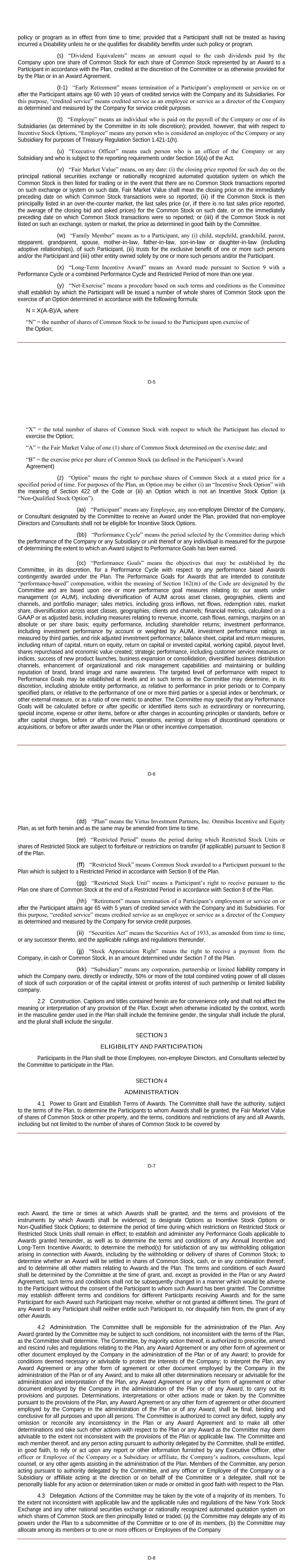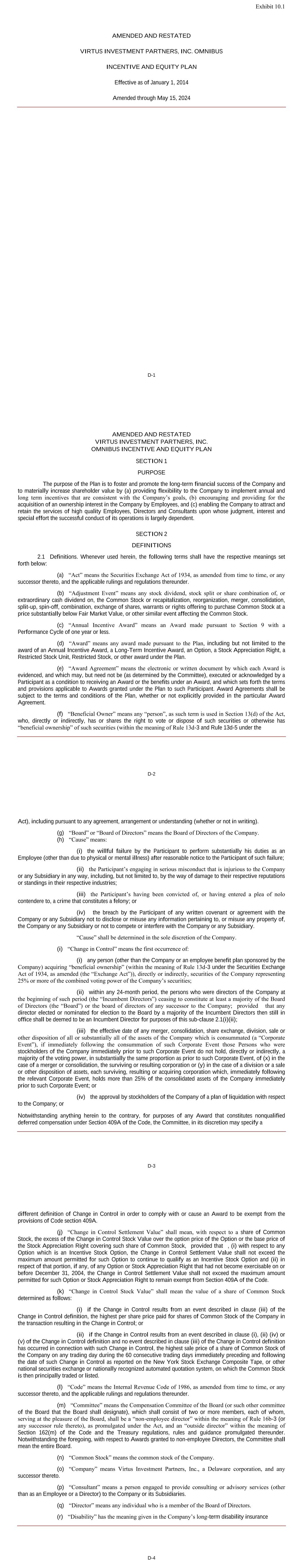 D-1 AMENDED AND RESTATED VIRTUS INVESTMENT PARTNERS, INC. OMNIBUS INCENTIVE AND EQUITY PLAN Effective as of January 1, 2014 Amended through May 15, 2024 Exhibit 10.1 D-2 AMENDED AND RESTATED VIRTUS INVESTMENT PARTNERS, INC. OMNIBUS INCENTIVE AND EQUITY PLAN SECTION 1 PURPOSE The purpose of the Plan is to foster and promote the long-term financial success of the Company and to materially increase shareholder value by (a) providing flexibility to the Company to implement annual and long term incentives that are consistent with the Company’s goals, (b) encouraging and providing for the acquisition of an ownership interest in the Company by Employees, and (c) enabling the Company to attract and retain the services of high quality Employees, Directors and Consultants upon whose judgment, interest and special effort the successful conduct of its operations is largely dependent. SECTION 2 DEFINITIONS 2.1 Definitions. Whenever used herein, the following terms shall have the respective meanings set forth below: (a) “Act” means the Securities Exchange Act of 1934, as amended from time to time, or any successor thereto, and the applicable rulings and regulations thereunder. (b) “Adjustment Event” means any stock dividend, stock split or share combination of, or extraordinary cash dividend on, the Common Stock or recapitalization, reorganization, merger, consolidation, split-up, spin-off, combination, exchange of shares, warrants or rights offering to purchase Common Stock at a price substantially below Fair Market Value, or other similar event affecting the Common Stock. (c) “Annual Incentive Award” means an Award made pursuant to Section 9 with a Performance Cycle of one year or less. (d) “Award” means any award made pursuant to the Plan, including but not limited to the award of an Annual Incentive Award, a Long-Term Incentive Award, an Option, a Stock Appreciation Right, a Restricted Stock Unit, Restricted Stock, or other award under the Plan. (e) “Award Agreement” means the electronic or written document by which each Award is evidenced, and which may, but need not be (as determined by the Committee), executed or acknowledged by a Participant as a condition to receiving an Award or the benefits under an Award, and which sets forth the terms and provisions applicable to Awards granted under the Plan to such Participant. Award Agreements shall be subject to the terms and conditions of the Plan, whether or not explicitly provided in the particular Award Agreement. (f) “Beneficial Owner” means any “person”, as such term is used in Section 13(d) of the Act, who, directly or indirectly, has or shares the right to vote or dispose of such securities or otherwise has “beneficial ownership” of such securities (within the meaning of Rule 13d-3 and Rule 13d-5 under the D-3 Act), including pursuant to any agreement, arrangement or understanding (whether or not in writing). (g) “Board” or “Board of Directors” means the Board of Directors of the Company. (h) “Cause” means: (i) the willful failure by the Participant to perform substantially his duties as an Employee (other than due to physical or mental illness) after reasonable notice to the Participant of such failure; (ii) the Participant’s engaging in serious misconduct that is injurious to the Company or any Subsidiary in any way, including, but not limited to, by the way of damage to their respective reputations or standings in their respective industries; (iii) the Participant’s having been convicted of, or having entered a plea of nolo contendere to, a crime that constitutes a felony; or (iv) the breach by the Participant of any written covenant or agreement with the Company or any Subsidiary not to disclose or misuse any information pertaining to, or misuse any property of, the Company or any Subsidiary or not to compete or interfere with the Company or any Subsidiary. “Cause” shall be determined in the sole discretion of the Company. (i) “Change in Control” means the first occurrence of: (i) any person (other than the Company or an employee benefit plan sponsored by the Company) acquiring “beneficial ownership” (within the meaning of Rule 13d-3 under the Securities Exchange Act of 1934, as amended (the “Exchange Act”)), directly or indirectly, securities of the Company representing 25% or more of the combined voting power of the Company’s securities; (ii) within any 24-month period, the persons who were directors of the Company at the beginning of such period (the “Incumbent Directors”) ceasing to constitute at least a majority of the Board of Directors (the “Board”) or the board of directors of any successor to the Company; provided that any director elected or nominated for election to the Board by a majority of the Incumbent Directors then still in office shall be deemed to be an Incumbent Director for purposes of this sub-clause 2.1(i)(ii); (iii) the effective date of any merger, consolidation, share exchange, division, sale or other disposition of all or substantially all of the assets of the Company which is consummated (a “Corporate Event”), if immediately following the consummation of such Corporate Event those Persons who were stockholders of the Company immediately prior to such Corporate Event do not hold, directly or indirectly, a majority of the voting power, in substantially the same proportion as prior to such Corporate Event, of (x) in the case of a merger or consolidation, the surviving or resulting corporation or (y) in the case of a division or a sale or other disposition of assets, each surviving, resulting or acquiring corporation which, immediately following the relevant Corporate Event, holds more than 25% of the consolidated assets of the Company immediately prior to such Corporate Event; or (iv) the approval by stockholders of the Company of a plan of liquidation with respect to the Company; or Notwithstanding anything herein to the contrary, for 