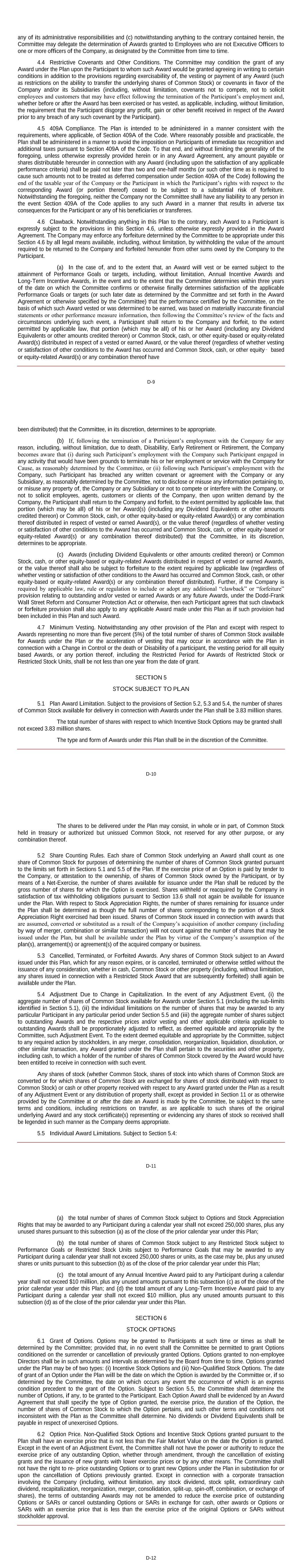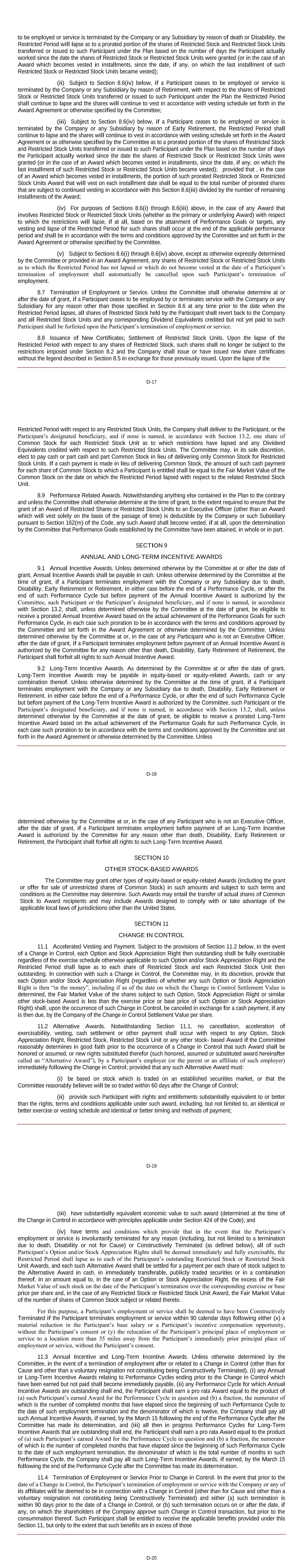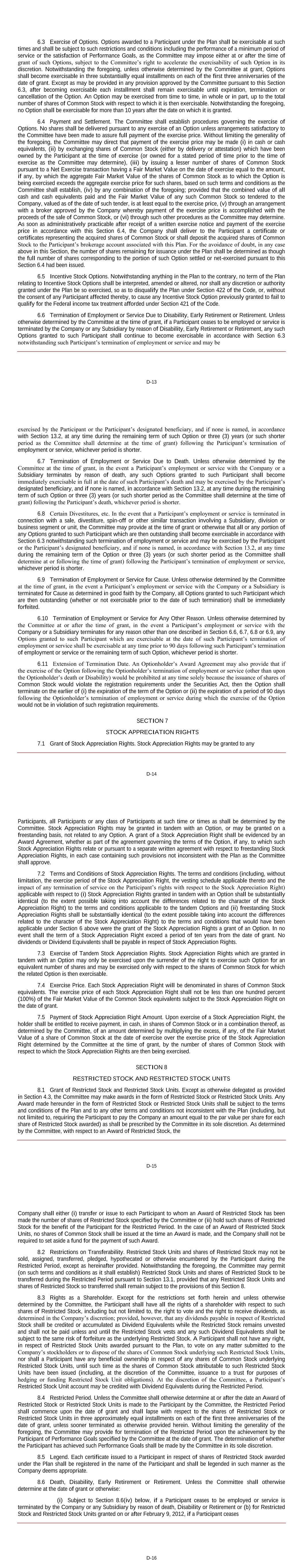 D-9 any of its administrative responsibilities and (c) notwithstanding anything to the contrary contained herein, the Committee may delegate the determination of Awards granted to Employees who are not Executive Officers to one or more officers of the Company, as designated by the Committee from time to time. 4.4 Restrictive Covenants and Other Conditions. The Committee may condition the grant of any Award under the Plan upon the Participant to whom such Award would be granted agreeing in writing to certain conditions in addition to the provisions regarding exercisability of, the vesting or payment of any Award (such as restrictions on the ability to transfer the underlying shares of Common Stock) or covenants in favor of the Company and/or its Subsidiaries (including, without limitation, covenants not to compete, not to solicit employees and customers that may have effect following the termination of the Participant’s employment and, whether before or after the Award has been exercised or has vested, as applicable, including, without limitation, the requirement that the Participant disgorge any profit, gain or other benefit received in respect of the Award prior to any breach of any such covenant by the Participant). 4.5 409A Compliance. The Plan is intended to be administered in a manner consistent with the requirements, where applicable, of Section 409A of the Code. Where reasonably possible and practicable, the Plan shall be administered in a manner to avoid the imposition on Participants of immediate tax recognition and additional taxes pursuant to Section 409A of the Code. To that end, and without limiting the generality of the foregoing, unless otherwise expressly provided herein or in any Award Agreement, any amount payable or shares distributable hereunder in connection with any Award (including upon the satisfaction of any applicable performance criteria) shall be paid not later than two and one-half months (or such other time as is required to cause such amounts not to be treated as deferred compensation under Section 409A of the Code) following the end of the taxable year of the Company or the Participant in which the Participant’s rights with respect to the corresponding Award (or portion thereof) ceased to be subject to a substantial risk of forfeiture. Notwithstanding the foregoing, neither the Company nor the Committee shall have any liability to any person in the event Section 409A of the Code applies to any such Award in a manner that results in adverse tax consequences for the Participant or any of his beneficiaries or transferees. 4.6 Clawback. Notwithstanding anything in this Plan to the contrary, each Award to a Participant is expressly subject to the provisions in this Section 4.6, unless otherwise expressly provided in the Award Agreement. The Company may enforce any forfeiture determined by the Committee to be appropriate under this Section 4.6 by all legal means available, including, without limitation, by withholding the value of the amount required to be returned to the Company and forfeited hereunder from other sums owed by the Company to the Participant. (a) In the case of, and to the extent that, an Award will vest or be earned subject to the attainment of Performance Goals or targets, including, without limitation, Annual Incentive Awards and Long-Term Incentive Awards, in the event and to the extent that the Committee determines within three years of the date on which the Committee confirms or otherwise finally determines satisfaction of the applicable Performance Goals or targets (or such later date as determined by the Committee and set forth in the Award Agreement or otherwise specified by the Committee) that the performance certified by the Committee, on the basis of which such Award vested or was determined to be earned, was based on materially inaccurate financial statements or other performance measure information, then following the Committee’s review of the facts and circumstances underlying such event, a Participant shall return to the Company and forfeit, to the extent permitted by applicable law, that portion (which may be all) of his or her Award (including any Dividend Equivalents or other amounts credited thereon) or Common Stock, cash, or other equity-based or equity-related Award(s) distributed in respect of a vested or earned Award, or the value thereof (regardless of whether vesting or satisfaction of other conditions to the Award has occurred and Common Stock, cash, or other equity‑ based or equity-related Award(s) or any combination thereof have D-10 been distributed) that the Committee, in its discretion, determines to be appropriate. (b) If, following the termination of a Participant’s employment with the Company for any reason, including, without limitation, due to death, Disability, Early Retirement or Retirement, the Company becomes aware that (i) during such Participant’s employment with the Company such Participant engaged in any activity that would have been grounds to terminate his or her employment or service with the Company for Cause, as reasonably determined by the Committee, or (ii) following such Participant’s employment with the Company, such Participant has breached any written covenant or agreement with the Company or any Subsidiary, as reasonably determined by the Committee, not to disclose or misuse any information pertaining to, or misuse any property of, the Company or any Subsidiary or not to compete or interfere with the Company, or not to solicit employees, agents, customers or clients of the Company, then upon written demand by the Company, the Participant shall return to the Company and forfeit, to the extent permitted by applicable law, that portion (which may be all) of his or her Award(s) (including any Dividend Equivalents or other amounts credited thereon) or Common Stock, cash, or other equity-based or equity-related Award(s) or any combination thereof distributed in respect of vested or 