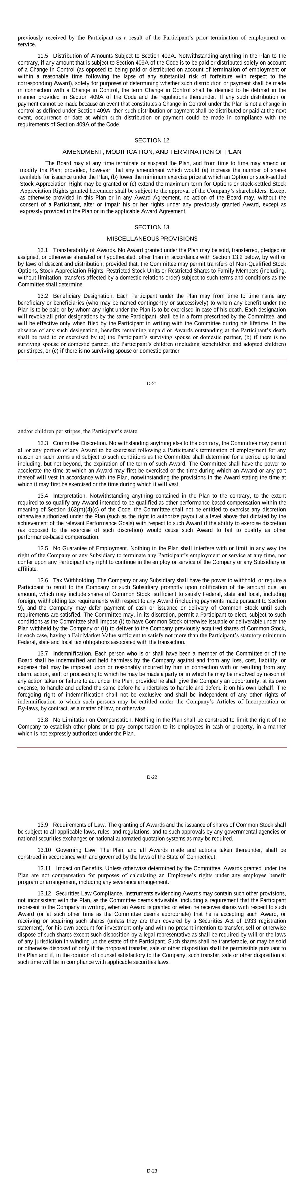 D-21 previously received by the Participant as a result of the Participant’s prior termination of employment or service. 11.5 Distribution of Amounts Subject to Section 409A. Notwithstanding anything in the Plan to the contrary, if any amount that is subject to Section 409A of the Code is to be paid or distributed solely on account of a Change in Control (as opposed to being paid or distributed on account of termination of employment or within a reasonable time following the lapse of any substantial risk of forfeiture with respect to the corresponding Award), solely for purposes of determining whether such distribution or payment shall be made in connection with a Change in Control, the term Change in Control shall be deemed to be defined in the manner provided in Section 409A of the Code and the regulations thereunder. If any such distribution or payment cannot be made because an event that constitutes a Change in Control under the Plan is not a change in control as defined under Section 409A, then such distribution or payment shall be distributed or paid at the next event, occurrence or date at which such distribution or payment could be made in compliance with the requirements of Section 409A of the Code. SECTION 12 AMENDMENT, MODIFICATION, AND TERMINATION OF PLAN The Board may at any time terminate or suspend the Plan, and from time to time may amend or modify the Plan; provided, however, that any amendment which would (a) increase the number of shares available for issuance under the Plan, (b) lower the minimum exercise price at which an Option or stock-settled Stock Appreciation Right may be granted or (c) extend the maximum term for Options or stock-settled Stock Appreciation Rights granted hereunder shall be subject to the approval of the Company’s shareholders. Except as otherwise provided in this Plan or in any Award Agreement, no action of the Board may, without the consent of a Participant, alter or impair his or her rights under any previously granted Award, except as expressly provided in the Plan or in the applicable Award Agreement. SECTION 13 MISCELLANEOUS PROVISIONS 13.1 Transferability of Awards. No Award granted under the Plan may be sold, transferred, pledged or assigned, or otherwise alienated or hypothecated, other than in accordance with Section 13.2 below, by will or by laws of descent and distribution; provided that, the Committee may permit transfers of Non-Qualified Stock Options, Stock Appreciation Rights, Restricted Stock Units or Restricted Shares to Family Members (including, without limitation, transfers affected by a domestic relations order) subject to such terms and conditions as the Committee shall determine. 13.2 Beneficiary Designation. Each Participant under the Plan may from time to time name any beneficiary or beneficiaries (who may be named contingently or successively) to whom any benefit under the Plan is to be paid or by whom any right under the Plan is to be exercised in case of his death. Each designation will revoke all prior designations by the same Participant, shall be in a form prescribed by the Committee, and will be effective only when filed by the Participant in writing with the Committee during his lifetime. In the absence of any such designation, benefits remaining unpaid or Awards outstanding at the Participant’s death shall be paid to or exercised by (a) the Participant’s surviving spouse or domestic partner, (b) if there is no surviving spouse or domestic partner, the Participant’s children (including stepchildren and adopted children) per stirpes, or (c) if there is no surviving spouse or domestic partner D-22 and/or children per stirpes, the Participant’s estate. 13.3 Committee Discretion. Notwithstanding anything else to the contrary, the Committee may permit all or any portion of any Award to be exercised following a Participant’s termination of employment for any reason on such terms and subject to such conditions as the Committee shall determine for a period up to and including, but not beyond, the expiration of the term of such Award. The Committee shall have the power to accelerate the time at which an Award may first be exercised or the time during which an Award or any part thereof will vest in accordance with the Plan, notwithstanding the provisions in the Award stating the time at which it may first be exercised or the time during which it will vest. 13.4 Interpretation. Notwithstanding anything contained in the Plan to the contrary, to the extent required to so qualify any Award intended to be qualified as other performance-based compensation within the meaning of Section 162(m)(4)(c) of the Code, the Committee shall not be entitled to exercise any discretion otherwise authorized under the Plan (such as the right to authorize payout at a level above that dictated by the achievement of the relevant Performance Goals) with respect to such Award if the ability to exercise discretion (as opposed to the exercise of such discretion) would cause such Award to fail to qualify as other performance-based compensation. 13.5 No Guarantee of Employment. Nothing in the Plan shall interfere with or limit in any way the right of the Company or any Subsidiary to terminate any Participant’s employment or service at any time, nor confer upon any Participant any right to continue in the employ or service of the Company or any Subsidiary or affiliate. 13.6 Tax Withholding. The Company or any Subsidiary shall have the power to withhold, or require a Participant to remit to the Company or such Subsidiary promptly upon notification of the amount due, an amount, which may include shares of Common Stock, sufficient to satisfy Federal, state and local, including foreign, withholding tax requirements with respect to any Award (including payments made pursuant to Section 9), and the Company may defer payment of cash or issuance or delivery of Common Stock until such requirements are satisfied. The Committee may, in its discreti