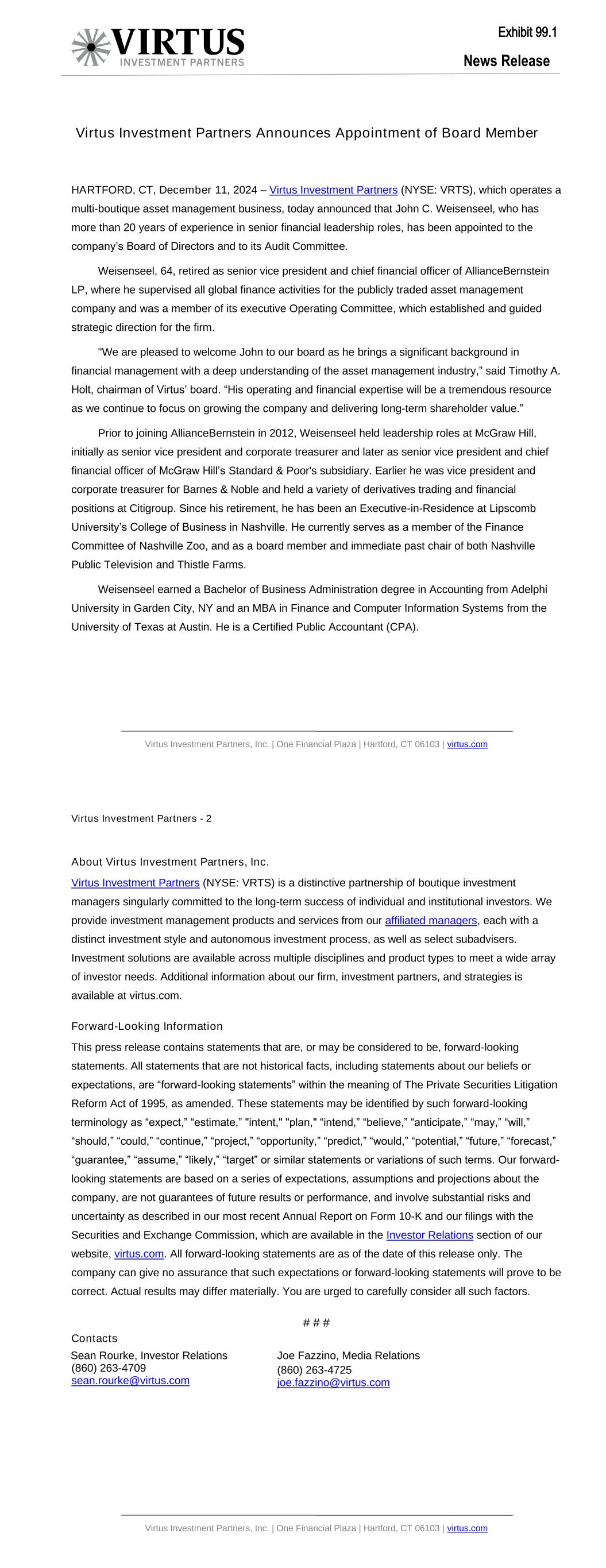 News Release Virtus Investment Partners, Inc. | One Financial Plaza | Hartford, CT 06103 | virtus.com Virtus Investment Partners Announces Appointment of Board Member HARTFORD, CT, December 11, 2024 – Virtus Investment Partners (NYSE: VRTS), which operates a multi-boutique asset management business, today announced that John C. Weisenseel, who has more than 20 years of experience in senior financial leadership roles, has been appointed to the company’s Board of Directors and to its Audit Committee. Weisenseel, 64, retired as senior vice president and chief financial officer of AllianceBernstein LP, where he supervised all global finance activities for the publicly traded asset management company and was a member of its executive Operating Committee, which established and guided strategic direction for the firm. "We are pleased to welcome John to our board as he brings a significant background in financial management with a deep understanding of the asset management industry,” said Timothy A. Holt, chairman of Virtus’ board. “His operating and financial expertise will be a tremendous resource as we continue to focus on growing the company and delivering long-term shareholder value.” Prior to joining AllianceBernstein in 2012, Weisenseel held leadership roles at McGraw Hill, initially as senior vice president and corporate treasurer and later as senior vice president and chief financial officer of McGraw Hill’s Standard & Poor's subsidiary. Earlier he was vice president and corporate treasurer for Barnes & Noble and held a variety of derivatives trading and financial positions at Citigroup. Since his retirement, he has been an Executive-in-Residence at Lipscomb University’s College of Business in Nashville. He currently serves as a member of the Finance Committee of Nashville Zoo, and as a board member and immediate past chair of both Nashville Public Television and Thistle Farms. Weisenseel earned a Bachelor of Business Administration degree in Accounting from Adelphi University in Garden City, NY and an MBA in Finance and Computer Information Systems from the University of Texas at Austin. He is a Certified Public Accountant (CPA). Exhibit 99.1 Virtus Investment Partners - 2 Virtus Investment Partners, Inc. | One Financial Plaza | Hartford, CT 06103 | virtus.com About Virtus Investment Partners, Inc. Virtus Investment Partners (NYSE: VRTS) is a distinctive partnership of boutique investment managers singularly committed to the long-term success of individual and institutional investors. We provide investment management products and services from our affiliated managers, each with a distinct investment style and autonomous investment process, as well as select subadvisers. Investment solutions are available across multiple disciplines and product types to meet a wide array of investor needs. Additional information about our firm, investment partners, and strategies is available at virtus.com. Forward-Looking Information This press release contains statements that are, or may be considered to be, forward-looking statements. All statements that are not historical facts, including statements about our beliefs or expectations, are “forward-looking statements” within the meaning of The Private Securities Litigation Reform Act of 1995, as amended. These statements may be identified by such forward-looking terminology as “expect,” “estimate,” "intent," "plan," “intend,” “believe,” “anticipate,” “may,” “will,” “should,” “could,” “continue,” “project,” “opportunity,” “predict,” “would,” “potential,” “future,” “forecast,” “guarantee,” “assume,” “likely,” “target” or similar statements or variations of such terms. Our forward- looking statements are based on a series of expectations, assumptions and projections about the company, are not guarantees of future results or performance, and involve substantial risks and uncertainty as described in our most recent Annual Report on Form 10-K and our filings with the Securities and Exchange Commission, which are available in the Investor Relations section of our website, virtus.com. All forward-looking statements are as of the date of this release only. The company can give no assurance that such expectations or forward-looking statements will prove to be correct. Actual results may differ materially. You are urged to carefully consider all such factors. # # # Contacts Sean Rourke, Investor Relations (860) 263-4709 sean.rourke@virtus.com Joe Fazzino, Media Relations (860) 263-4725 joe.fazzino@virtus.com