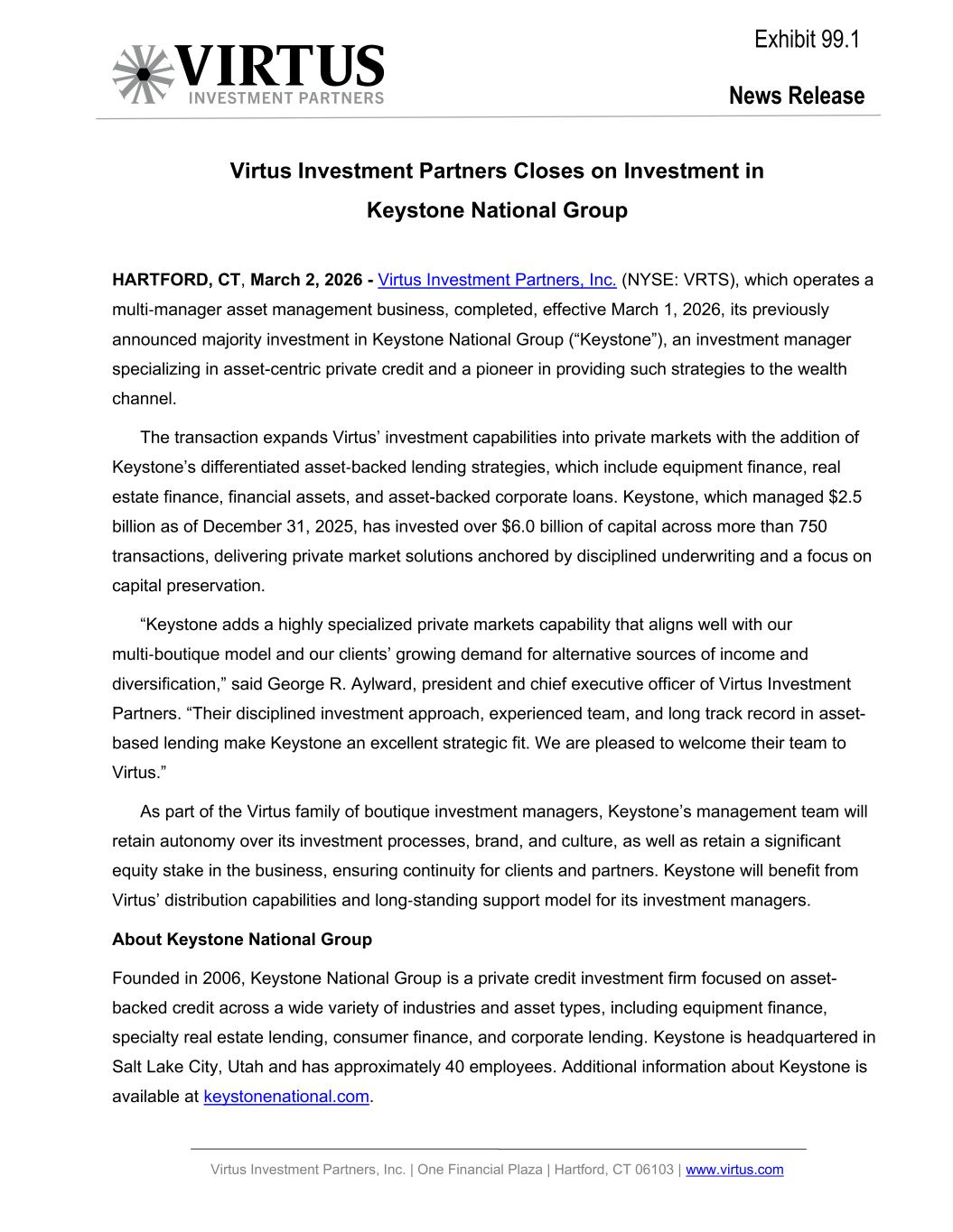 News Release Virtus Investment Partners, Inc. | One Financial Plaza | Hartford, CT 06103 | www.virtus.com Virtus Investment Partners Closes on Investment in Keystone National Group HARTFORD, CT, March 2, 2026 - Virtus Investment Partners, Inc. (NYSE: VRTS), which operates a multi‑manager asset management business, completed, effective March 1, 2026, its previously announced majority investment in Keystone National Group (“Keystone”), an investment manager specializing in asset-centric private credit and a pioneer in providing such strategies to the wealth channel. The transaction expands Virtus’ investment capabilities into private markets with the addition of Keystone’s differentiated asset‑backed lending strategies, which include equipment finance, real estate finance, financial assets, and asset-backed corporate loans. Keystone, which managed $2.5 billion as of December 31, 2025, has invested over $6.0 billion of capital across more than 750 transactions, delivering private market solutions anchored by disciplined underwriting and a focus on capital preservation. “Keystone adds a highly specialized private markets capability that aligns well with our multi‑boutique model and our clients’ growing demand for alternative sources of income and diversification,” said George R. Aylward, president and chief executive officer of Virtus Investment Partners. “Their disciplined investment approach, experienced team, and long track record in asset- based lending make Keystone an excellent strategic fit. We are pleased to welcome their team to Virtus.” As part of the Virtus family of boutique investment managers, Keystone’s management team will retain autonomy over its investment processes, brand, and culture, as well as retain a significant equity stake in the business, ensuring continuity for clients and partners. Keystone will benefit from Virtus’ distribution capabilities and long‑standing support model for its investment managers. About Keystone National Group Founded in 2006, Keystone National Group is a private credit investment firm focused on asset- backed credit across a wide variety of industries and asset types, including equipment finance, specialty real estate lending, consumer finance, and corporate lending. Keystone is headquartered in Salt Lake City, Utah and has approximately 40 employees. Additional information about Keystone is available at keystonenational.com. Exhibit 99.1