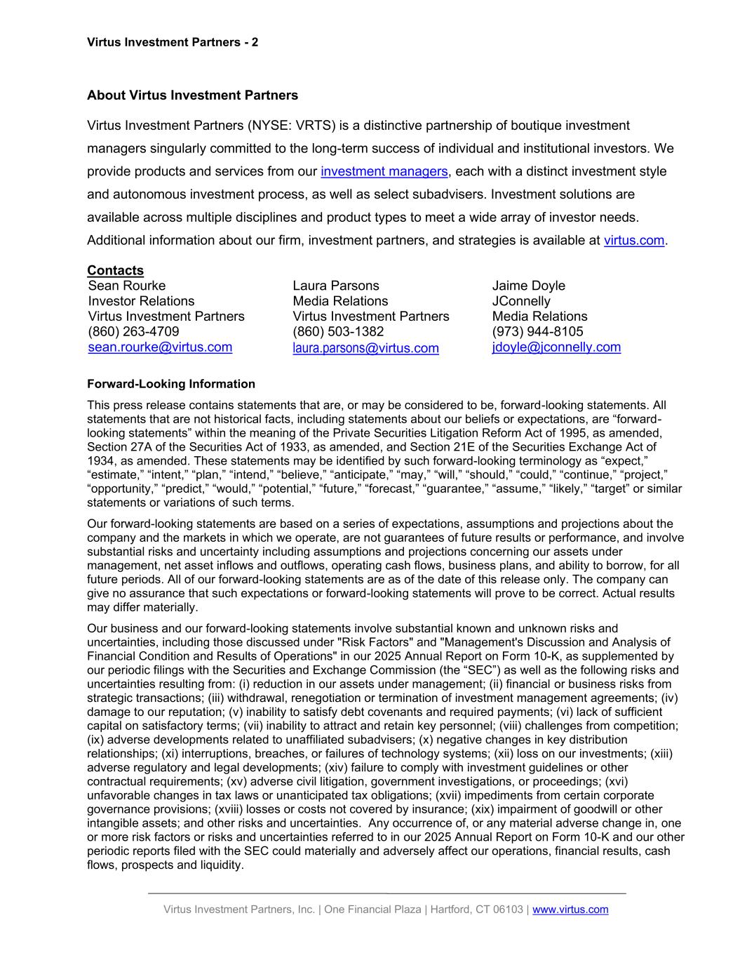 Virtus Investment Partners - 2 Virtus Investment Partners, Inc. | One Financial Plaza | Hartford, CT 06103 | www.virtus.com About Virtus Investment Partners Virtus Investment Partners (NYSE: VRTS) is a distinctive partnership of boutique investment managers singularly committed to the long-term success of individual and institutional investors. We provide products and services from our investment managers, each with a distinct investment style and autonomous investment process, as well as select subadvisers. Investment solutions are available across multiple disciplines and product types to meet a wide array of investor needs. Additional information about our firm, investment partners, and strategies is available at virtus.com. Contacts Sean Rourke Investor Relations Virtus Investment Partners (860) 263-4709 sean.rourke@virtus.com Laura Parsons Media Relations Virtus Investment Partners (860) 503-1382 laura.parsons@virtus.com Jaime Doyle JConnelly Media Relations (973) 944-8105 jdoyle@jconnelly.com Forward-Looking Information This press release contains statements that are, or may be considered to be, forward-looking statements. All statements that are not historical facts, including statements about our beliefs or expectations, are “forward- looking statements” within the meaning of the Private Securities Litigation Reform Act of 1995, as amended, Section 27A of the Securities Act of 1933, as amended, and Section 21E of the Securities Exchange Act of 1934, as amended. These statements may be identified by such forward-looking terminology as “expect,” “estimate,” “intent,” “plan,” “intend,” “believe,” “anticipate,” “may,” “will,” “should,” “could,” “continue,” “project,” “opportunity,” “predict,” “would,” “potential,” “future,” “forecast,” “guarantee,” “assume,” “likely,” “target” or similar statements or variations of such terms. Our forward-looking statements are based on a series of expectations, assumptions and projections about the company and the markets in which we operate, are not guarantees of future results or performance, and involve substantial risks and uncertainty including assumptions and projections concerning our assets under management, net asset inflows and outflows, operating cash flows, business plans, and ability to borrow, for all future periods. All of our forward-looking statements are as of the date of this release only. The company can give no assurance that such expectations or forward-looking statements will prove to be correct. Actual results may differ materially. Our business and our forward-looking statements involve substantial known and unknown risks and uncertainties, including those discussed under "Risk Factors" and "Management's Discussion and Analysis of Financial Condition and Results of Operations" in our 2025 Annual Report on Form 10-K, as supplemented by our periodic filings with the Securities and Exchange Commission (the “SEC”) as well as the following risks and uncertainties resulting from: (i) reduction in our assets under management; (ii) financial or business risks from strategic transactions; (iii) withdrawal, renegotiation or termination of investment management agreements; (iv) damage to our reputation; (v) inability to satisfy debt covenants and required payments; (vi) lack of sufficient capital on satisfactory terms; (vii) inability to attract and retain key personnel; (viii) challenges from competition; (ix) adverse developments related to unaffiliated subadvisers; (x) negative changes in key distribution relationships; (xi) interruptions, breaches, or failures of technology systems; (xii) loss on our investments; (xiii) adverse regulatory and legal developments; (xiv) failure to comply with investment guidelines or other contractual requirements; (xv) adverse civil litigation, government investigations, or proceedings; (xvi) unfavorable changes in tax laws or unanticipated tax obligations; (xvii) impediments from certain corporate governance provisions; (xviii) losses or costs not covered by insurance; (xix) impairment of goodwill or other intangible assets; and other risks and uncertainties. Any occurrence of, or any material adverse change in, one or more risk factors or risks and uncertainties referred to in our 2025 Annual Report on Form 10-K and our other periodic reports filed with the SEC could materially and adversely affect our operations, financial results, cash flows, prospects and liquidity.