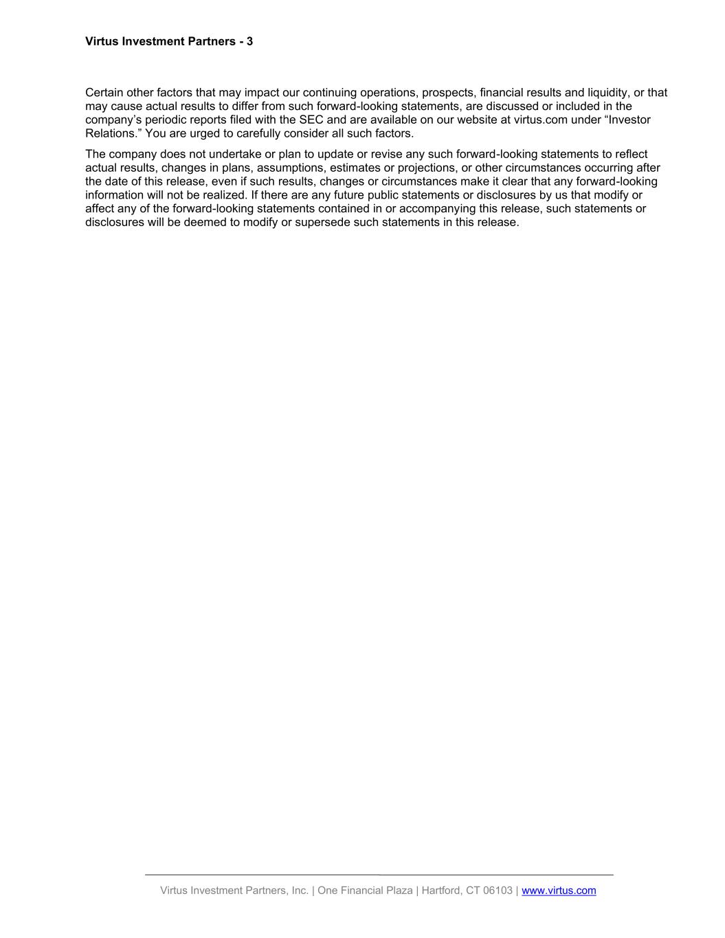 Virtus Investment Partners - 3 Virtus Investment Partners, Inc. | One Financial Plaza | Hartford, CT 06103 | www.virtus.com Certain other factors that may impact our continuing operations, prospects, financial results and liquidity, or that may cause actual results to differ from such forward-looking statements, are discussed or included in the company’s periodic reports filed with the SEC and are available on our website at virtus.com under “Investor Relations.” You are urged to carefully consider all such factors. The company does not undertake or plan to update or revise any such forward-looking statements to reflect actual results, changes in plans, assumptions, estimates or projections, or other circumstances occurring after the date of this release, even if such results, changes or circumstances make it clear that any forward-looking information will not be realized. If there are any future public statements or disclosures by us that modify or affect any of the forward-looking statements contained in or accompanying this release, such statements or disclosures will be deemed to modify or supersede such statements in this release.