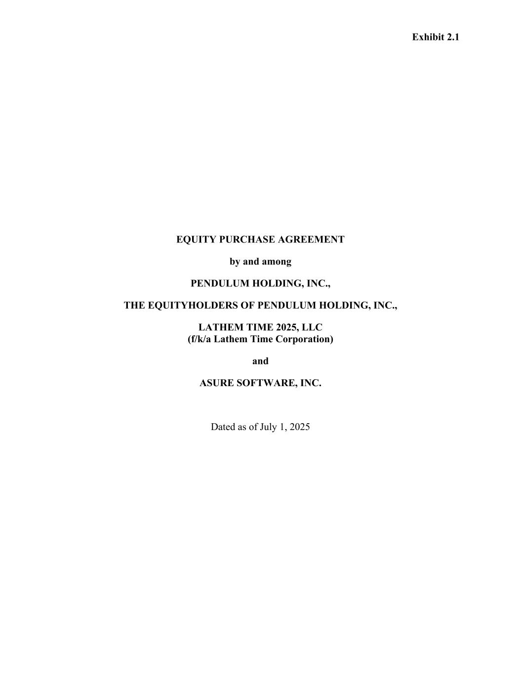Exhibit 2.1 EQUITY PURCHASE AGREEMENT by and among PENDULUM HOLDING, INC., THE EQUITYHOLDERS OF PENDULUM HOLDING, INC., LATHEM TIME 2025, LLC (f/k/a Lathem Time Corporation) and ASURE SOFTWARE, INC. Dated as of July 1, 2025