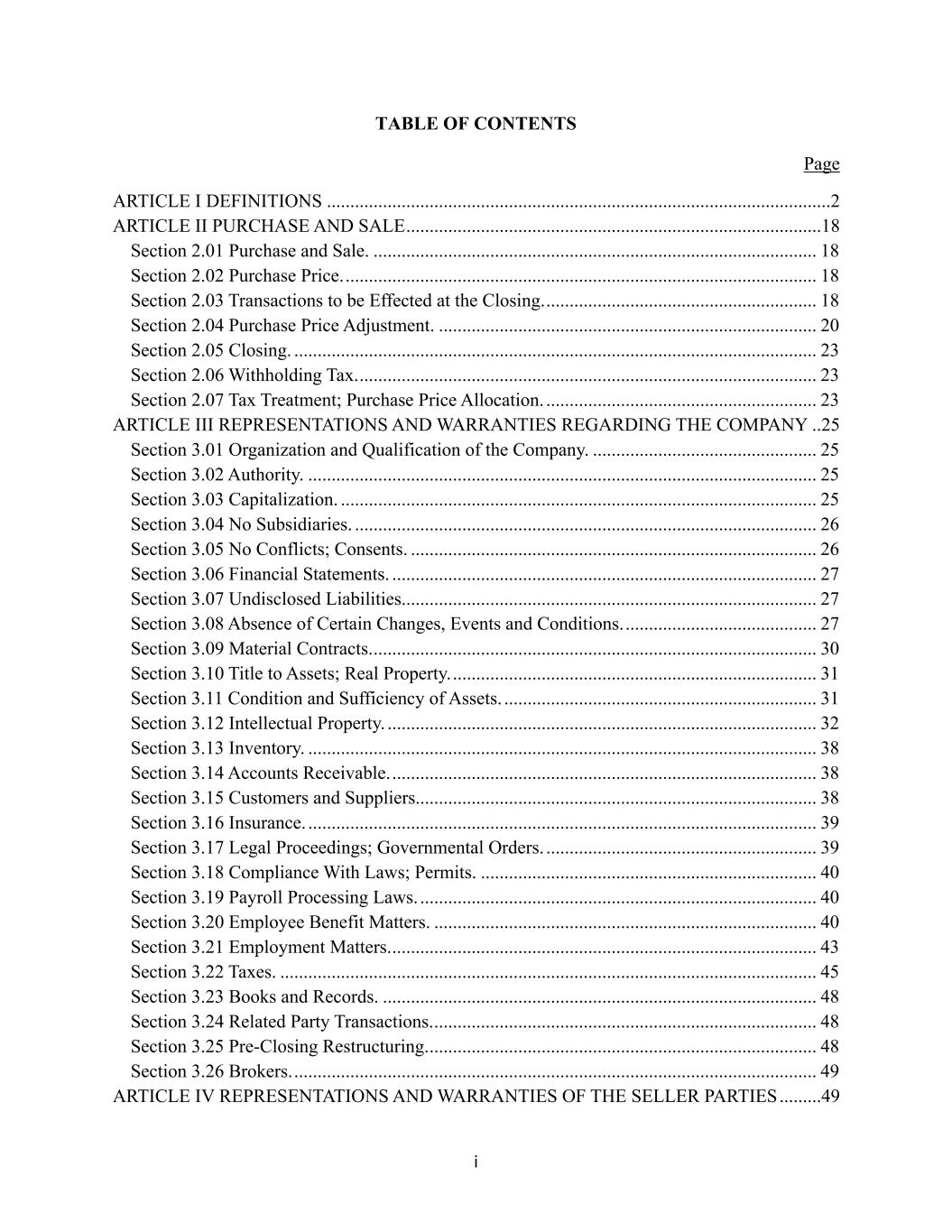 i TABLE OF CONTENTS Page ARTICLE I DEFINITIONS ............................................................................................................2 ARTICLE II PURCHASE AND SALE .........................................................................................18 Section 2.01 Purchase and Sale. ............................................................................................... 18 Section 2.02 Purchase Price. ..................................................................................................... 18 Section 2.03 Transactions to be Effected at the Closing. .......................................................... 18 Section 2.04 Purchase Price Adjustment. ................................................................................. 20 Section 2.05 Closing. ................................................................................................................ 23 Section 2.06 Withholding Tax. .................................................................................................. 23 Section 2.07 Tax Treatment; Purchase Price Allocation. .......................................................... 23 ARTICLE III REPRESENTATIONS AND WARRANTIES REGARDING THE COMPANY ..25 Section 3.01 Organization and Qualification of the Company. ................................................ 25 Section 3.02 Authority. ............................................................................................................. 25 Section 3.03 Capitalization. ...................................................................................................... 25 Section 3.04 No Subsidiaries. ................................................................................................... 26 Section 3.05 No Conflicts; Consents. ....................................................................................... 26 Section 3.06 Financial Statements. ........................................................................................... 27 Section 3.07 Undisclosed Liabilities......................................................................................... 27 Section 3.08 Absence of Certain Changes, Events and Conditions. ......................................... 27 Section 3.09 Material Contracts. ............................................................................................... 30 Section 3.10 Title to Assets; Real Property. .............................................................................. 31 Section 3.11 Condition and Sufficiency of Assets. ................................................................... 31 Section 3.12 Intellectual Property. ............................................................................................ 32 Section 3.13 Inventory. ............................................................................................................. 38 Section 3.14 Accounts Receivable. ........................................................................................... 38 Section 3.15 Customers and Suppliers...................................................................................... 38 Section 3.16 Insurance. ............................................................................................................. 39 Section 3.17 Legal Proceedings; Governmental Orders. .......................................................... 39 Section 3.18 Compliance With Laws; Permits. ........................................................................ 40 Section 3.19 Payroll Processing Laws. ..................................................................................... 40 Section 3.20 Employee Benefit Matters. .................................................................................. 40 Section 3.21 Employment Matters. ........................................................................................... 43 Section 3.22 Taxes. ................................................................................................................... 45 Section 3.23 Books and Records. ............................................................................................. 48 Section 3.24 Related Party Transactions. .................................................................................. 48 Section 3.25 Pre-Closing Restructuring. ................................................................................... 48 Section 3.26 Brokers. ................................................................................................................ 49 ARTICLE IV REPRESENTATIONS AND WARRANTIES OF THE SELLER PARTIES .........49