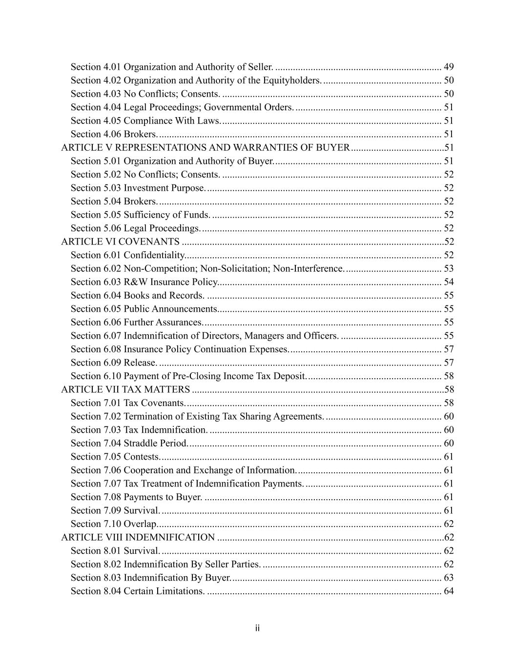 ii Section 4.01 Organization and Authority of Seller. .................................................................. 49 Section 4.02 Organization and Authority of the Equityholders. ............................................... 50 Section 4.03 No Conflicts; Consents. ....................................................................................... 50 Section 4.04 Legal Proceedings; Governmental Orders. .......................................................... 51 Section 4.05 Compliance With Laws. ....................................................................................... 51 Section 4.06 Brokers. ................................................................................................................ 51 ARTICLE V REPRESENTATIONS AND WARRANTIES OF BUYER .....................................51 Section 5.01 Organization and Authority of Buyer. .................................................................. 51 Section 5.02 No Conflicts; Consents. ....................................................................................... 52 Section 5.03 Investment Purpose. ............................................................................................. 52 Section 5.04 Brokers. ................................................................................................................ 52 Section 5.05 Sufficiency of Funds. ........................................................................................... 52 Section 5.06 Legal Proceedings. ............................................................................................... 52 ARTICLE VI COVENANTS ........................................................................................................52 Section 6.01 Confidentiality. ..................................................................................................... 52 Section 6.02 Non-Competition; Non-Solicitation; Non-Interference. ...................................... 53 Section 6.03 R&W Insurance Policy. ........................................................................................ 54 Section 6.04 Books and Records. ............................................................................................. 55 Section 6.05 Public Announcements. ........................................................................................ 55 Section 6.06 Further Assurances. .............................................................................................. 55 Section 6.07 Indemnification of Directors, Managers and Officers. ........................................ 55 Section 6.08 Insurance Policy Continuation Expenses. ............................................................ 57 Section 6.09 Release. ................................................................................................................ 57 Section 6.10 Payment of Pre-Closing Income Tax Deposit. ..................................................... 58 ARTICLE VII TAX MATTERS ....................................................................................................58 Section 7.01 Tax Covenants. ..................................................................................................... 58 Section 7.02 Termination of Existing Tax Sharing Agreements. .............................................. 60 Section 7.03 Tax Indemnification. ............................................................................................ 60 Section 7.04 Straddle Period. .................................................................................................... 60 Section 7.05 Contests. ............................................................................................................... 61 Section 7.06 Cooperation and Exchange of Information. ......................................................... 61 Section 7.07 Tax Treatment of Indemnification Payments. ...................................................... 61 Section 7.08 Payments to Buyer. .............................................................................................. 61 Section 7.09 Survival. ............................................................................................................... 61 Section 7.10 Overlap. ................................................................................................................ 62 ARTICLE VIII INDEMNIFICATION ..........................................................................................62 Section 8.01 Survival. ............................................................................................................... 62 Section 8.02 Indemnification By Seller Parties. ....................................................................... 62 Section 8.03 Indemnification By Buyer. ................................................................................... 63 Section 8.04 Certain Limitations. ............................................................................................. 64