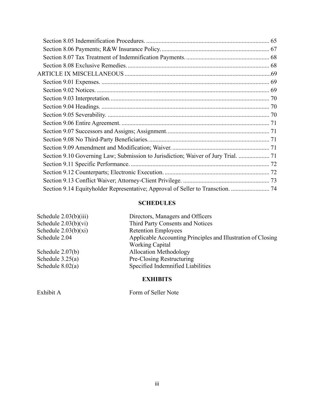 iii Section 8.05 Indemnification Procedures. ................................................................................ 65 Section 8.06 Payments; R&W Insurance Policy. ...................................................................... 67 Section 8.07 Tax Treatment of Indemnification Payments. ...................................................... 68 Section 8.08 Exclusive Remedies. ............................................................................................ 68 ARTICLE IX MISCELLANEOUS ...............................................................................................69 Section 9.01 Expenses. ............................................................................................................. 69 Section 9.02 Notices. ................................................................................................................ 69 Section 9.03 Interpretation. ....................................................................................................... 70 Section 9.04 Headings. ............................................................................................................. 70 Section 9.05 Severability. ......................................................................................................... 70 Section 9.06 Entire Agreement. ................................................................................................ 71 Section 9.07 Successors and Assigns; Assignment. .................................................................. 71 Section 9.08 No Third-Party Beneficiaries. .............................................................................. 71 Section 9.09 Amendment and Modification; Waiver. ............................................................... 71 Section 9.10 Governing Law; Submission to Jurisdiction; Waiver of Jury Trial. .................... 71 Section 9.11 Specific Performance. .......................................................................................... 72 Section 9.12 Counterparts; Electronic Execution. .................................................................... 72 Section 9.13 Conflict Waiver; Attorney-Client Privilege. ........................................................ 73 Section 9.14 Equityholder Representative; Approval of Seller to Transction. ......................... 74 SCHEDULES Schedule 2.03(b)(iii) Directors, Managers and Officers Schedule 2.03(b)(vi) Third Party Consents and Notices Schedule 2.03(b)(xi) Retention Employees Schedule 2.04 Applicable Accounting Principles and Illustration of Closing Working Capital Schedule 2.07(b) Allocation Methodology Schedule 3.25(a) Pre-Closing Restructuring Schedule 8.02(a) Specified Indemnified Liabilities EXHIBITS Exhibit A Form of Seller Note