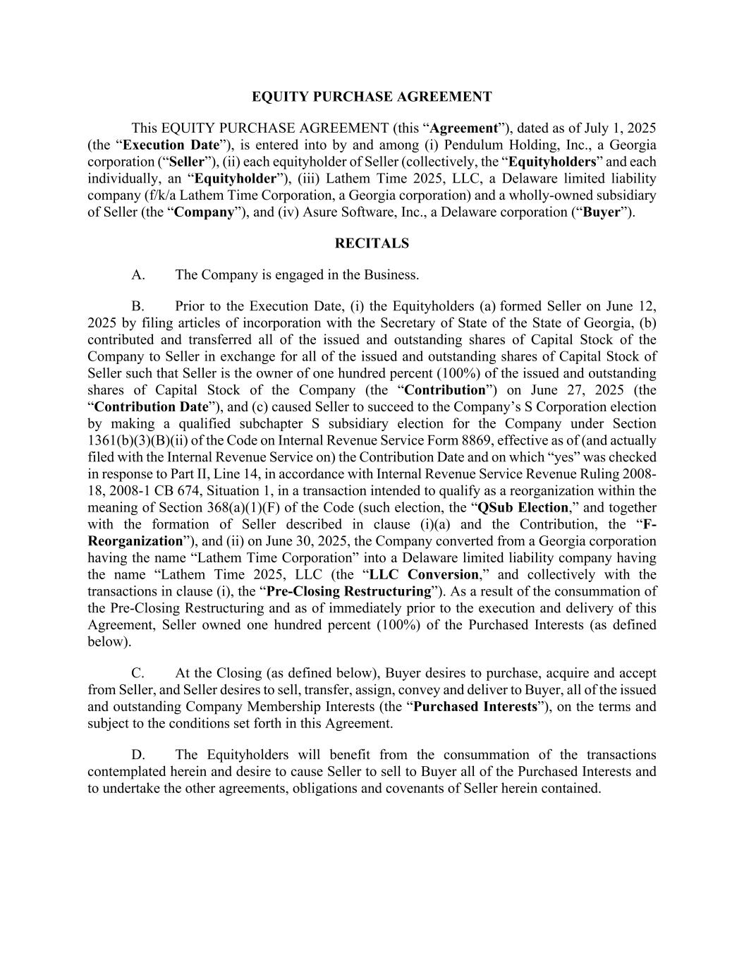 EQUITY PURCHASE AGREEMENT This EQUITY PURCHASE AGREEMENT (this “Agreement”), dated as of July 1, 2025 (the “Execution Date”), is entered into by and among (i) Pendulum Holding, Inc., a Georgia corporation (“Seller”), (ii) each equityholder of Seller (collectively, the “Equityholders” and each individually, an “Equityholder”), (iii) Lathem Time 2025, LLC, a Delaware limited liability company (f/k/a Lathem Time Corporation, a Georgia corporation) and a wholly-owned subsidiary of Seller (the “Company”), and (iv) Asure Software, Inc., a Delaware corporation (“Buyer”). RECITALS A. The Company is engaged in the Business. B. Prior to the Execution Date, (i) the Equityholders (a) formed Seller on June 12, 2025 by filing articles of incorporation with the Secretary of State of the State of Georgia, (b) contributed and transferred all of the issued and outstanding shares of Capital Stock of the Company to Seller in exchange for all of the issued and outstanding shares of Capital Stock of Seller such that Seller is the owner of one hundred percent (100%) of the issued and outstanding shares of Capital Stock of the Company (the “Contribution”) on June 27, 2025 (the “Contribution Date”), and (c) caused Seller to succeed to the Company’s S Corporation election by making a qualified subchapter S subsidiary election for the Company under Section 1361(b)(3)(B)(ii) of the Code on Internal Revenue Service Form 8869, effective as of (and actually filed with the Internal Revenue Service on) the Contribution Date and on which “yes” was checked in response to Part II, Line 14, in accordance with Internal Revenue Service Revenue Ruling 2008- 18, 2008-1 CB 674, Situation 1, in a transaction intended to qualify as a reorganization within the meaning of Section 368(a)(1)(F) of the Code (such election, the “QSub Election,” and together with the formation of Seller described in clause (i)(a) and the Contribution, the “F- Reorganization”), and (ii) on June 30, 2025, the Company converted from a Georgia corporation having the name “Lathem Time Corporation” into a Delaware limited liability company having the name “Lathem Time 2025, LLC (the “LLC Conversion,” and collectively with the transactions in clause (i), the “Pre-Closing Restructuring”). As a result of the consummation of the Pre-Closing Restructuring and as of immediately prior to the execution and delivery of this Agreement, Seller owned one hundred percent (100%) of the Purchased Interests (as defined below). C. At the Closing (as defined below), Buyer desires to purchase, acquire and accept from Seller, and Seller desires to sell, transfer, assign, convey and deliver to Buyer, all of the issued and outstanding Company Membership Interests (the “Purchased Interests”), on the terms and subject to the conditions set forth in this Agreement. D. The Equityholders will benefit from the consummation of the transactions contemplated herein and desire to cause Seller to sell to Buyer all of the Purchased Interests and to undertake the other agreements, obligations and covenants of Seller herein contained.