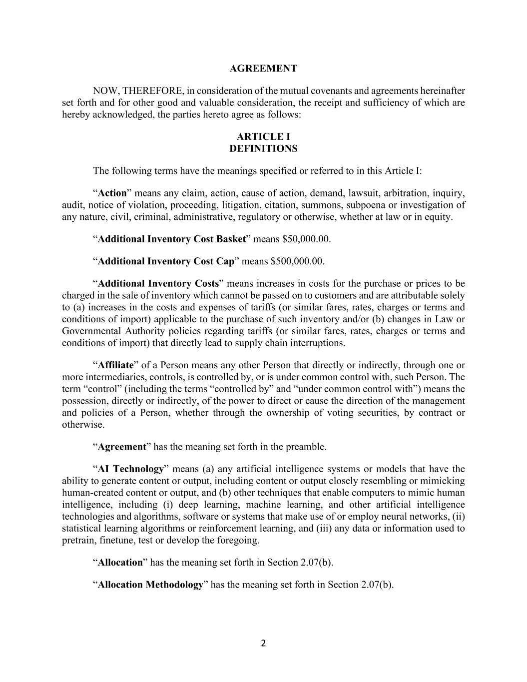 2 AGREEMENT NOW, THEREFORE, in consideration of the mutual covenants and agreements hereinafter set forth and for other good and valuable consideration, the receipt and sufficiency of which are hereby acknowledged, the parties hereto agree as follows: ARTICLE I DEFINITIONS The following terms have the meanings specified or referred to in this Article I: “Action” means any claim, action, cause of action, demand, lawsuit, arbitration, inquiry, audit, notice of violation, proceeding, litigation, citation, summons, subpoena or investigation of any nature, civil, criminal, administrative, regulatory or otherwise, whether at law or in equity. “Additional Inventory Cost Basket” means $50,000.00. “Additional Inventory Cost Cap” means $500,000.00. “Additional Inventory Costs” means increases in costs for the purchase or prices to be charged in the sale of inventory which cannot be passed on to customers and are attributable solely to (a) increases in the costs and expenses of tariffs (or similar fares, rates, charges or terms and conditions of import) applicable to the purchase of such inventory and/or (b) changes in Law or Governmental Authority policies regarding tariffs (or similar fares, rates, charges or terms and conditions of import) that directly lead to supply chain interruptions. “Affiliate” of a Person means any other Person that directly or indirectly, through one or more intermediaries, controls, is controlled by, or is under common control with, such Person. The term “control” (including the terms “controlled by” and “under common control with”) means the possession, directly or indirectly, of the power to direct or cause the direction of the management and policies of a Person, whether through the ownership of voting securities, by contract or otherwise. “Agreement” has the meaning set forth in the preamble. “AI Technology” means (a) any artificial intelligence systems or models that have the ability to generate content or output, including content or output closely resembling or mimicking human-created content or output, and (b) other techniques that enable computers to mimic human intelligence, including (i) deep learning, machine learning, and other artificial intelligence technologies and algorithms, software or systems that make use of or employ neural networks, (ii) statistical learning algorithms or reinforcement learning, and (iii) any data or information used to pretrain, finetune, test or develop the foregoing. “Allocation” has the meaning set forth in Section 2.07(b). “Allocation Methodology” has the meaning set forth in Section 2.07(b).
