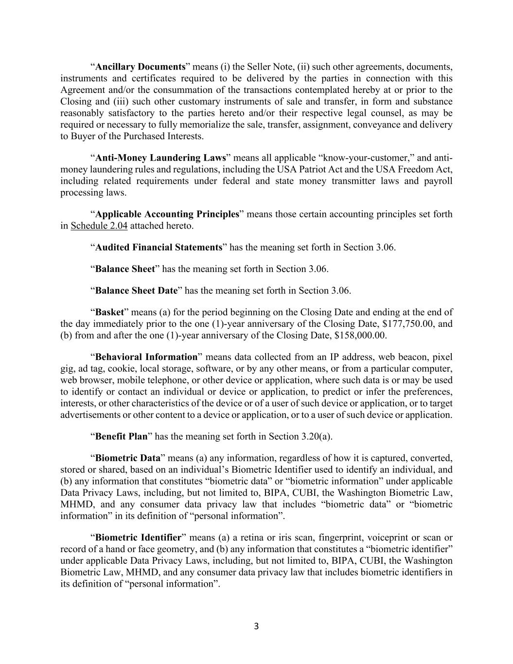 3 “Ancillary Documents” means (i) the Seller Note, (ii) such other agreements, documents, instruments and certificates required to be delivered by the parties in connection with this Agreement and/or the consummation of the transactions contemplated hereby at or prior to the Closing and (iii) such other customary instruments of sale and transfer, in form and substance reasonably satisfactory to the parties hereto and/or their respective legal counsel, as may be required or necessary to fully memorialize the sale, transfer, assignment, conveyance and delivery to Buyer of the Purchased Interests. “Anti-Money Laundering Laws” means all applicable “know-your-customer,” and anti- money laundering rules and regulations, including the USA Patriot Act and the USA Freedom Act, including related requirements under federal and state money transmitter laws and payroll processing laws. “Applicable Accounting Principles” means those certain accounting principles set forth in Schedule 2.04 attached hereto. “Audited Financial Statements” has the meaning set forth in Section 3.06. “Balance Sheet” has the meaning set forth in Section 3.06. “Balance Sheet Date” has the meaning set forth in Section 3.06. “Basket” means (a) for the period beginning on the Closing Date and ending at the end of the day immediately prior to the one (1)-year anniversary of the Closing Date, $177,750.00, and (b) from and after the one (1)-year anniversary of the Closing Date, $158,000.00. “Behavioral Information” means data collected from an IP address, web beacon, pixel gig, ad tag, cookie, local storage, software, or by any other means, or from a particular computer, web browser, mobile telephone, or other device or application, where such data is or may be used to identify or contact an individual or device or application, to predict or infer the preferences, interests, or other characteristics of the device or of a user of such device or application, or to target advertisements or other content to a device or application, or to a user of such device or application. “Benefit Plan” has the meaning set forth in Section 3.20(a). “Biometric Data” means (a) any information, regardless of how it is captured, converted, stored or shared, based on an individual’s Biometric Identifier used to identify an individual, and (b) any information that constitutes “biometric data” or “biometric information” under applicable Data Privacy Laws, including, but not limited to, BIPA, CUBI, the Washington Biometric Law, MHMD, and any consumer data privacy law that includes “biometric data” or “biometric information” in its definition of “personal information”. “Biometric Identifier” means (a) a retina or iris scan, fingerprint, voiceprint or scan or record of a hand or face geometry, and (b) any information that constitutes a “biometric identifier” under applicable Data Privacy Laws, including, but not limited to, BIPA, CUBI, the Washington Biometric Law, MHMD, and any consumer data privacy law that includes biometric identifiers in its definition of “personal information”.