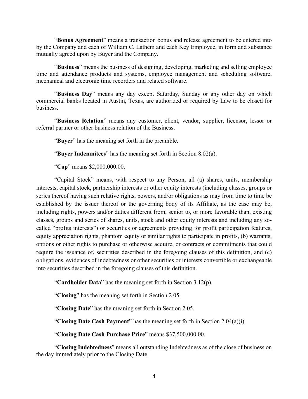 4 “Bonus Agreement” means a transaction bonus and release agreement to be entered into by the Company and each of William C. Lathem and each Key Employee, in form and substance mutually agreed upon by Buyer and the Company. “Business” means the business of designing, developing, marketing and selling employee time and attendance products and systems, employee management and scheduling software, mechanical and electronic time recorders and related software. “Business Day” means any day except Saturday, Sunday or any other day on which commercial banks located in Austin, Texas, are authorized or required by Law to be closed for business. “Business Relation” means any customer, client, vendor, supplier, licensor, lessor or referral partner or other business relation of the Business. “Buyer” has the meaning set forth in the preamble. “Buyer Indemnitees” has the meaning set forth in Section 8.02(a). “Cap” means $2,000,000.00. “Capital Stock” means, with respect to any Person, all (a) shares, units, membership interests, capital stock, partnership interests or other equity interests (including classes, groups or series thereof having such relative rights, powers, and/or obligations as may from time to time be established by the issuer thereof or the governing body of its Affiliate, as the case may be, including rights, powers and/or duties different from, senior to, or more favorable than, existing classes, groups and series of shares, units, stock and other equity interests and including any so- called “profits interests”) or securities or agreements providing for profit participation features, equity appreciation rights, phantom equity or similar rights to participate in profits, (b) warrants, options or other rights to purchase or otherwise acquire, or contracts or commitments that could require the issuance of, securities described in the foregoing clauses of this definition, and (c) obligations, evidences of indebtedness or other securities or interests convertible or exchangeable into securities described in the foregoing clauses of this definition. “Cardholder Data” has the meaning set forth in Section 3.12(p). “Closing” has the meaning set forth in Section 2.05. “Closing Date” has the meaning set forth in Section 2.05. “Closing Date Cash Payment” has the meaning set forth in Section 2.04(a)(i). “Closing Date Cash Purchase Price” means $37,500,000.00. “Closing Indebtedness” means all outstanding Indebtedness as of the close of business on the day immediately prior to the Closing Date.