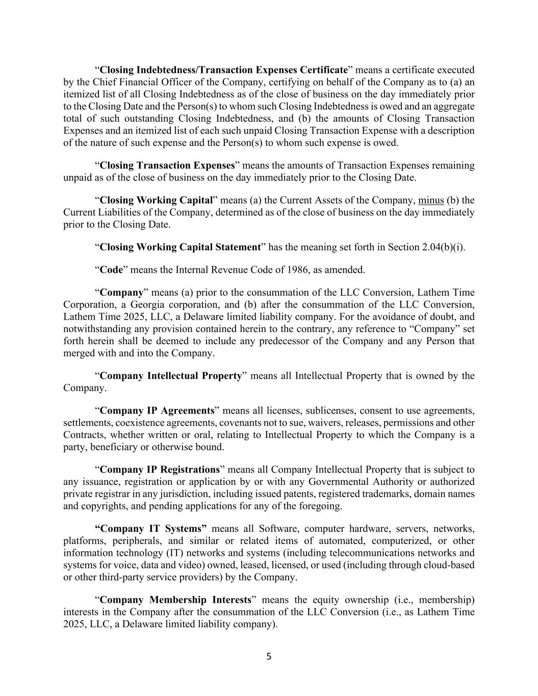 5 “Closing Indebtedness/Transaction Expenses Certificate” means a certificate executed by the Chief Financial Officer of the Company, certifying on behalf of the Company as to (a) an itemized list of all Closing Indebtedness as of the close of business on the day immediately prior to the Closing Date and the Person(s) to whom such Closing Indebtedness is owed and an aggregate total of such outstanding Closing Indebtedness, and (b) the amounts of Closing Transaction Expenses and an itemized list of each such unpaid Closing Transaction Expense with a description of the nature of such expense and the Person(s) to whom such expense is owed. “Closing Transaction Expenses” means the amounts of Transaction Expenses remaining unpaid as of the close of business on the day immediately prior to the Closing Date. “Closing Working Capital” means (a) the Current Assets of the Company, minus (b) the Current Liabilities of the Company, determined as of the close of business on the day immediately prior to the Closing Date. “Closing Working Capital Statement” has the meaning set forth in Section 2.04(b)(i). “Code” means the Internal Revenue Code of 1986, as amended. “Company” means (a) prior to the consummation of the LLC Conversion, Lathem Time Corporation, a Georgia corporation, and (b) after the consummation of the LLC Conversion, Lathem Time 2025, LLC, a Delaware limited liability company. For the avoidance of doubt, and notwithstanding any provision contained herein to the contrary, any reference to “Company” set forth herein shall be deemed to include any predecessor of the Company and any Person that merged with and into the Company. “Company Intellectual Property” means all Intellectual Property that is owned by the Company. “Company IP Agreements” means all licenses, sublicenses, consent to use agreements, settlements, coexistence agreements, covenants not to sue, waivers, releases, permissions and other Contracts, whether written or oral, relating to Intellectual Property to which the Company is a party, beneficiary or otherwise bound. “Company IP Registrations” means all Company Intellectual Property that is subject to any issuance, registration or application by or with any Governmental Authority or authorized private registrar in any jurisdiction, including issued patents, registered trademarks, domain names and copyrights, and pending applications for any of the foregoing. “Company IT Systems” means all Software, computer hardware, servers, networks, platforms, peripherals, and similar or related items of automated, computerized, or other information technology (IT) networks and systems (including telecommunications networks and systems for voice, data and video) owned, leased, licensed, or used (including through cloud-based or other third-party service providers) by the Company. “Company Membership Interests” means the equity ownership (i.e., membership) interests in the Company after the consummation of the LLC Conversion (i.e., as Lathem Time 2025, LLC, a Delaware limited liability company).