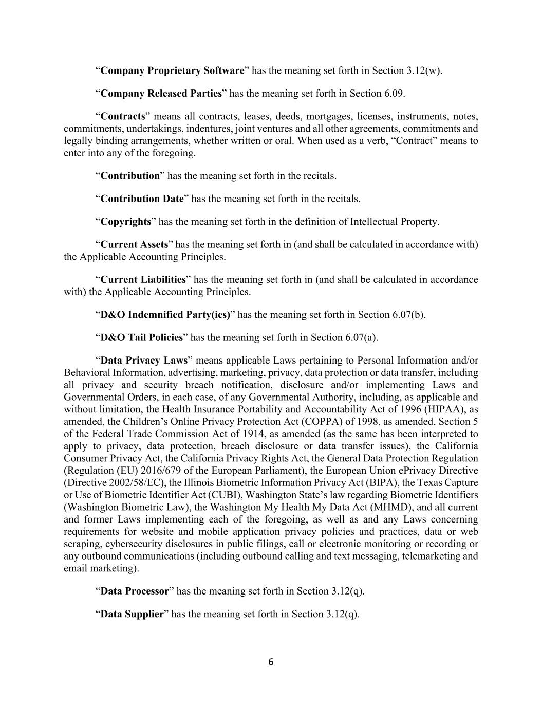 6 “Company Proprietary Software” has the meaning set forth in Section 3.12(w). “Company Released Parties” has the meaning set forth in Section 6.09. “Contracts” means all contracts, leases, deeds, mortgages, licenses, instruments, notes, commitments, undertakings, indentures, joint ventures and all other agreements, commitments and legally binding arrangements, whether written or oral. When used as a verb, “Contract” means to enter into any of the foregoing. “Contribution” has the meaning set forth in the recitals. “Contribution Date” has the meaning set forth in the recitals. “Copyrights” has the meaning set forth in the definition of Intellectual Property. “Current Assets” has the meaning set forth in (and shall be calculated in accordance with) the Applicable Accounting Principles. “Current Liabilities” has the meaning set forth in (and shall be calculated in accordance with) the Applicable Accounting Principles. “D&O Indemnified Party(ies)” has the meaning set forth in Section 6.07(b). “D&O Tail Policies” has the meaning set forth in Section 6.07(a). “Data Privacy Laws” means applicable Laws pertaining to Personal Information and/or Behavioral Information, advertising, marketing, privacy, data protection or data transfer, including all privacy and security breach notification, disclosure and/or implementing Laws and Governmental Orders, in each case, of any Governmental Authority, including, as applicable and without limitation, the Health Insurance Portability and Accountability Act of 1996 (HIPAA), as amended, the Children’s Online Privacy Protection Act (COPPA) of 1998, as amended, Section 5 of the Federal Trade Commission Act of 1914, as amended (as the same has been interpreted to apply to privacy, data protection, breach disclosure or data transfer issues), the California Consumer Privacy Act, the California Privacy Rights Act, the General Data Protection Regulation (Regulation (EU) 2016/679 of the European Parliament), the European Union ePrivacy Directive (Directive 2002/58/EC), the Illinois Biometric Information Privacy Act (BIPA), the Texas Capture or Use of Biometric Identifier Act (CUBI), Washington State’s law regarding Biometric Identifiers (Washington Biometric Law), the Washington My Health My Data Act (MHMD), and all current and former Laws implementing each of the foregoing, as well as and any Laws concerning requirements for website and mobile application privacy policies and practices, data or web scraping, cybersecurity disclosures in public filings, call or electronic monitoring or recording or any outbound communications (including outbound calling and text messaging, telemarketing and email marketing). “Data Processor” has the meaning set forth in Section 3.12(q). “Data Supplier” has the meaning set forth in Section 3.12(q).