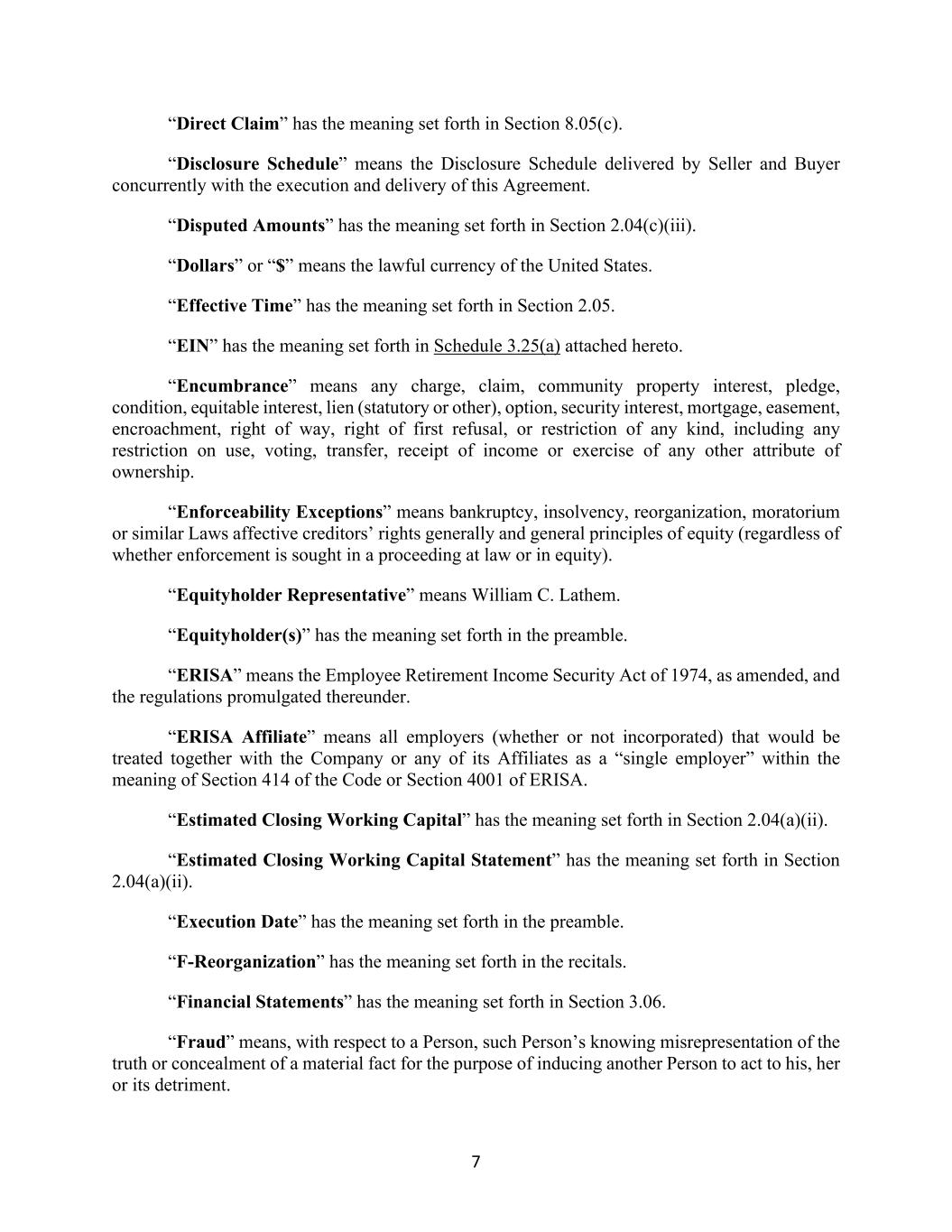 7 “Direct Claim” has the meaning set forth in Section 8.05(c). “Disclosure Schedule” means the Disclosure Schedule delivered by Seller and Buyer concurrently with the execution and delivery of this Agreement. “Disputed Amounts” has the meaning set forth in Section 2.04(c)(iii). “Dollars” or “$” means the lawful currency of the United States. “Effective Time” has the meaning set forth in Section 2.05. “EIN” has the meaning set forth in Schedule 3.25(a) attached hereto. “Encumbrance” means any charge, claim, community property interest, pledge, condition, equitable interest, lien (statutory or other), option, security interest, mortgage, easement, encroachment, right of way, right of first refusal, or restriction of any kind, including any restriction on use, voting, transfer, receipt of income or exercise of any other attribute of ownership. “Enforceability Exceptions” means bankruptcy, insolvency, reorganization, moratorium or similar Laws affective creditors’ rights generally and general principles of equity (regardless of whether enforcement is sought in a proceeding at law or in equity). “Equityholder Representative” means William C. Lathem. “Equityholder(s)” has the meaning set forth in the preamble. “ERISA” means the Employee Retirement Income Security Act of 1974, as amended, and the regulations promulgated thereunder. “ERISA Affiliate” means all employers (whether or not incorporated) that would be treated together with the Company or any of its Affiliates as a “single employer” within the meaning of Section 414 of the Code or Section 4001 of ERISA. “Estimated Closing Working Capital” has the meaning set forth in Section 2.04(a)(ii). “Estimated Closing Working Capital Statement” has the meaning set forth in Section 2.04(a)(ii). “Execution Date” has the meaning set forth in the preamble. “F-Reorganization” has the meaning set forth in the recitals. “Financial Statements” has the meaning set forth in Section 3.06. “Fraud” means, with respect to a Person, such Person’s knowing misrepresentation of the truth or concealment of a material fact for the purpose of inducing another Person to act to his, her or its detriment.