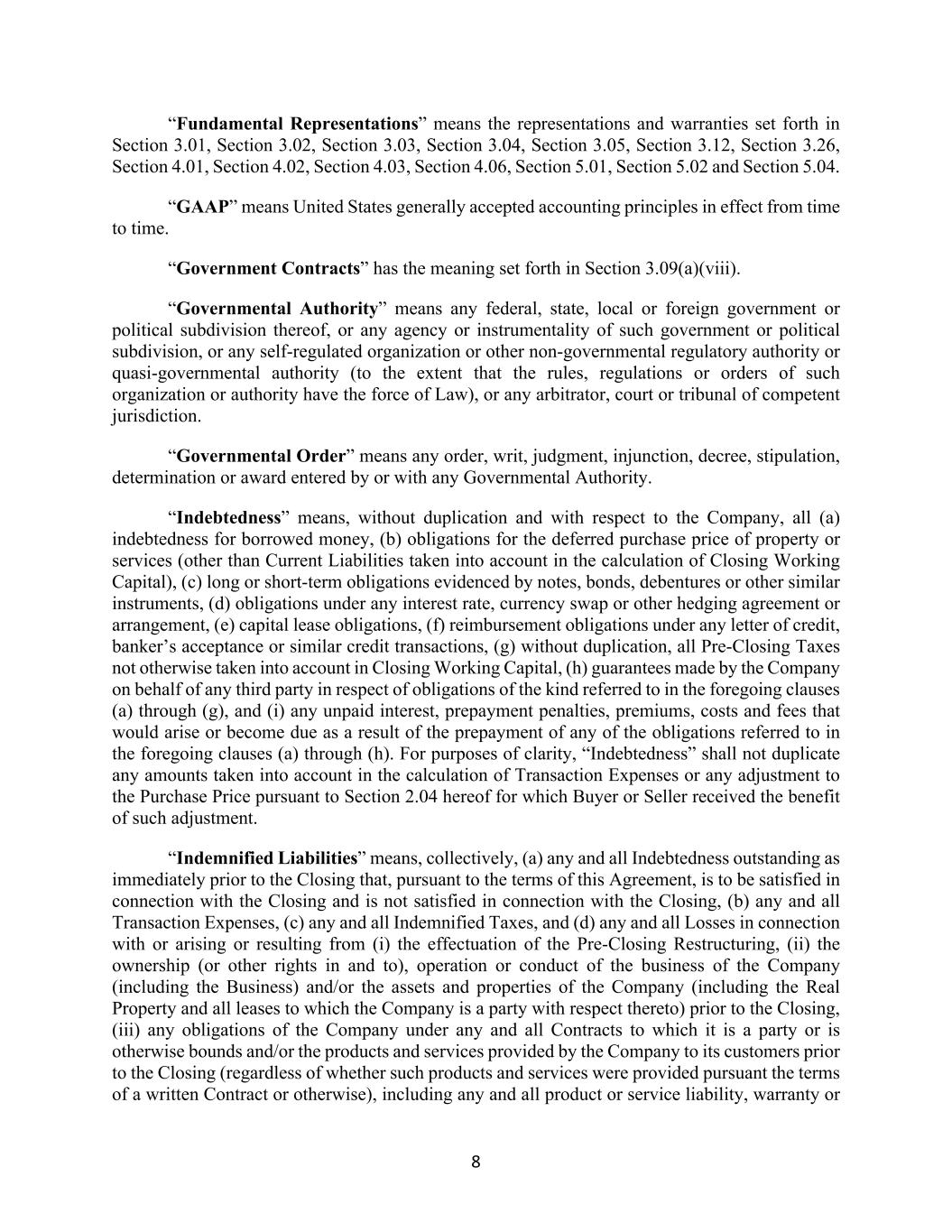 8 “Fundamental Representations” means the representations and warranties set forth in Section 3.01, Section 3.02, Section 3.03, Section 3.04, Section 3.05, Section 3.12, Section 3.26, Section 4.01, Section 4.02, Section 4.03, Section 4.06, Section 5.01, Section 5.02 and Section 5.04. “GAAP” means United States generally accepted accounting principles in effect from time to time. “Government Contracts” has the meaning set forth in Section 3.09(a)(viii). “Governmental Authority” means any federal, state, local or foreign government or political subdivision thereof, or any agency or instrumentality of such government or political subdivision, or any self-regulated organization or other non-governmental regulatory authority or quasi-governmental authority (to the extent that the rules, regulations or orders of such organization or authority have the force of Law), or any arbitrator, court or tribunal of competent jurisdiction. “Governmental Order” means any order, writ, judgment, injunction, decree, stipulation, determination or award entered by or with any Governmental Authority. “Indebtedness” means, without duplication and with respect to the Company, all (a) indebtedness for borrowed money, (b) obligations for the deferred purchase price of property or services (other than Current Liabilities taken into account in the calculation of Closing Working Capital), (c) long or short-term obligations evidenced by notes, bonds, debentures or other similar instruments, (d) obligations under any interest rate, currency swap or other hedging agreement or arrangement, (e) capital lease obligations, (f) reimbursement obligations under any letter of credit, banker’s acceptance or similar credit transactions, (g) without duplication, all Pre-Closing Taxes not otherwise taken into account in Closing Working Capital, (h) guarantees made by the Company on behalf of any third party in respect of obligations of the kind referred to in the foregoing clauses (a) through (g), and (i) any unpaid interest, prepayment penalties, premiums, costs and fees that would arise or become due as a result of the prepayment of any of the obligations referred to in the foregoing clauses (a) through (h). For purposes of clarity, “Indebtedness” shall not duplicate any amounts taken into account in the calculation of Transaction Expenses or any adjustment to the Purchase Price pursuant to Section 2.04 hereof for which Buyer or Seller received the benefit of such adjustment. “Indemnified Liabilities” means, collectively, (a) any and all Indebtedness outstanding as immediately prior to the Closing that, pursuant to the terms of this Agreement, is to be satisfied in connection with the Closing and is not satisfied in connection with the Closing, (b) any and all Transaction Expenses, (c) any and all Indemnified Taxes, and (d) any and all Losses in connection with or arising or resulting from (i) the effectuation of the Pre-Closing Restructuring, (ii) the ownership (or other rights in and to), operation or conduct of the business of the Company (including the Business) and/or the assets and properties of the Company (including the Real Property and all leases to which the Company is a party with respect thereto) prior to the Closing, (iii) any obligations of the Company under any and all Contracts to which it is a party or is otherwise bounds and/or the products and services provided by the Company to its customers prior to the Closing (regardless of whether such products and services were provided pursuant the terms of a written Contract or otherwise), including any and all product or service liability, warranty or