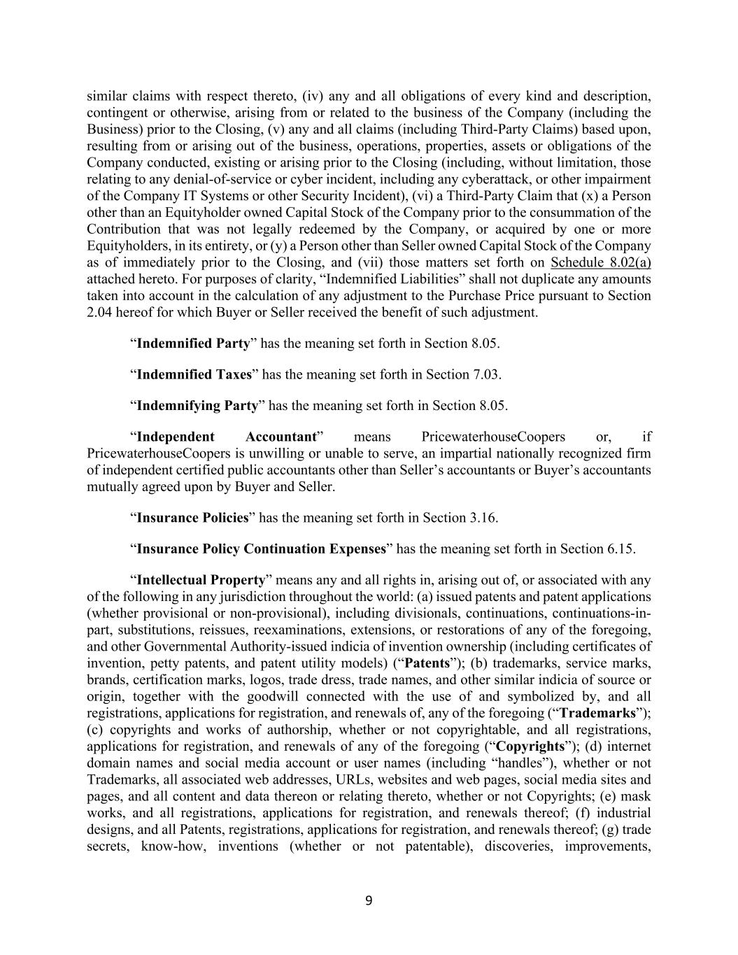 9 similar claims with respect thereto, (iv) any and all obligations of every kind and description, contingent or otherwise, arising from or related to the business of the Company (including the Business) prior to the Closing, (v) any and all claims (including Third-Party Claims) based upon, resulting from or arising out of the business, operations, properties, assets or obligations of the Company conducted, existing or arising prior to the Closing (including, without limitation, those relating to any denial-of-service or cyber incident, including any cyberattack, or other impairment of the Company IT Systems or other Security Incident), (vi) a Third-Party Claim that (x) a Person other than an Equityholder owned Capital Stock of the Company prior to the consummation of the Contribution that was not legally redeemed by the Company, or acquired by one or more Equityholders, in its entirety, or (y) a Person other than Seller owned Capital Stock of the Company as of immediately prior to the Closing, and (vii) those matters set forth on Schedule 8.02(a) attached hereto. For purposes of clarity, “Indemnified Liabilities” shall not duplicate any amounts taken into account in the calculation of any adjustment to the Purchase Price pursuant to Section 2.04 hereof for which Buyer or Seller received the benefit of such adjustment. “Indemnified Party” has the meaning set forth in Section 8.05. “Indemnified Taxes” has the meaning set forth in Section 7.03. “Indemnifying Party” has the meaning set forth in Section 8.05. “Independent Accountant” means PricewaterhouseCoopers or, if PricewaterhouseCoopers is unwilling or unable to serve, an impartial nationally recognized firm of independent certified public accountants other than Seller’s accountants or Buyer’s accountants mutually agreed upon by Buyer and Seller. “Insurance Policies” has the meaning set forth in Section 3.16. “Insurance Policy Continuation Expenses” has the meaning set forth in Section 6.15. “Intellectual Property” means any and all rights in, arising out of, or associated with any of the following in any jurisdiction throughout the world: (a) issued patents and patent applications (whether provisional or non-provisional), including divisionals, continuations, continuations-in- part, substitutions, reissues, reexaminations, extensions, or restorations of any of the foregoing, and other Governmental Authority-issued indicia of invention ownership (including certificates of invention, petty patents, and patent utility models) (“Patents”); (b) trademarks, service marks, brands, certification marks, logos, trade dress, trade names, and other similar indicia of source or origin, together with the goodwill connected with the use of and symbolized by, and all registrations, applications for registration, and renewals of, any of the foregoing (“Trademarks”); (c) copyrights and works of authorship, whether or not copyrightable, and all registrations, applications for registration, and renewals of any of the foregoing (“Copyrights”); (d) internet domain names and social media account or user names (including “handles”), whether or not Trademarks, all associated web addresses, URLs, websites and web pages, social media sites and pages, and all content and data thereon or relating thereto, whether or not Copyrights; (e) mask works, and all registrations, applications for registration, and renewals thereof; (f) industrial designs, and all Patents, registrations, applications for registration, and renewals thereof; (g) trade secrets, know-how, inventions (whether or not patentable), discoveries, improvements,