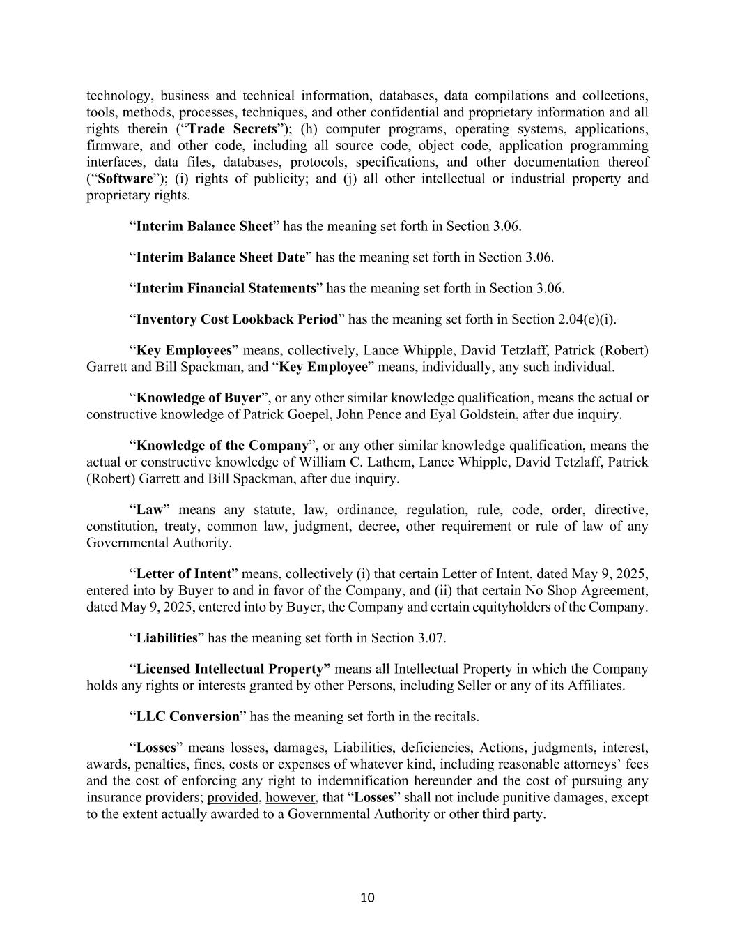 10 technology, business and technical information, databases, data compilations and collections, tools, methods, processes, techniques, and other confidential and proprietary information and all rights therein (“Trade Secrets”); (h) computer programs, operating systems, applications, firmware, and other code, including all source code, object code, application programming interfaces, data files, databases, protocols, specifications, and other documentation thereof (“Software”); (i) rights of publicity; and (j) all other intellectual or industrial property and proprietary rights. “Interim Balance Sheet” has the meaning set forth in Section 3.06. “Interim Balance Sheet Date” has the meaning set forth in Section 3.06. “Interim Financial Statements” has the meaning set forth in Section 3.06. “Inventory Cost Lookback Period” has the meaning set forth in Section 2.04(e)(i). “Key Employees” means, collectively, Lance Whipple, David Tetzlaff, Patrick (Robert) Garrett and Bill Spackman, and “Key Employee” means, individually, any such individual. “Knowledge of Buyer”, or any other similar knowledge qualification, means the actual or constructive knowledge of Patrick Goepel, John Pence and Eyal Goldstein, after due inquiry. “Knowledge of the Company”, or any other similar knowledge qualification, means the actual or constructive knowledge of William C. Lathem, Lance Whipple, David Tetzlaff, Patrick (Robert) Garrett and Bill Spackman, after due inquiry. “Law” means any statute, law, ordinance, regulation, rule, code, order, directive, constitution, treaty, common law, judgment, decree, other requirement or rule of law of any Governmental Authority. “Letter of Intent” means, collectively (i) that certain Letter of Intent, dated May 9, 2025, entered into by Buyer to and in favor of the Company, and (ii) that certain No Shop Agreement, dated May 9, 2025, entered into by Buyer, the Company and certain equityholders of the Company. “Liabilities” has the meaning set forth in Section 3.07. “Licensed Intellectual Property” means all Intellectual Property in which the Company holds any rights or interests granted by other Persons, including Seller or any of its Affiliates. “LLC Conversion” has the meaning set forth in the recitals. “Losses” means losses, damages, Liabilities, deficiencies, Actions, judgments, interest, awards, penalties, fines, costs or expenses of whatever kind, including reasonable attorneys’ fees and the cost of enforcing any right to indemnification hereunder and the cost of pursuing any insurance providers; provided, however, that “Losses” shall not include punitive damages, except to the extent actually awarded to a Governmental Authority or other third party.