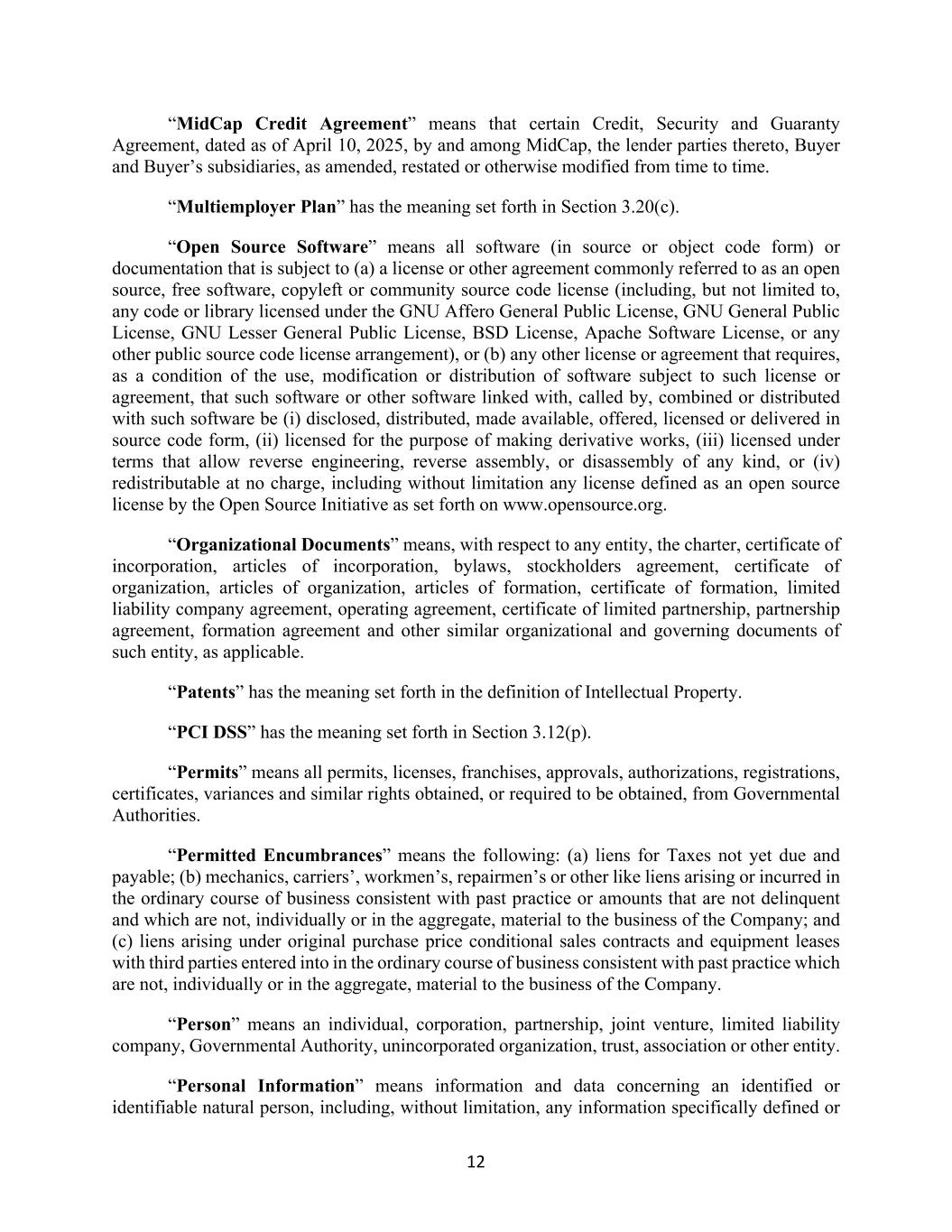 12 “MidCap Credit Agreement” means that certain Credit, Security and Guaranty Agreement, dated as of April 10, 2025, by and among MidCap, the lender parties thereto, Buyer and Buyer’s subsidiaries, as amended, restated or otherwise modified from time to time. “Multiemployer Plan” has the meaning set forth in Section 3.20(c). “Open Source Software” means all software (in source or object code form) or documentation that is subject to (a) a license or other agreement commonly referred to as an open source, free software, copyleft or community source code license (including, but not limited to, any code or library licensed under the GNU Affero General Public License, GNU General Public License, GNU Lesser General Public License, BSD License, Apache Software License, or any other public source code license arrangement), or (b) any other license or agreement that requires, as a condition of the use, modification or distribution of software subject to such license or agreement, that such software or other software linked with, called by, combined or distributed with such software be (i) disclosed, distributed, made available, offered, licensed or delivered in source code form, (ii) licensed for the purpose of making derivative works, (iii) licensed under terms that allow reverse engineering, reverse assembly, or disassembly of any kind, or (iv) redistributable at no charge, including without limitation any license defined as an open source license by the Open Source Initiative as set forth on www.opensource.org. “Organizational Documents” means, with respect to any entity, the charter, certificate of incorporation, articles of incorporation, bylaws, stockholders agreement, certificate of organization, articles of organization, articles of formation, certificate of formation, limited liability company agreement, operating agreement, certificate of limited partnership, partnership agreement, formation agreement and other similar organizational and governing documents of such entity, as applicable. “Patents” has the meaning set forth in the definition of Intellectual Property. “PCI DSS” has the meaning set forth in Section 3.12(p). “Permits” means all permits, licenses, franchises, approvals, authorizations, registrations, certificates, variances and similar rights obtained, or required to be obtained, from Governmental Authorities. “Permitted Encumbrances” means the following: (a) liens for Taxes not yet due and payable; (b) mechanics, carriers’, workmen’s, repairmen’s or other like liens arising or incurred in the ordinary course of business consistent with past practice or amounts that are not delinquent and which are not, individually or in the aggregate, material to the business of the Company; and (c) liens arising under original purchase price conditional sales contracts and equipment leases with third parties entered into in the ordinary course of business consistent with past practice which are not, individually or in the aggregate, material to the business of the Company. “Person” means an individual, corporation, partnership, joint venture, limited liability company, Governmental Authority, unincorporated organization, trust, association or other entity. “Personal Information” means information and data concerning an identified or identifiable natural person, including, without limitation, any information specifically defined or
