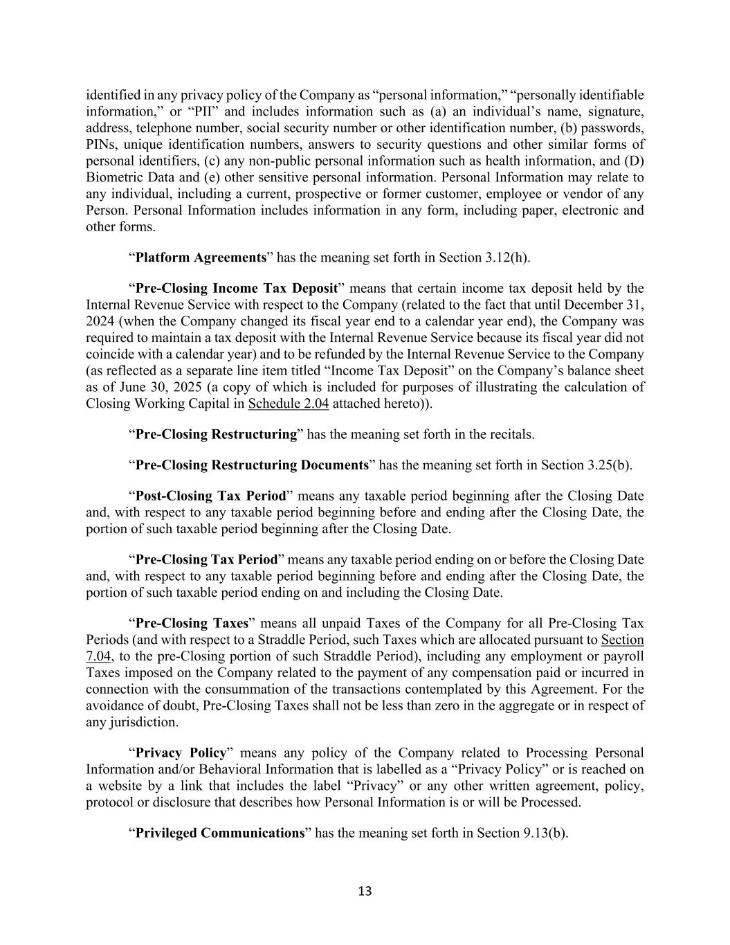 13 identified in any privacy policy of the Company as “personal information,” “personally identifiable information,” or “PII” and includes information such as (a) an individual’s name, signature, address, telephone number, social security number or other identification number, (b) passwords, PINs, unique identification numbers, answers to security questions and other similar forms of personal identifiers, (c) any non-public personal information such as health information, and (D) Biometric Data and (e) other sensitive personal information. Personal Information may relate to any individual, including a current, prospective or former customer, employee or vendor of any Person. Personal Information includes information in any form, including paper, electronic and other forms. “Platform Agreements” has the meaning set forth in Section 3.12(h). “Pre-Closing Income Tax Deposit” means that certain income tax deposit held by the Internal Revenue Service with respect to the Company (related to the fact that until December 31, 2024 (when the Company changed its fiscal year end to a calendar year end), the Company was required to maintain a tax deposit with the Internal Revenue Service because its fiscal year did not coincide with a calendar year) and to be refunded by the Internal Revenue Service to the Company (as reflected as a separate line item titled “Income Tax Deposit” on the Company’s balance sheet as of June 30, 2025 (a copy of which is included for purposes of illustrating the calculation of Closing Working Capital in Schedule 2.04 attached hereto)). “Pre-Closing Restructuring” has the meaning set forth in the recitals. “Pre-Closing Restructuring Documents” has the meaning set forth in Section 3.25(b). “Post-Closing Tax Period” means any taxable period beginning after the Closing Date and, with respect to any taxable period beginning before and ending after the Closing Date, the portion of such taxable period beginning after the Closing Date. “Pre-Closing Tax Period” means any taxable period ending on or before the Closing Date and, with respect to any taxable period beginning before and ending after the Closing Date, the portion of such taxable period ending on and including the Closing Date. “Pre-Closing Taxes” means all unpaid Taxes of the Company for all Pre-Closing Tax Periods (and with respect to a Straddle Period, such Taxes which are allocated pursuant to Section 7.04, to the pre-Closing portion of such Straddle Period), including any employment or payroll Taxes imposed on the Company related to the payment of any compensation paid or incurred in connection with the consummation of the transactions contemplated by this Agreement. For the avoidance of doubt, Pre-Closing Taxes shall not be less than zero in the aggregate or in respect of any jurisdiction. “Privacy Policy” means any policy of the Company related to Processing Personal Information and/or Behavioral Information that is labelled as a “Privacy Policy” or is reached on a website by a link that includes the label “Privacy” or any other written agreement, policy, protocol or disclosure that describes how Personal Information is or will be Processed. “Privileged Communications” has the meaning set forth in Section 9.13(b).