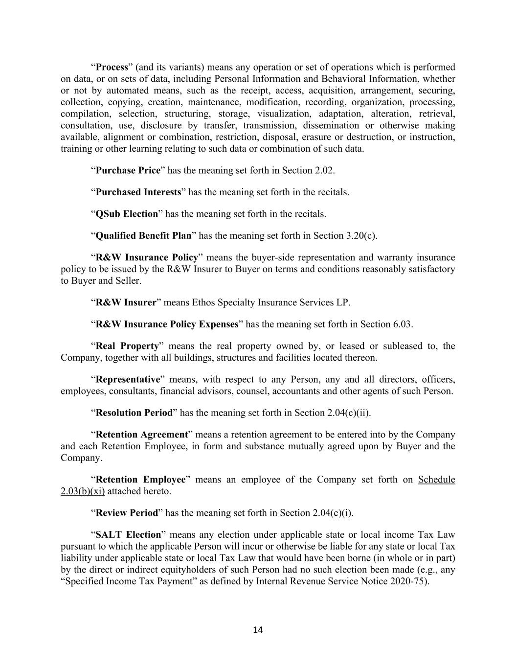14 “Process” (and its variants) means any operation or set of operations which is performed on data, or on sets of data, including Personal Information and Behavioral Information, whether or not by automated means, such as the receipt, access, acquisition, arrangement, securing, collection, copying, creation, maintenance, modification, recording, organization, processing, compilation, selection, structuring, storage, visualization, adaptation, alteration, retrieval, consultation, use, disclosure by transfer, transmission, dissemination or otherwise making available, alignment or combination, restriction, disposal, erasure or destruction, or instruction, training or other learning relating to such data or combination of such data. “Purchase Price” has the meaning set forth in Section 2.02. “Purchased Interests” has the meaning set forth in the recitals. “QSub Election” has the meaning set forth in the recitals. “Qualified Benefit Plan” has the meaning set forth in Section 3.20(c). “R&W Insurance Policy” means the buyer-side representation and warranty insurance policy to be issued by the R&W Insurer to Buyer on terms and conditions reasonably satisfactory to Buyer and Seller. “R&W Insurer” means Ethos Specialty Insurance Services LP. “R&W Insurance Policy Expenses” has the meaning set forth in Section 6.03. “Real Property” means the real property owned by, or leased or subleased to, the Company, together with all buildings, structures and facilities located thereon. “Representative” means, with respect to any Person, any and all directors, officers, employees, consultants, financial advisors, counsel, accountants and other agents of such Person. “Resolution Period” has the meaning set forth in Section 2.04(c)(ii). “Retention Agreement” means a retention agreement to be entered into by the Company and each Retention Employee, in form and substance mutually agreed upon by Buyer and the Company. “Retention Employee” means an employee of the Company set forth on Schedule 2.03(b)(xi) attached hereto. “Review Period” has the meaning set forth in Section 2.04(c)(i). “SALT Election” means any election under applicable state or local income Tax Law pursuant to which the applicable Person will incur or otherwise be liable for any state or local Tax liability under applicable state or local Tax Law that would have been borne (in whole or in part) by the direct or indirect equityholders of such Person had no such election been made (e.g., any “Specified Income Tax Payment” as defined by Internal Revenue Service Notice 2020-75).