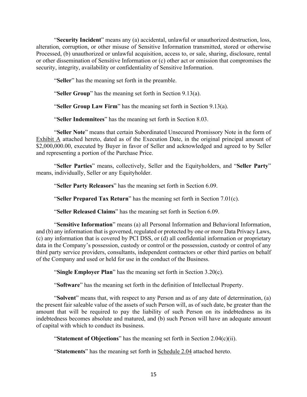 15 “Security Incident” means any (a) accidental, unlawful or unauthorized destruction, loss, alteration, corruption, or other misuse of Sensitive Information transmitted, stored or otherwise Processed, (b) unauthorized or unlawful acquisition, access to, or sale, sharing, disclosure, rental or other dissemination of Sensitive Information or (c) other act or omission that compromises the security, integrity, availability or confidentiality of Sensitive Information. “Seller” has the meaning set forth in the preamble. “Seller Group” has the meaning set forth in Section 9.13(a). “Seller Group Law Firm” has the meaning set forth in Section 9.13(a). “Seller Indemnitees” has the meaning set forth in Section 8.03. “Seller Note” means that certain Subordinated Unsecured Promissory Note in the form of Exhibit A attached hereto, dated as of the Execution Date, in the original principal amount of $2,000,000.00, executed by Buyer in favor of Seller and acknowledged and agreed to by Seller and representing a portion of the Purchase Price. “Seller Parties” means, collectively, Seller and the Equityholders, and “Seller Party” means, individually, Seller or any Equityholder. “Seller Party Releasors” has the meaning set forth in Section 6.09. “Seller Prepared Tax Return” has the meaning set forth in Section 7.01(c). “Seller Released Claims” has the meaning set forth in Section 6.09. “Sensitive Information” means (a) all Personal Information and Behavioral Information, and (b) any information that is governed, regulated or protected by one or more Data Privacy Laws, (c) any information that is covered by PCI DSS, or (d) all confidential information or proprietary data in the Company’s possession, custody or control or the possession, custody or control of any third party service providers, consultants, independent contractors or other third parties on behalf of the Company and used or held for use in the conduct of the Business. “Single Employer Plan” has the meaning set forth in Section 3.20(c). “Software” has the meaning set forth in the definition of Intellectual Property. “Solvent” means that, with respect to any Person and as of any date of determination, (a) the present fair saleable value of the assets of such Person will, as of such date, be greater than the amount that will be required to pay the liability of such Person on its indebtedness as its indebtedness becomes absolute and matured, and (b) such Person will have an adequate amount of capital with which to conduct its business. “Statement of Objections” has the meaning set forth in Section 2.04(c)(ii). “Statements” has the meaning set forth in Schedule 2.04 attached hereto.