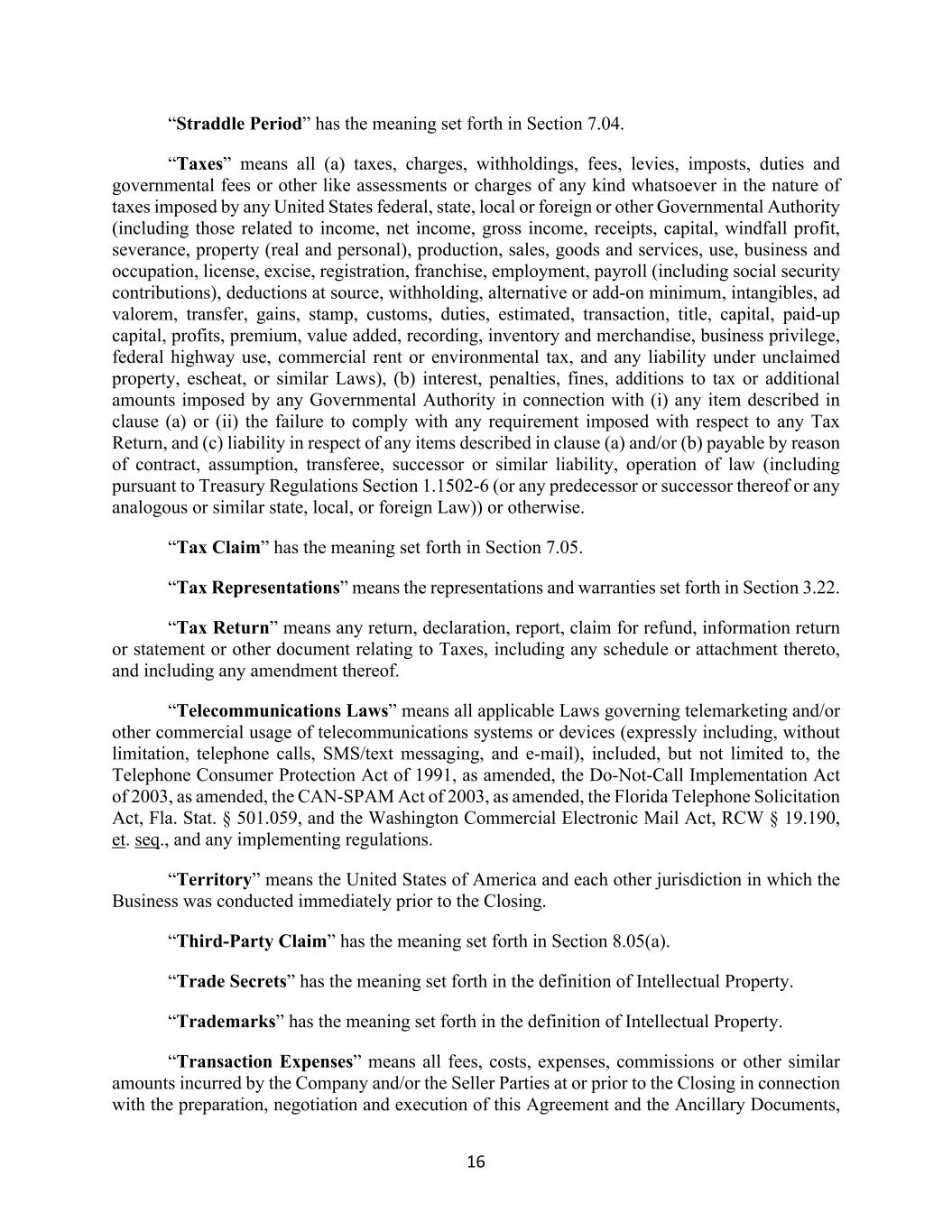 16 “Straddle Period” has the meaning set forth in Section 7.04. “Taxes” means all (a) taxes, charges, withholdings, fees, levies, imposts, duties and governmental fees or other like assessments or charges of any kind whatsoever in the nature of taxes imposed by any United States federal, state, local or foreign or other Governmental Authority (including those related to income, net income, gross income, receipts, capital, windfall profit, severance, property (real and personal), production, sales, goods and services, use, business and occupation, license, excise, registration, franchise, employment, payroll (including social security contributions), deductions at source, withholding, alternative or add-on minimum, intangibles, ad valorem, transfer, gains, stamp, customs, duties, estimated, transaction, title, capital, paid-up capital, profits, premium, value added, recording, inventory and merchandise, business privilege, federal highway use, commercial rent or environmental tax, and any liability under unclaimed property, escheat, or similar Laws), (b) interest, penalties, fines, additions to tax or additional amounts imposed by any Governmental Authority in connection with (i) any item described in clause (a) or (ii) the failure to comply with any requirement imposed with respect to any Tax Return, and (c) liability in respect of any items described in clause (a) and/or (b) payable by reason of contract, assumption, transferee, successor or similar liability, operation of law (including pursuant to Treasury Regulations Section 1.1502-6 (or any predecessor or successor thereof or any analogous or similar state, local, or foreign Law)) or otherwise. “Tax Claim” has the meaning set forth in Section 7.05. “Tax Representations” means the representations and warranties set forth in Section 3.22. “Tax Return” means any return, declaration, report, claim for refund, information return or statement or other document relating to Taxes, including any schedule or attachment thereto, and including any amendment thereof. “Telecommunications Laws” means all applicable Laws governing telemarketing and/or other commercial usage of telecommunications systems or devices (expressly including, without limitation, telephone calls, SMS/text messaging, and e-mail), included, but not limited to, the Telephone Consumer Protection Act of 1991, as amended, the Do-Not-Call Implementation Act of 2003, as amended, the CAN-SPAM Act of 2003, as amended, the Florida Telephone Solicitation Act, Fla. Stat. § 501.059, and the Washington Commercial Electronic Mail Act, RCW § 19.190, et. seq., and any implementing regulations. “Territory” means the United States of America and each other jurisdiction in which the Business was conducted immediately prior to the Closing. “Third-Party Claim” has the meaning set forth in Section 8.05(a). “Trade Secrets” has the meaning set forth in the definition of Intellectual Property. “Trademarks” has the meaning set forth in the definition of Intellectual Property. “Transaction Expenses” means all fees, costs, expenses, commissions or other similar amounts incurred by the Company and/or the Seller Parties at or prior to the Closing in connection with the preparation, negotiation and execution of this Agreement and the Ancillary Documents,